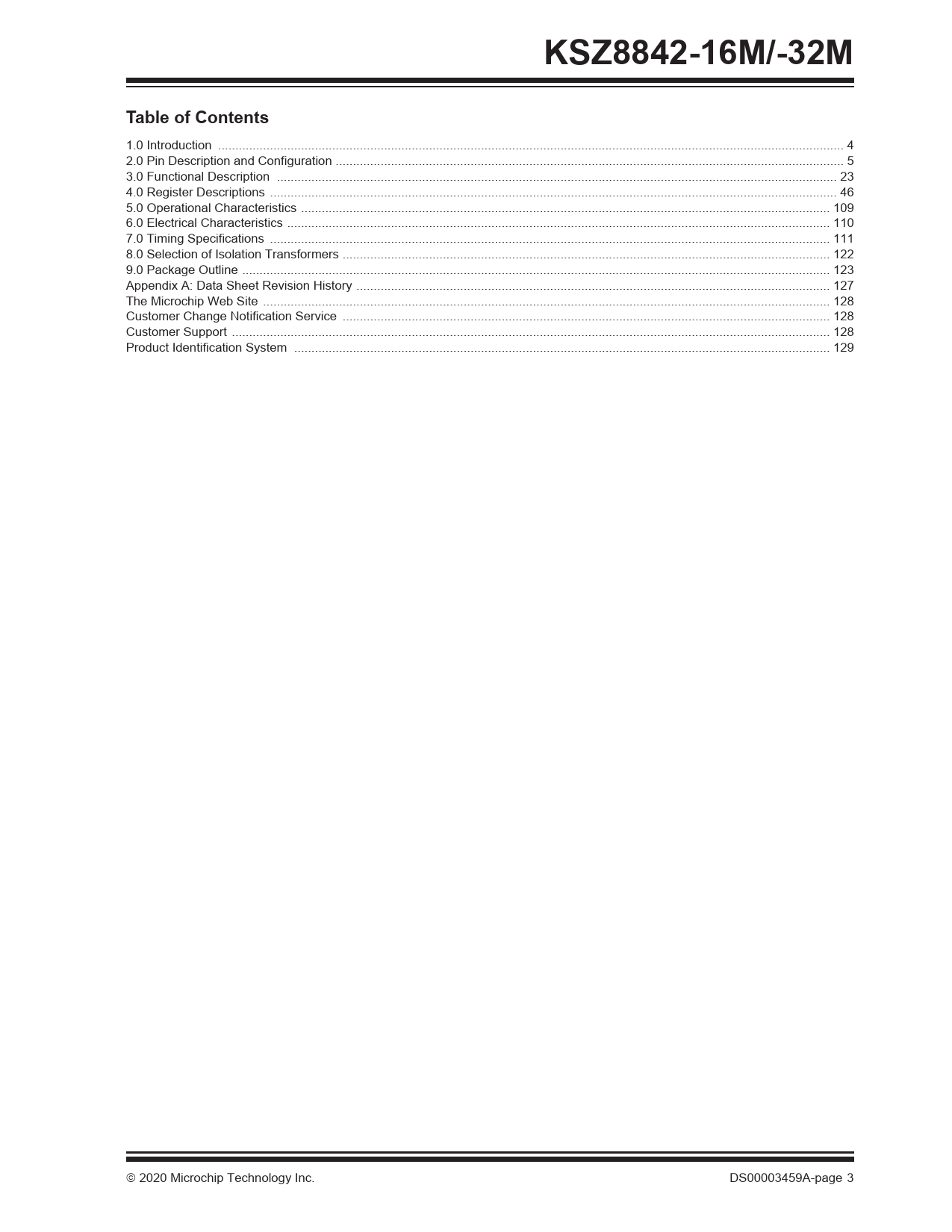 link to page 4 link to page 5 link to page 23 link to page 46 link to page 109 link to page 110 link to page 111 link to page 122 link to page 123 link to page 127 link to page 128 link to page 128 link to page 128 link to page 129 KSZ8842-16M/-32MTable of Contents 1.0 Introduction ... 4 2.0 Pin Description and Configuration ... 5 3.0 Functional Description .. 23 4.0 Register Descriptions .. 46 5.0 Operational Characteristics ... 109 6.0 Electrical Characteristics ... 110 7.0 Timing Specifications .. 111 8.0 Selection of Isolation Transformers ... 122 9.0 Package Outline .. 123 Appendix A: Data Sheet Revision History ... 127 The Microchip Web Site .. 128 Customer Change Notification Service ... 128 Customer Support ... 128 Product Identification System ... 129 2020 Microchip Technology Inc. DS00003459A-page 3 Document Outline 1.0 Introduction 1.1 General Description 2.0 Pin Description and Configuration 3.0 Functional Description 3.1 Functional Overview: Physical Layer Transceiver 3.2 Functional Overview: MAC and Switch 3.3 Bus Interface Unit (BIU) 3.4 Queue Management Unit (QMU) 3.5 Advanced Switch Functions 3.6 IEEE 802.1Q VLAN Support 3.7 QoS Priority Support 3.8 Rate-Limiting Support 3.9 Loopback Support 4.0 Register Descriptions 4.1 CPU Interface I/O Registers 4.2 Register Map: MAC and PHY 4.3 Type-of-Service (TOS) Priority Control Registers 4.4 Management Information Base (MIB) Counters 4.5 Static MAC Address Table 4.6 Dynamic MAC Address Table 4.7 VLAN Table 5.0 Operational Characteristics 5.1 Absolute Maximum Ratings* 5.2 Operating Ratings** 6.0 Electrical Characteristics 7.0 Timing Specifications 7.1 Asynchronous Timing without using Address Strobe (ADSN = 0) 7.2 Asynchronous Timing using Address Strobe (ADSN) 7.3 Asynchronous Timing using DATACSN (KSZ8842-32MQL/MVL Only) 7.4 Address Latching Timing for All Modes 7.5 Synchronous Timing in Burst Write (VLBUSN = 1) 7.6 Synchronous Timing in Burst Read (VLBUSN = 1) 7.7 Synchronous Write Timing (VLBUSN = 0) 7.8 Synchronous Read Timing (VLBUSN = 0) 7.9 EEPROM Timing 7.10 Auto-Negotiation Timing 7.11 Reset Timing 8.0 Selection of Isolation Transformers 9.0 Package Outline 9.1 Package Marking Information Appendix A: Data Sheet Revision History The Microchip Website Customer Change Notification Service Customer Support Product Identification System Worldwide Sales and Service