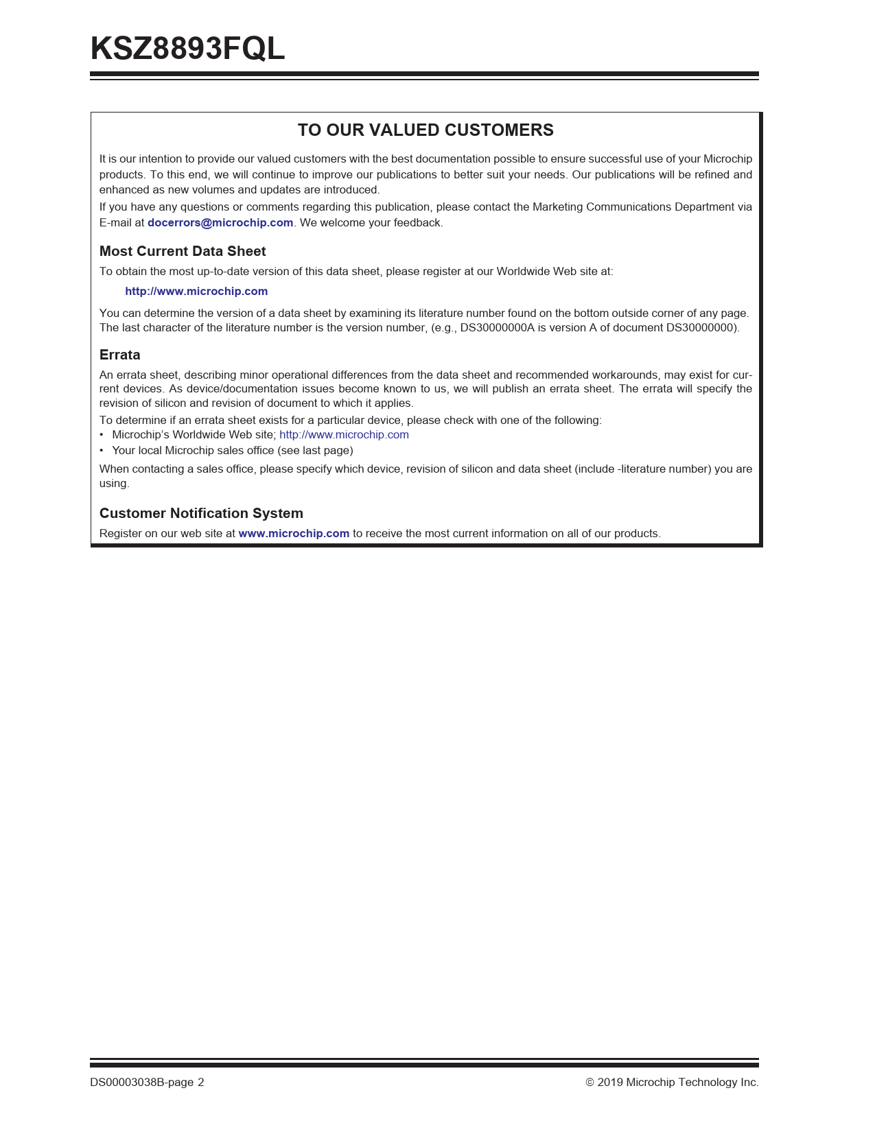 KSZ8893FQLTO OUR VALUED CUSTOMERS It is our intention to provide our valued customers with the best documentation possible to ensure successful use of your Microchip products. To this end, we will continue to improve our publications to better suit your needs. Our publications will be refined and enhanced as new volumes and updates are introduced. If you have any questions or comments regarding this publication, please contact the Marketing Communications Department via E-mail at docerrors@microchip.com . We welcome your feedback. Most Current Data Sheet To obtain the most up-to-date version of this data sheet, please register at our Worldwide Web site at: http://www.microchip.com You can determine the version of a data sheet by examining its literature number found on the bottom outside corner of any page. The last character of the literature number is the version number, (e.g., DS30000000A is version A of document DS30000000). Errata An errata sheet, describing minor operational differences from the data sheet and recommended workarounds, may exist for cur- rent devices. As device/documentation issues become known to us, we will publish an errata sheet. The errata will specify the revision of silicon and revision of document to which it applies. To determine if an errata sheet exists for a particular device, please check with one of the following: • Microchip’s Worldwide Web site; http://www.microchip.com • Your local Microchip sales office (see last page) When contacting a sales office, please specify which device, revision of silicon and data sheet (include -literature number) you are using. Customer Notification System Register on our web site at www.microchip.com to receive the most current information on all of our products. DS00003038B-page 2 2019 Microchip Technology Inc. Document Outline 1.0 Introduction 1.1 General Description 2.0 Pin Description and Configuration 3.0 Functional Description 3.1 Media Conversion 3.2 Physical Layer Transceiver 3.3 MAC and Switch 3.4 Advanced Switch Functions 3.5 Unicast MAC Address Filtering 3.6 Configuration Interface 3.7 Loopback Support 4.0 Register Descriptions 4.1 MII Management (MIIM) Registers 4.2 Register Descriptions 4.3 Register Map: Switch, PHY, TS-1000 Media Converter (8-bit registers) 4.4 Register Descriptions 4.5 Advanced Control Registers (Registers 96-141) 4.6 Static MAC Address Table 4.7 VLAN Table 4.8 Dynamic MAC Address Table 4.9 Management Information Base (MIB) Counters 5.0 Operational Characteristics 5.1 Absolute Maximum Ratings* 5.2 Operating Ratings** 6.0 Electrical Characteristics 7.0 Timing Specifications 7.1 EEPROM Timing 7.2 SNI Timing 7.3 MII Timing 7.4 RMII Timing 7.5 SPI Timing 7.6 Auto-Negotiation Timing 7.7 Reset Timing 8.0 Reset Circuit 9.0 Selection of Isolation Transformers 10.0 Package Outline 10.1 Package Marking Information Appendix A: Data Sheet Revision History The Microchip Web Site Customer Change Notification Service Customer Support Product Identification System Worldwide Sales and Service