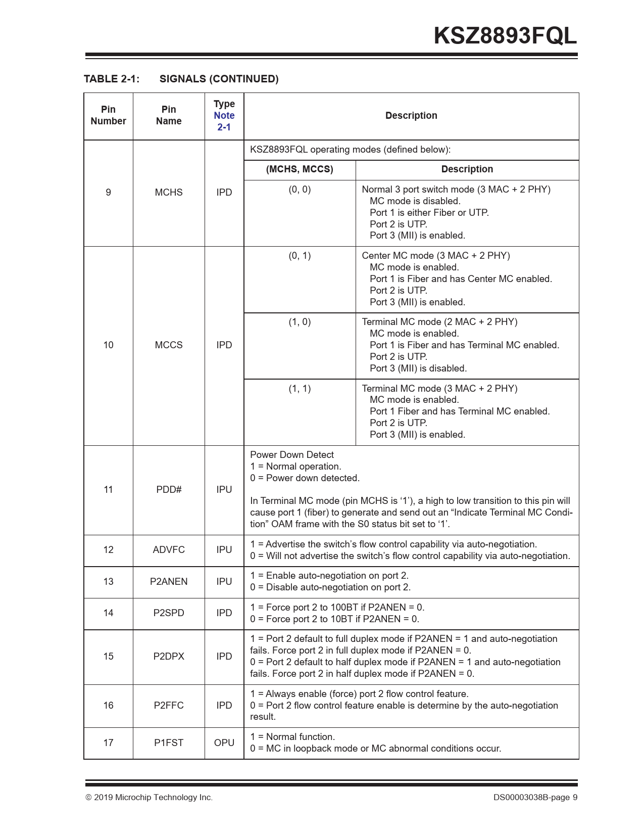Pages / Page109 / 9 — KSZ8893FQL. TABLE 2-1:. SIGNALS (CONTINUED). Type. Pin. Note. …