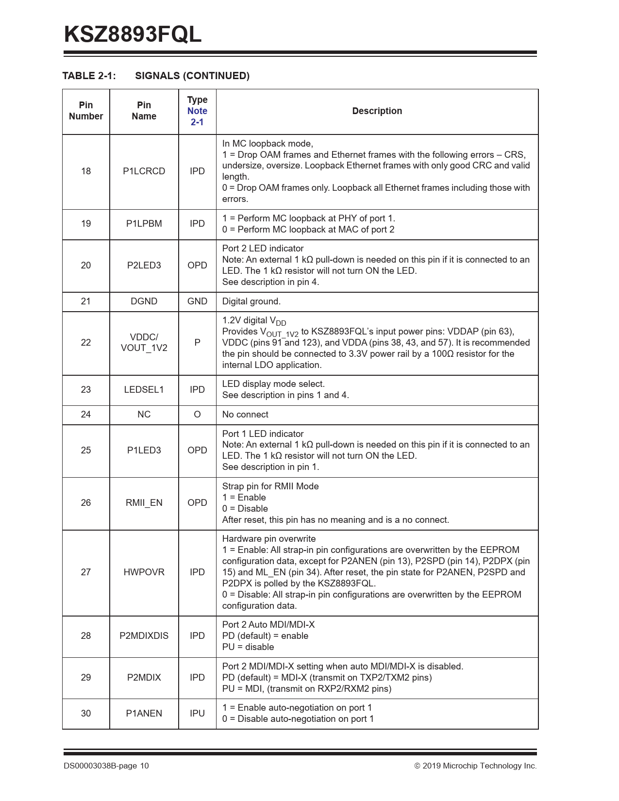 KSZ8893FQLTABLE 2-1:SIGNALS (CONTINUED)TypePinPinNoteDescriptionNumberName2-1 In MC loopback mode, 1 = Drop OAM frames and Ethernet frames with the following errors – CRS, undersize, oversize. Loopback Ethernet frames with only good CRC and valid 18 P1LCRCD IPD length. 0 = Drop OAM frames only. Loopback all Ethernet frames including those with errors. 1 = Perform MC loopback at PHY of port 1. 19 P1LPBM IPD 0 = Perform MC loopback at MAC of port 2 Port 2 LED indicator Note: An external 1 kΩ pull-down is needed on this pin if it is connected to an 20 P2LED3 OPD LED. The 1 kΩ resistor will not turn ON the LED. See description in pin 4. 21 DGND GND Digital ground. 1.2V digital VDD Provides V VDDC/ OUT_1V2 to KSZ8893FQL’s input power pins: VDDAP (pin 63), 22 P VDDC (pins 91 and 123), and VDDA (pins 38, 43, and 57). It is recommended VOUT_1V2 the pin should be connected to 3.3V power rail by a 100Ω resistor for the internal LDO application. LED display mode select. 23 LEDSEL1 IPD See description in pins 1 and 4. 24 NC O No connect Port 1 LED indicator Note: An external 1 kΩ pull-down is needed on this pin if it is connected to an 25 P1LED3 OPD LED. The 1 kΩ resistor will not turn ON the LED. See description in pin 1. Strap pin for RMII Mode 1 = Enable 26 RMII_EN OPD 0 = Disable After reset, this pin has no meaning and is a no connect. Hardware pin overwrite 1 = Enable: All strap-in pin configurations are overwritten by the EEPROM configuration data, except for P2ANEN (pin 13), P2SPD (pin 14), P2DPX (pin 27 HWPOVR IPD 15) and ML_EN (pin 34). After reset, the pin state for P2ANEN, P2SPD and P2DPX is polled by the KSZ8893FQL. 0 = Disable: All strap-in pin configurations are overwritten by the EEPROM configuration data. Port 2 Auto MDI/MDI-X 28 P2MDIXDIS IPD PD (default) = enable PU = disable Port 2 MDI/MDI-X setting when auto MDI/MDI-X is disabled. 29 P2MDIX IPD PD (default) = MDI-X (transmit on TXP2/TXM2 pins) PU = MDI, (transmit on RXP2/RXM2 pins) 1 = Enable auto-negotiation on port 1 30 P1ANEN IPU 0 = Disable auto-negotiation on port 1 DS00003038B-page 10 2019 Microchip Technology Inc. Document Outline 1.0 Introduction 1.1 General Description 2.0 Pin Description and Configuration 3.0 Functional Description 3.1 Media Conversion 3.2 Physical Layer Transceiver 3.3 MAC and Switch 3.4 Advanced Switch Functions 3.5 Unicast MAC Address Filtering 3.6 Configuration Interface 3.7 Loopback Support 4.0 Register Descriptions 4.1 MII Management (MIIM) Registers 4.2 Register Descriptions 4.3 Register Map: Switch, PHY, TS-1000 Media Converter (8-bit registers) 4.4 Register Descriptions 4.5 Advanced Control Registers (Registers 96-141) 4.6 Static MAC Address Table 4.7 VLAN Table 4.8 Dynamic MAC Address Table 4.9 Management Information Base (MIB) Counters 5.0 Operational Characteristics 5.1 Absolute Maximum Ratings* 5.2 Operating Ratings** 6.0 Electrical Characteristics 7.0 Timing Specifications 7.1 EEPROM Timing 7.2 SNI Timing 7.3 MII Timing 7.4 RMII Timing 7.5 SPI Timing 7.6 Auto-Negotiation Timing 7.7 Reset Timing 8.0 Reset Circuit 9.0 Selection of Isolation Transformers 10.0 Package Outline 10.1 Package Marking Information Appendix A: Data Sheet Revision History The Microchip Web Site Customer Change Notification Service Customer Support Product Identification System Worldwide Sales and Service