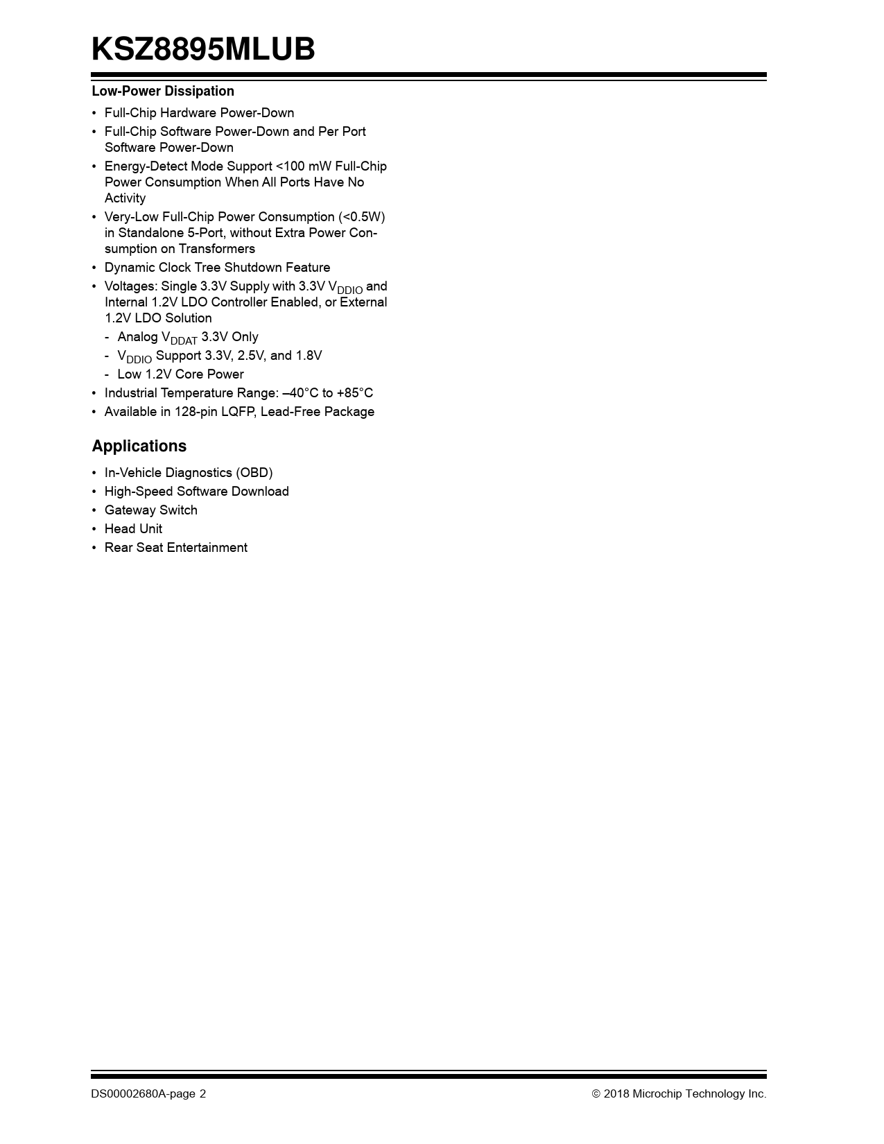 KSZ8895MLUBLow-Power Dissipation • Full-Chip Hardware Power-Down • Full-Chip Software Power-Down and Per Port Software Power-Down • Energy-Detect Mode Support <100 mW Full-Chip Power Consumption When All Ports Have No Activity • Very-Low Full-Chip Power Consumption (<0.5W) in Standalone 5-Port, without Extra Power Con- sumption on Transformers • Dynamic Clock Tree Shutdown Feature • Voltages: Single 3.3V Supply with 3.3V VDDIO and Internal 1.2V LDO Controller Enabled, or External 1.2V LDO Solution - Analog VDDAT 3.3V Only - VDDIO Support 3.3V, 2.5V, and 1.8V - Low 1.2V Core Power • Industrial Temperature Range: –40°C to +85°C • Available in 128-pin LQFP, Lead-Free Package Applications • In-Vehicle Diagnostics (OBD) • High-Speed Software Download • Gateway Switch • Head Unit • Rear Seat Entertainment DS00002680A-page 2 2018 Microchip Technology Inc. Document Outline 1.0 Introduction 1.1 General Description 2.0 Pin Description and Configuration 3.0 Functional Description 3.1 Physical Layer Transceiver 3.2 Power 3.3 Power Management 3.4 Switch Core 3.5 Advanced Functionality 3.6 MII Management (MIIM) Interface 3.7 Serial Management Interface (SMI) 4.0 Register Descriptions 4.1 Global Registers 4.2 Port Registers 4.3 Advanced Control Registers 4.4 Static MAC Address Table 4.5 VLAN Table 4.6 Dynamic MAC Address Table 4.7 Management Information Base (MIB) Counters 4.8 MIIM Registers 5.0 Operational Characteristics 5.1 Absolute Maximum Ratings* 5.2 Operating Ratings*** 6.0 Electrical Characteristics 7.0 Timing Diagrams 7.1 EEPROM Timing 7.2 SNI Timing 7.3 MII Timing 7.4 SPI Timing 7.5 Auto-Negotiation Timing 7.6 Reset Timing 8.0 Reset Circuit 9.0 Selection of Isolation Transformer, (Note 9-1) 10.0 Package Outline Appendix A: Data Sheet Revision History The Microchip Web Site Customer Change Notification Service Customer Support Product Identification System Worldwide Sales and Service