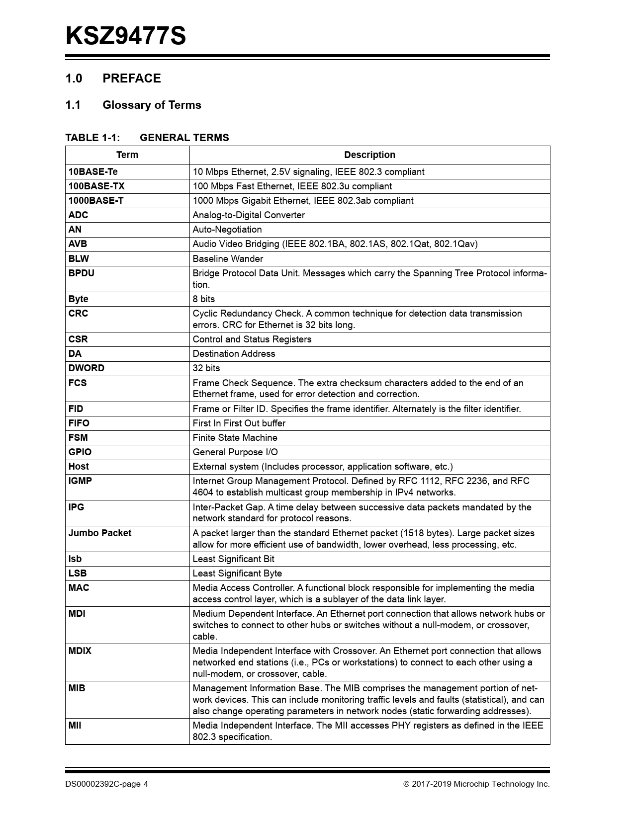 KSZ9477S. 1.0. PREFACE. 1.1. Glossary of Terms. TABLE 1-1:. GENERAL TERMS. Term. Description. 10BASE-Te. 100BASE-TX. 1000BASE-T. ADC. AVB. BLW. BPDU
