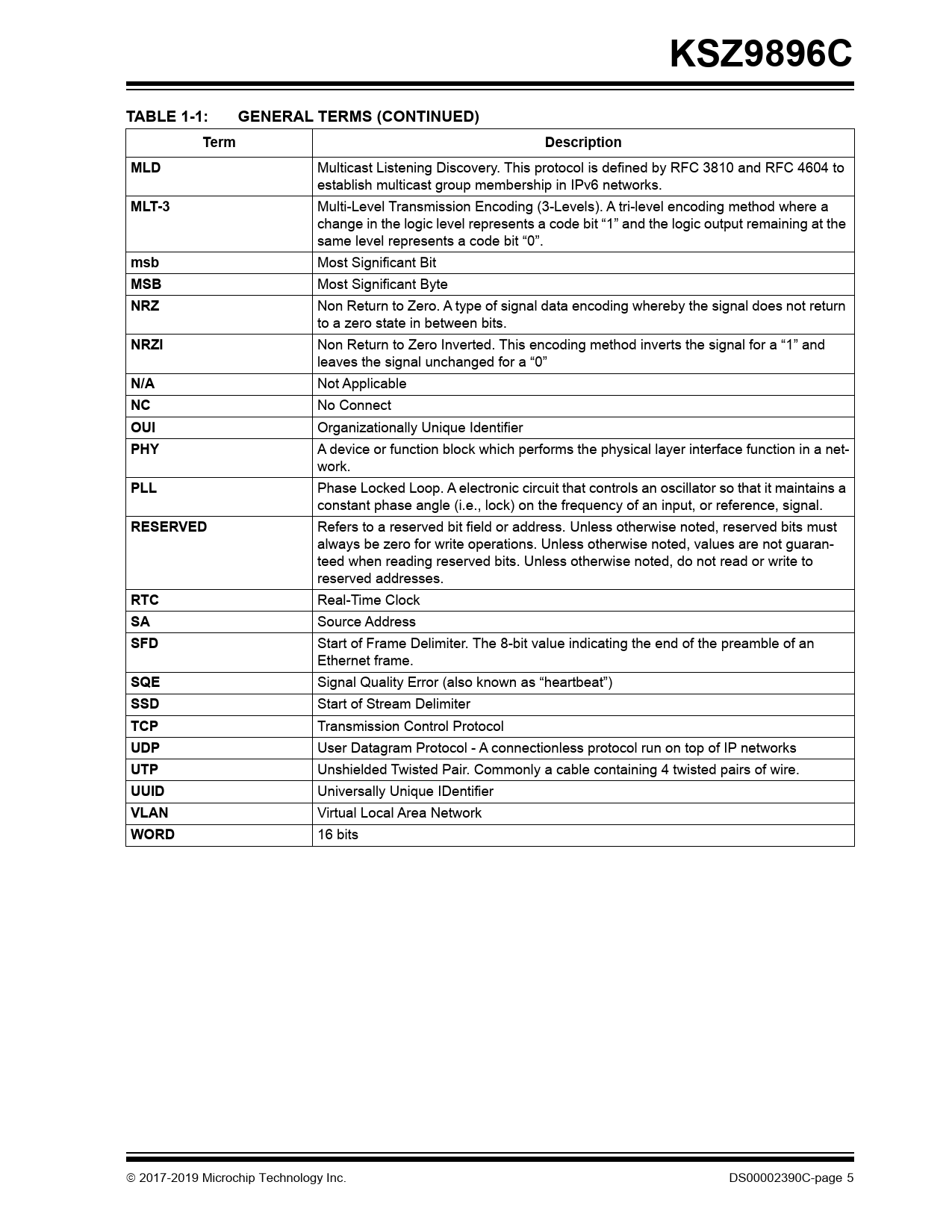 KSZ9896CTABLE 1-1:GENERAL TERMS (CONTINUED)TermDescriptionMLD Multicast Listening Discovery. This protocol is defined by RFC 3810 and RFC 4604 to establish multicast group membership in IPv6 networks. MLT-3 Multi-Level Transmission Encoding (3-Levels). A tri-level encoding method where a change in the logic level represents a code bit “1” and the logic output remaining at the same level represents a code bit “0”. msb Most Significant Bit MSB Most Significant Byte NRZ Non Return to Zero. A type of signal data encoding whereby the signal does not return to a zero state in between bits. NRZI Non Return to Zero Inverted. This encoding method inverts the signal for a “1” and leaves the signal unchanged for a “0” N/A Not Applicable NC No Connect OUI Organizationally Unique Identifier PHY A device or function block which performs the physical layer interface function in a net- work. PLL Phase Locked Loop. A electronic circuit that controls an oscillator so that it maintains a constant phase angle (i.e., lock) on the frequency of an input, or reference, signal. RESERVED Refers to a reserved bit field or address. Unless otherwise noted, reserved bits must always be zero for write operations. Unless otherwise noted, values are not guaran- teed when reading reserved bits. Unless otherwise noted, do not read or write to reserved addresses. RTC Real-Time Clock SA Source Address SFD Start of Frame Delimiter. The 8-bit value indicating the end of the preamble of an Ethernet frame. SQE Signal Quality Error (also known as “heartbeat”) SSD Start of Stream Delimiter TCP Transmission Control Protocol UDP User Datagram Protocol - A connectionless protocol run on top of IP networks UTP Unshielded Twisted Pair. Commonly a cable containing 4 twisted pairs of wire. UUID Universally Unique IDentifier VLAN Virtual Local Area Network WORD 16 bits 2017-2019 Microchip Technology Inc. DS00002390C-page 5 Document Outline 1.0 Preface 1.1 Glossary of Terms TABLE 1-1: General Terms 1.2 Buffer Types TABLE 1-2: Buffer Types 1.3 Register Nomenclature TABLE 1-3: Register Nomenclature 1.4 References 2.0 Introduction 2.1 General Description FIGURE 2-1: Internal Block Diagram 3.0 Pin Descriptions and Configuration 3.1 Pin Assignments FIGURE 3-1: Pin Assignments (Top View) TABLE 3-1: Pin Assignments 3.2 Pin Descriptions TABLE 3-2: Pin Descriptions 3.2.1 Configuration Straps TABLE 3-3: Configuration Strap Descriptions 4.0 Functional Description 4.1 Physical Layer Transceiver (PHY) 4.1.1 1000BASE-T Transceiver 4.1.2 100BASE-TX Transceiver 4.1.3 10BASE-Te Transceiver 4.1.4 Auto MDI/MDI-X TABLE 4-1: MDI/MDI-X Pin Definitions 4.1.5 Pair-Swap, Alignment, and Polarity Check 4.1.6 Wave Shaping, Slew-Rate Control, and Partial Response 4.1.7 Auto-Negotiation FIGURE 4-1: Auto-Negotiation and Parallel Operation 4.1.8 Fast Link-Up 4.1.9 LinkMD® Cable Diagnostics 4.1.10 Remote PHY Loopback FIGURE 4-2: Remote PHY Loopback 4.2 LEDs 4.2.1 Single-LED Mode TABLE 4-2: Single-LED Mode Pin Definition 4.2.2 Tri-Color Dual-LED Mode TABLE 4-3: Tri-Color Dual-LED Mode Pin Definition 4.3 Media Access Controller (MAC) 4.3.1 MAC Operation 4.3.2 Inter-Packet Gap (IPG) 4.3.3 Back-Off Algorithm 4.3.4 Late Collision 4.3.5 Legal Packet Size 4.3.6 Flow Control 4.3.7 Half-Duplex Back Pressure 4.3.8 Flow Control and Back Pressure Registers TABLE 4-4: Flow Control and back Pressure Registers 4.3.9 Broadcast Storm Protection 4.3.10 Self-Address Filtering 4.4 Switch 4.4.1 Switching Engine 4.4.2 Address Lookup TABLE 4-5: Address Lookup Table Hashing Options TABLE 4-6: Reserved Multicast Address Table FIGURE 4-3: Packet Forwarding Process Flowchart TABLE 4-7: Lookup Engine Registers 4.4.3 IEEE 802.1Q VLAN TABLE 4-8: VLAN Forwarding TABLE 4-9: Hashed(DA) + FID Lookup in VLAN Mode TABLE 4-10: Hashed(SA) + FID Lookup in VLAN Mode TABLE 4-11: VLAN Registers 4.4.4 Quality-of-Service (QoS) Priority Support FIGURE 4-4: 802.p Priority Field Format 4.4.5 Traffic Conditioning & Policing 4.4.6 Spanning Tree Support TABLE 4-12: Spanning Tree States 4.4.7 Rapid Spanning Tree Support 4.4.8 Multiple Spanning Tree Support 4.4.9 Tail Tagging Mode FIGURE 4-5: Tail Tag Frame Format TABLE 4-13: Receive Tail Tag Format (from Switch to Host) TABLE 4-14: Transmit Tail Tag Format (from Host to Switch) 4.4.10 IGMP Support 4.4.11 IPv6 MLD Snooping 4.4.12 Port Mirroring 4.4.13 Scheduling and Rate Limiting 4.4.14 Ingress MAC Address Filtering Function 4.4.15 802.1X Access Control 4.4.16 Access Control List (ACL) Filtering TABLE 4-15: ACL Processing Entry Parameters FIGURE 4-6: ACL Structure and Example Rule Values TABLE 4-16: Matching Rule Options TABLE 4-17: ACL Matching Rule Parameters for MD = 01 TABLE 4-18: ACL Matching Rule Parameters for MD = 10 TABLE 4-19: ACL Matching Rule Parameters for MD = 11 TABLE 4-20: ACL Action Rule Parameters for Non-count Modes (MD ≠ 01 or ENB ≠ 00) TABLE 4-21: ACL Action Rule Parameters for count Mode (MD = 01 or ENB = 00) FIGURE 4-7: ACL Table Format TABLE 4-22: ACL Registers 4.5 NAND Tree Support TABLE 4-23: NAND Tree Test Pin Order 4.6 Clocking 4.6.1 Primary Clock 4.6.2 Port 6 RGMII/MII/RMII Clocks 4.6.3 Serial Management Interface Clock 4.6.4 CLKO_25_125 4.7 Power FIGURE 4-8: Power Connection Diagram 4.8 Power Management TABLE 4-24: MDI/MDI-X Pin Definitions 4.8.1 Normal Operation Mode 4.8.2 Energy-Detect Mode 4.8.3 Global Soft Power-Down Mode 4.8.4 Port-Based Power Down 4.8.5 Wake on LAN (WoL) 4.9 Management Interface 4.9.1 SPI Slave Bus TABLE 4-25: Register Access using the SPI Interface FIGURE 4-9: SPI Register Read Operation FIGURE 4-10: SPI Register Write Operation 4.9.2 I2C Bus FIGURE 4-11: Single Byte Register Write FIGURE 4-12: Single Byte Register Read FIGURE 4-13: Burst Register Write FIGURE 4-14: Burst Register Read 4.9.3 MII Management (MIIM) Interface TABLE 4-26: MII Management Interface Frame Format TABLE 4-27: Standard MIIM Registers 4.10 In-Band Management FIGURE 4-15: In-Band Management Frame Format 4.11 MAC Interface 
