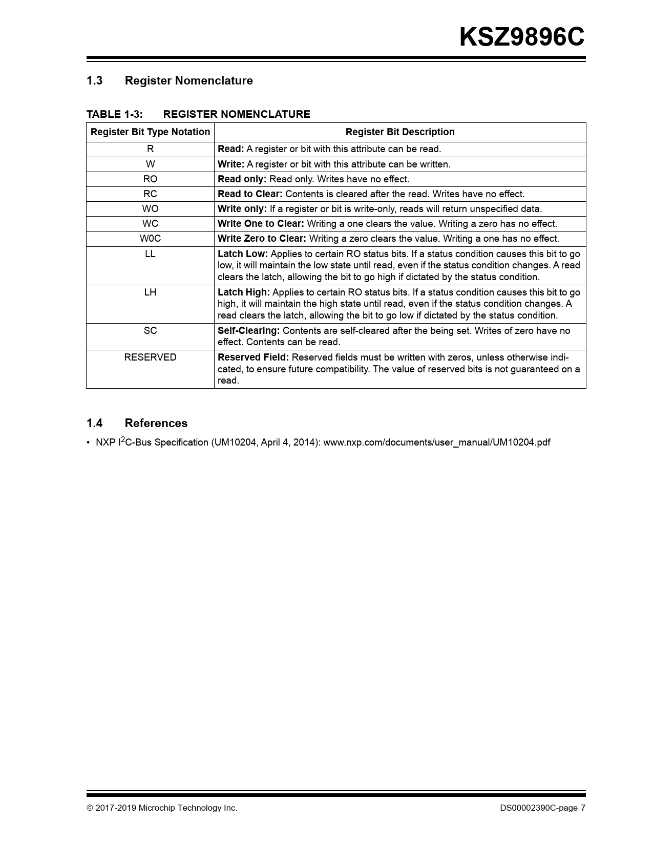 KSZ9896C1.3Register NomenclatureTABLE 1-3:REGISTER NOMENCLATURERegister Bit Type NotationRegister Bit Description R Read: A register or bit with this attribute can be read. W Write: A register or bit with this attribute can be written. RO Read only: Read only. Writes have no effect. RC Read to Clear: Contents is cleared after the read. Writes have no effect. WO Write only: If a register or bit is write-only, reads will return unspecified data. WC Write One to Clear: Writing a one clears the value. Writing a zero has no effect. W0C Write Zero to Clear: Writing a zero clears the value. Writing a one has no effect. LL Latch Low: Applies to certain RO status bits. If a status condition causes this bit to go low, it will maintain the low state until read, even if the status condition changes. A read clears the latch, allowing the bit to go high if dictated by the status condition. LH Latch High: Applies to certain RO status bits. If a status condition causes this bit to go high, it will maintain the high state until read, even if the status condition changes. A read clears the latch, allowing the bit to go low if dictated by the status condition. SC Self-Clearing: Contents are self-cleared after the being set. Writes of zero have no effect. Contents can be read. RESERVED Reserved Field: Reserved fields must be written with zeros, unless otherwise indi- cated, to ensure future compatibility. The value of reserved bits is not guaranteed on a read. 1.4References • NXP I2C-Bus Specification (UM10204, April 4, 2014): www.nxp.com/documents/user_manual/UM10204.pdf 2017-2019 Microchip Technology Inc. DS00002390C-page 7 Document Outline 1.0 Preface 1.1 Glossary of Terms TABLE 1-1: General Terms 1.2 Buffer Types TABLE 1-2: Buffer Types 1.3 Register Nomenclature TABLE 1-3: Register Nomenclature 1.4 References 2.0 Introduction 2.1 General Description FIGURE 2-1: Internal Block Diagram 3.0 Pin Descriptions and Configuration 3.1 Pin Assignments FIGURE 3-1: Pin Assignments (Top View) TABLE 3-1: Pin Assignments 3.2 Pin Descriptions TABLE 3-2: Pin Descriptions 3.2.1 Configuration Straps TABLE 3-3: Configuration Strap Descriptions 4.0 Functional Description 4.1 Physical Layer Transceiver (PHY) 4.1.1 1000BASE-T Transceiver 4.1.2 100BASE-TX Transceiver 4.1.3 10BASE-Te Transceiver 4.1.4 Auto MDI/MDI-X TABLE 4-1: MDI/MDI-X Pin Definitions 4.1.5 Pair-Swap, Alignment, and Polarity Check 4.1.6 Wave Shaping, Slew-Rate Control, and Partial Response 4.1.7 Auto-Negotiation FIGURE 4-1: Auto-Negotiation and Parallel Operation 4.1.8 Fast Link-Up 4.1.9 LinkMD® Cable Diagnostics 4.1.10 Remote PHY Loopback FIGURE 4-2: Remote PHY Loopback 4.2 LEDs 4.2.1 Single-LED Mode TABLE 4-2: Single-LED Mode Pin Definition 4.2.2 Tri-Color Dual-LED Mode TABLE 4-3: Tri-Color Dual-LED Mode Pin Definition 4.3 Media Access Controller (MAC) 4.3.1 MAC Operation 4.3.2 Inter-Packet Gap (IPG) 4.3.3 Back-Off Algorithm 4.3.4 Late Collision 4.3.5 Legal Packet Size 4.3.6 Flow Control 4.3.7 Half-Duplex Back Pressure 4.3.8 Flow Control and Back Pressure Registers TABLE 4-4: Flow Control and back Pressure Registers 4.3.9 Broadcast Storm Protection 4.3.10 Self-Address Filtering 4.4 Switch 4.4.1 Switching Engine 4.4.2 Address Lookup TABLE 4-5: Address Lookup Table Hashing Options TABLE 4-6: Reserved Multicast Address Table FIGURE 4-3: Packet Forwarding Process Flowchart TABLE 4-7: Lookup Engine Registers 4.4.3 IEEE 802.1Q VLAN TABLE 4-8: VLAN Forwarding TABLE 4-9: Hashed(DA) + FID Lookup in VLAN Mode TABLE 4-10: Hashed(SA) + FID Lookup in VLAN Mode TABLE 4-11: VLAN Registers 4.4.4 Quality-of-Service (QoS) Priority Support FIGURE 4-4: 802.p Priority Field Format 4.4.5 Traffic Conditioning & Policing 4.4.6 Spanning Tree Support TABLE 4-12: Spanning Tree States 4.4.7 Rapid Spanning Tree Support 4.4.8 Multiple Spanning Tree Support 4.4.9 Tail Tagging Mode FIGURE 4-5: Tail Tag Frame Format TABLE 4-13: Receive Tail Tag Format (from Switch to Host) TABLE 4-14: Transmit Tail Tag Format (from Host to Switch) 4.4.10 IGMP Support 4.4.11 IPv6 MLD Snooping 4.4.12 Port Mirroring 4.4.13 Scheduling and Rate Limiting 4.4.14 Ingress MAC Address Filtering Function 4.4.15 802.1X Access Control 4.4.16 Access Control List (ACL) Filtering TABLE 4-15: ACL Processing Entry Parameters FIGURE 4-6: ACL Structure and Example Rule Values TABLE 4-16: Matching Rule Options TABLE 4-17: ACL Matching Rule Parameters for MD = 01 TABLE 4-18: ACL Matching Rule Parameters for MD = 10 TABLE 4-19: ACL Matching Rule Parameters for MD = 11 TABLE 4-20: ACL Action Rule Parameters for Non-count Modes (MD ≠ 01 or ENB ≠ 00) TABLE 4-21: ACL Action Rule Parameters for count Mode (MD = 01 or ENB = 00) FIGURE 4-7: ACL Table Format TABLE 4-22: ACL Registers 4.5 NAND Tree Support TABLE 4-23: NAND Tree Test Pin Order 4.6 Clocking 4.6.1 Primary Clock 4.6.2 Port 6 RGMII/MII/RMII Clocks 4.6.3 Serial Management Interface Clock 4.6.4 CLKO_25_125 4.7 Power FIGURE 4-8: Power Connection Diagram 4.8 Power Management TABLE 4-24: MDI/MDI-X Pin Definitions 4.8.1 Normal Operation Mode 4.8.2 Energy-Detect Mode 4.8.3 Global Soft Power-Down Mode 4.8.4 Port-Based Power Down 4.8.5 Wake on LAN (WoL) 4.9 Management Interface 4.9.1 SPI Slave Bus TABLE 4-25: Register Access using the SPI Interface FIGURE 4-9: SPI Register Read Operation FIGURE 4-10: SPI Register Write Operation 4.9.2 I2C Bus FIGURE 4-11: Single Byte Register Write FIGURE 4-12: Single Byte Register Read FIGURE 4-13: Burst Register Write FIGURE 4-14: Burst Register Read 4.9.3 MII Management (MIIM) Interface TABLE 4-26: MII Management Interface Frame Format TABLE 4-27: Standard MIIM Registers 4.10 In-Band Management FIGURE 4-15: In-Band Management Frame Format 4.11 MAC Interface (Port 6) 4.11.1 Media Independent Interface (MII) (Port 6) TABLE 4-28: MII (PHY Mode) Connection to External MAC TABLE 4-29: MII (MAC Mode) Connection to External PHY 4.11.2 Reduced Media Independent Interface (RMII) (Port 6) TABLE 4-30: RMII Signal Descriptions TABLE 4-31: RMII Connection