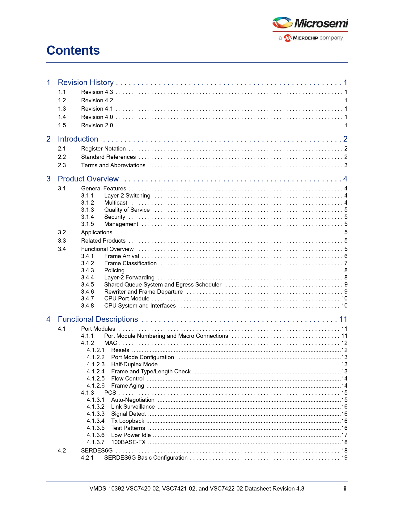 1 Revision History . 1 1.1 Revision 4.3 . 1 1.2 Revision 4.2 . 1 1.3 Revision 4.1 . 1 1.4 Revision 4.0 . 1 1.5 Revision 2.0 . 1 2 Introduction . 2 2.1 Register Notation . 2 2.2 Standard References . 2 2.3 Terms and Abbreviations . 3 3 Product Overview . 4 3.1 General Features . 4 3.1.1 Layer-2 Switching . 4 3.1.2 Multicast . 4 3.1.3 Quality of Service . 5 3.1.4 Security . 5 3.1.5 Management . 5 3.2 Applications . 5 3.3 Related Products . 5 3.4 Functional Overview . 5 3.4.1 Frame Arrival . 6 3.4.2 Frame Classification . 7 3.4.3 Policing . 8 3.4.4 Layer-2 Forwarding . 8 3.4.5 Shared Queue System and Egress Scheduler . 9 3.4.6 Rewriter and Frame Departure . 9 3.4.7 CPU Port Module . 10 3.4.8 CPU System and Interfaces . 10 4 Functional Descriptions . 11 4.1 Port Modules . 11 4.1.1 Port Module Numbering and Macro Connections . 11 4.1.2 MAC . 12 4.1.2.1 Resets ..12 4.1.2.2 Port Mode Configuration ..13 4.1.2.3 Half-Duplex Mode ...13 4.1.2.4 Frame and Type/Length Check ..13 4.1.2.5 Flow Control ...14 4.1.2.6 Frame Aging ...14 4.1.3 PCS . 15 4.1.3.1 Auto-Negotiation .. ..15 4.1.3.2 Link Surveillance ... ..16 4.1.3.3 Signal Detect ..16 4.1.3.4 Tx Loopback ...16 4.1.3.5 Test Patterns ..16 4.1.3.6 Low Power Idle .. ..17 4.1.3.7 100BASE-FX ..18 4.2 SERDES6G . 18 4.2.1 SERDES6G Basic Configuration . 19 VMDS-10392 VSC7420-02, VSC7421-02, and VSC7422-02 Datasheet Revision 4.3 iii Document Outline 1 Revision History 1.1 Revision 4.3 1.2 Revision 4.2 1.3 Revision 4.1 1.4 Revision 4.0 1.5 Revision 2.0 2 Introduction 2.1 Register Notation 2.2 Standard References 2.3 Terms and Abbreviations 3 Product Overview 3.1 General Features 3.1.1 Layer-2 Switching 3.1.2 Multicast 3.1.3 Quality of Service 3.1.4 Security 3.1.5 Management 3.2 Applications 3.3 Related Products 3.4 Functional Overview 3.4.1 Frame Arrival 3.4.2 Frame Classification 3.4.3 Policing 3.4.4 Layer-2 Forwarding 3.4.5 Shared Queue System and Egress Scheduler 3.4.6 Rewriter and Frame Departure 3.4.7 CPU Port Module 3.4.8 CPU System and Interfaces 4 Functional Descriptions 4.1 Port Modules 4.1.1 Port Module Numbering and Macro Connections 4.1.2 MAC 4.1.3 PCS 4.2 SERDES6G 4.2.1 SERDES6G Basic Configuration 4.2.2 SERDES6G Loopback Modes 4.2.3 SERDES6G Deserializer Configuration 4.2.4 SERDES6G Serializer Configuration 4.2.5 SERDES6G Input Buffer Configuration 4.2.6 SERDES6G Output Buffer Configuration 4.2.7 SERDES6G Clock and Data Recovery (CDR) in 100BASE-FX 4.2.8 SERDES6G Energy Efficient Ethernet 4.2.9 SERDES6G Data Inversion 4.2.10 SERDES6G Signal Detection Enhancements 4.2.11 SERDES6G High-Speed I/O Configuration Bus 4.3 Copper Transceivers 4.3.1 Register Access 4.3.2 Cat5 Twisted Pair Media Interface 4.3.3 LED Interface 4.3.4 Ethernet Inline Powered Devices 4.3.5 IEEE 802.3af PoE Support 4.3.6 ActiPHY™ Power Management 4.3.7 Testing Features 4.3.8 VeriPHY™ Cable Diagnostics 4.4 Statistics 4.5 Classifier 4.5.1 General Data Extraction Setup 4.5.2 Frame Acceptance Filtering 4.5.3 QoS and DSCP Classification 4.5.4 VLAN Classification 4.5.5 Link Aggregation Code Generation 4.5.6 CPU Forwarding Determination 4.6 Analyzer 4.6.1 MAC Table 4.6.2 VLAN Table 4.6.3 Forwarding Engine 4.6.4 Analyzer Monitoring 4.7 Policers and Ingress Shapers 4.7.1 Policers 4.7.2 Ingress Shapers 4.8 Shared Queue System 4.8.1 Buffer Management 4.8.2 Frame Reference Management 4.8.3 Resource Depletion Condition 4.8.4 Configuration Example 4.8.5 Watermark Programming and Consumption Monitoring 4.8.6 Advanced Resource Management 4.8.7 Ingress Pause Request Generation 4.8.8 Tail Dropping 4.8.9 Test Utilities 4.8.10 Energy Efficient Ethernet 4.9 Scheduler and Shaper 4.9.1 Egress Shapers 4.9.2 Deficit Weighted Round Robin 4.9.3 Shaping and DWRR Scheduling Examples 4.10 Rewriter 4.10.1 VLAN Editing 4.10.2 DSCP Remarking 4.10.3 FCS Updating 4.10.4 CPU Extraction Header Insertion 4.11 CPU Port Module 4.11.1 Frame Extraction 4.11.2 Frame Injection 4.11.3 Network Processor Interface (NPI) 4.12 Clocking and Reset 5 VCore-Ie System and CPU Interface 5.1 VCore-Ie Configurations 5.2 Clocking and Reset 5.2.1 Watchdog Timer 5.3 Shared Bus 5.3.1 Shared Bus Arbitration 5.3.2 SI Memory Region 5.3.3 Switch Core Registers Memory Region 5.3.4 VCore-Ie Registers Memory Region 5.4 VCore-Ie CPU 5.4.1 Starting the VCore-Ie CPU 5.4.2 Accessing the VCore-Ie Shared Bus 5.4.3 Paged Access to VCore-Ie Shared Bus 5.4.4 Software Debug and Development 5.5 Manual Frame Injection and Extraction 5.5.1 Manual Frame Extraction 5.5.2 Manual Frame Injection 5.5.3 Frame Interrupts 5.6 External CPU Support 5.6.1 Register Access and Multimaster Systems 5.6.2 Serial Interface in Slave Mode 5.6.3 MIIM Interface in Slave Mode 5.6.4 Access to the VCore-Ie Shared Bus 5.6.5 Mailbox and Semaphores 5.7 VCore-Ie System Peripherals 5.7.1 Timers 5.7.2 UART 5.7.3 Two-Wire Serial Interface 5.7.4 MII Management Controller 5.7.5 GPIO Controller 5.7.6 Serial GPIO Controller 5.7.7 FAN Controller 5.7.8 Interrupt Controller 6 Features 6.1 Port Mapping 6.1.1 VSC7420-02 Port Mapping 6.1.2 VSC7421-02 Port Mapping 6.1.3 VSC7422-02 Port Mapping 6.2 Switch Control 6.2.1 Switch Initialization 6.3 Port Module Control 6.3.1 MAC Configuration Port Mode Control 6.3.2 SerDes Configuration Port Mode Control 6.3.3 Port Reset Procedure 6.3.4 Port Counters 6.4 Layer-2 Switch 6.4.1 Basic Switching 6.4.2 Standard VLAN Operation 6.4.3 Provider Bridges and Q-in-Q Operation 6.4.4 Private VLANs 6.4.5 Asymmetric VLANs 6.4.6 Spanning Tree Protocol 6.4.7 IEEE 802.1X: Network Access Control 6.4.8 Link Aggregation 6.4.9 Simple Network Management Protocol (SNMP) 6.4.10 Mirroring 6.5 IGMP and MLD Snooping 6.5.1 IGMP and MLD Snooping Configuration 6.5.2 IP Multicast Forwarding Configuration 6.6 Quality of Service (QoS) 6.6.1 Basic QoS Configuration 6.6.2 IPv4 and IPv6 DSCP Remarking 6.7 CPU Extraction and Injection 6.7.1 Forwarding to CPU 6.7.2 Frame Extraction 6.7.3 Frame Injection 6.7.4 Frame Extraction and Injection Using An External CPU 6.8 Energy Efficient Ethern