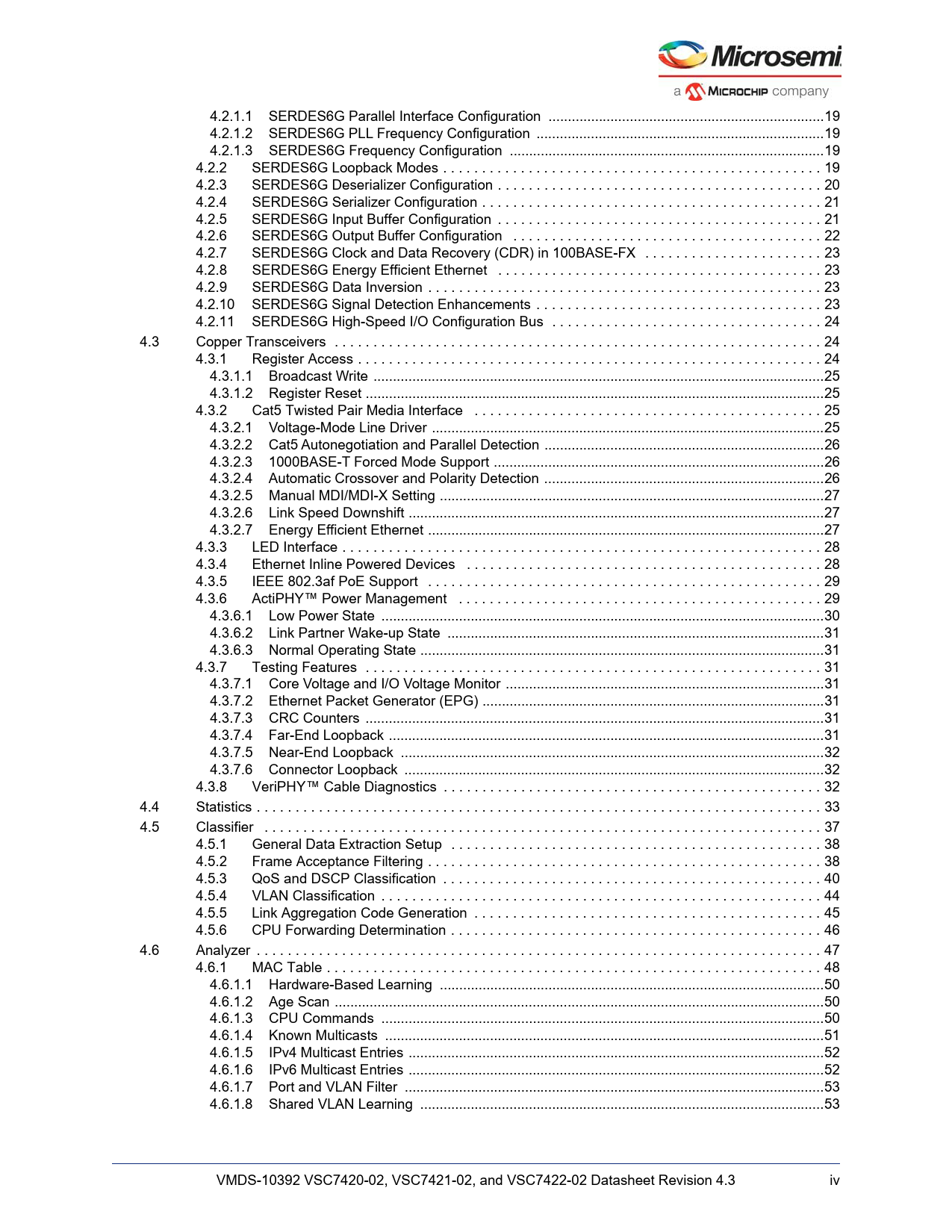 link to page 49 link to page 49 link to page 49 link to page 49 link to page 50 link to page 51 link to page 51 link to page 52 link to page 53 link to page 53 link to page 53 link to page 53 link to page 54 link to page 54 link to page 54 link to page 55 link to page 55 link to page 55 link to page 55 link to page 56 link to page 56 link to page 56 link to page 57 link to page 57 link to page 57 link to page 58 link to page 58 link to page 59 link to page 59 link to page 60 link to page 61 link to page 61 link to page 61 link to page 61 link to page 61 link to page 61 link to page 61 link to page 62 link to page 62 link to page 62 link to page 63 link to page 67 link to page 68 link to page 68 link to page 70 link to page 74 link to page 75 link to page 76 link to page 77 link to page 78 link to page 80 link to page 80 link to page 80 link to page 81 link to page 82 link to page 82 link to page 83 link to page 83 4.2.1.1 SERDES6G Parallel Interface Configuration ...19 4.2.1.2 SERDES6G PLL Frequency Configuration ..19 4.2.1.3 SERDES6G Frequency Configuration ... ...19 4.2.2 SERDES6G Loopback Modes . 19 4.2.3 SERDES6G Deserializer Configuration . 20 4.2.4 SERDES6G Serializer Configuration . 21 4.2.5 SERDES6G Input Buffer Configuration . 21 4.2.6 SERDES6G Output Buffer Configuration . 22 4.2.7 SERDES6G Clock and Data Recovery (CDR) in 100BASE-FX . 23 4.2.8 SERDES6G Energy Efficient Ethernet . 23 4.2.9 SERDES6G Data Inversion . 23 4.2.10 SERDES6G Signal Detection Enhancements . 23 4.2.11 SERDES6G High-Speed I/O Configuration Bus . 24 4.3 Copper Transceivers . 24 4.3.1 Register Access . 24 4.3.1.1 Broadcast Write ... ..25 4.3.1.2 Register Reset ..25 4.3.2 Cat5 Twisted Pair Media Interface . 25 4.3.2.1 Voltage-Mode Line Driver ...25 4.3.2.2 Cat5 Autonegotiation and Parallel Detection ..26 4.3.2.3 1000BASE-T Forced Mode Support ...26 4.3.2.4 Automatic Crossover and Polarity Detection ..26 4.3.2.5 Manual MDI/MDI-X Setting ...27 4.3.2.6 Link Speed Downshift ... ...27 4.3.2.7 Energy Efficient Ethernet .. ...27 4.3.3 LED Interface . 28 4.3.4 Ethernet Inline Powered Devices . 28 4.3.5 IEEE 802.3af PoE Support . 29 4.3.6 ActiPHY™ Power Management . 29 4.3.6.1 Low Power State ..30 4.3.6.2 Link Partner Wake-up State ...31 4.3.6.3 Normal Operating State ..31 4.3.7 Testing Features . 31 4.3.7.1 Core Voltage and I/O Voltage Monitor ..31 4.3.7.2 Ethernet Packet Generator (EPG) ..31 4.3.7.3 CRC Counters ..31 4.3.7.4 Far-End Loopback ..31 4.3.7.5 Near-End Loopback ...32 4.3.7.6 Connector Loopback ..32 4.3.8 VeriPHY™ Cable Diagnostics . 32 4.4 Statistics . 33 4.5 Classifier . 37 4.5.1 General Data Extraction Setup . 38 4.5.2 Frame Acceptance Filtering . 38 4.5.3 QoS and DSCP Classification . 40 4.5.4 VLAN Classification . 44 4.5.5 Link Aggregation Code Generation . 45 4.5.6 CPU Forwarding Determination . 46 4.6 Analyzer . 47 4.6.1 MAC Table . 48 4.6.1.1 Hardware-Based Learning ...50 4.6.1.2 Age Scan ..50 4.6.1.3 CPU Commands ..50 4.6.1.4 Known Multicasts ...51 4.6.1.5 IPv4 Multicast Entries ...52 4.6.1.6 IPv6 Multicast Entries ...52 4.6.1.7 Port and VLAN Filter ..53 4.6.1.8 Shared VLAN Learning ..53 VMDS-10392 VSC7420-02, VSC7421-02, and VSC7422-02 Datasheet Revision 4.3 iv Document Outline 1 Revision History 1.1 Revision 4.3 1.2 Revision 4.2 1.3 Revision 4.1 1.4 Revision 4.0 1.5 Revision 2.0 2 Introduction 2.1 Register Notation 2.2 Standard References 2.3 Terms and Abbreviations 3 Product Overview 3.1 General Features 3.1.1 Layer-2 Switching 3.1.2 Multicast 3.1.3 Quality of Service 3.1.4 Security 3.1.5 Management 3.2 Applications 3.3 Related Products 3.4 Functional Overview 3.4.1 Frame Arrival 3.4.2 Frame Classification 3.4.3 Policing 3.4.4 Layer-2 Forwarding 3.4.5 Shared Queue System and Egress Scheduler 3.4.6 Rewriter and Frame Departure 3.4.7 CPU Port Module 3.4.8 CPU System and Interfaces 4 Functional Descriptions 4.1 Port Modules 4.1.1 Port Module Numbering and Macro Connections 4.1.2 MAC 4.1.3 PCS 4.2 SERDES6G 4.2.1 SERDES6G Basic Configuration 4.2.2 SERDES6G Loopback Modes 4.2.3 SERDES6G Deserializer Configuration 4.2.4 SERDES6G Serializer Configuration 4.2.5 SERDES6G Input Buffer Configuration 4.2.6 SERDES6G Output Buffer Configuration 4.2.7 SERDES6G Clock and Data Recovery (CDR) in 100BASE-FX 4.2.8 SERDES6G Energy Efficient Ethernet 4.2.9 SERDES6G Data Inversion 4.2.10 SERDES6G Signal Detection Enhancements 4.2.11 SERDES6G High-Speed I/O Configuration Bus 4.3 Copper Transceivers 4.3.1 Register Access 4.3.2 Cat5 Twisted Pair Media Interface 4.3.3 LED Interface 4.3.4 Ethernet Inline Powered Devices 4.3.5 IEEE 802.3af PoE Support 4.3.6 ActiPHY™ Power Management 4.3.7 Testing Features 4.3.8 VeriPHY™ Cable Diagnostics 4.4 Statistics 4.5 Classifier 4.5.1 General Data Extraction Setup 4.5.2 Frame Acceptance Filtering 4.5.3 QoS and DSCP Classification 4.5.4 VLAN Classification 4.5.5 Link Aggregation Code Generation 4.5.6 CPU Forwarding Determination 4.6 Analyzer 4.6.1 MAC Table 4.6.2 VLAN Table 4.6.3 Forwarding Engine 4.6.4 Analyzer Monitoring 4.7 Policers and Ingress Shapers 4.7.1 Policers 4.7.2 Ingress Shapers 4.8 Shared Queue System 4.8.1 Buffer Management 4.8.2 Frame Reference Management 4.8.3 Resource Depletion Condition 4.8.4 Configuration Example 4.8.5 Watermark Programming and Consumption Monitoring 4.8.6 Advanced Resource Management 4.8.7 Ingress Pause Request Generation 4.8.8 Tail Dropping 4.8.9 Test Utilities 4.8.10 Energy Efficient Ethernet 4.9 Scheduler and Shaper 4.9.1 Egress Shapers 4.9.2 Deficit Weighted Round Robin 4.9.3 Shaping and DWRR Scheduling Examples 4.10 Rewriter 4.10.1 VLAN Editing 4.10.2 DSCP Remarking 4.10.3 FCS Updating 4.10.4 CPU Extraction Header Insertion 4.11 CPU Port Module 4.11.1 Frame Extraction 4.11.2 Frame Injection 4.11.3 Network Processor Interface (NPI) 4.12 Clocking and Reset 5 VCore-Ie System and CPU Interface 5.1 VCore-Ie Configurations 5.2 Clocking and Reset 5.2.1 Watchdog Timer 5.3 Shared Bus 5.3.1 Shared Bus Arbitration 5.3.2 SI Memory Region 5.3.3 Swi