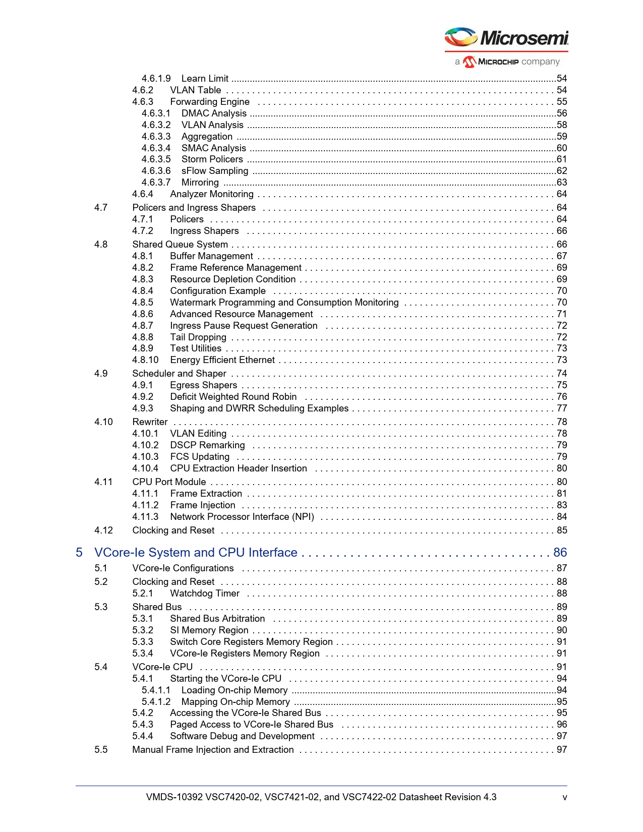 link to page 84 link to page 84 link to page 85 link to page 86 link to page 88 link to page 89 link to page 90 link to page 91 link to page 92 link to page 93 link to page 94 link to page 94 link to page 94 link to page 96 link to page 96 link to page 97 link to page 99 link to page 99 link to page 100 link to page 100 link to page 101 link to page 102 link to page 102 link to page 103 link to page 103 link to page 104 link to page 105 link to page 106 link to page 107 link to page 108 link to page 108 link to page 109 link to page 109 link to page 110 link to page 110 link to page 111 link to page 113 link to page 114 link to page 115 link to page 116 link to page 117 link to page 118 link to page 118 link to page 119 link to page 119 link to page 120 link to page 121 link to page 121 link to page 121 link to page 124 link to page 124 link to page 125 link to page 125 link to page 126 link to page 127 link to page 127 4.6.1.9 Learn Limit ..54 4.6.2 VLAN Table . 54 4.6.3 Forwarding Engine . 55 4.6.3.1 DMAC Analysis ...56 4.6.3.2 VLAN Analysis ... ..58 4.6.3.3 Aggregation ..59 4.6.3.4 SMAC Analysis ...60 4.6.3.5 Storm Policers ..61 4.6.3.6 sFlow Sampling ..62 4.6.3.7 Mirroring ...63 4.6.4 Analyzer Monitoring . 64 4.7 Policers and Ingress Shapers . 64 4.7.1 Policers . 64 4.7.2 Ingress Shapers . 66 4.8 Shared Queue System . 66 4.8.1 Buffer Management . 67 4.8.2 Frame Reference Management . 69 4.8.3 Resource Depletion Condition . 69 4.8.4 Configuration Example . 70 4.8.5 Watermark Programming and Consumption Monitoring . 70 4.8.6 Advanced Resource Management . 71 4.8.7 Ingress Pause Request Generation . 72 4.8.8 Tail Dropping . 72 4.8.9 Test Utilities . 73 4.8.10 Energy Efficient Ethernet . 73 4.9 Scheduler and Shaper . 74 4.9.1 Egress Shapers . 75 4.9.2 Deficit Weighted Round Robin . 76 4.9.3 Shaping and DWRR Scheduling Examples . 77 4.10 Rewriter . 78 4.10.1 VLAN Editing . 78 4.10.2 DSCP Remarking . 79 4.10.3 FCS Updating . 79 4.10.4 CPU Extraction Header Insertion . 80 4.11 CPU Port Module . 80 4.11.1 Frame Extraction . 81 4.11.2 Frame Injection . 83 4.11.3 Network Processor Interface (NPI) . 84 4.12 Clocking and Reset . 85 5 VCore-Ie System and CPU Interface . 86 5.1 VCore-Ie Configurations . 87 5.2 Clocking and Reset . 88 5.2.1 Watchdog Timer . 88 5.3 Shared Bus . 89 5.3.1 Shared Bus Arbitration . 89 5.3.2 SI Memory Region . 90 5.3.3 Switch Core Registers Memory Region . 91 5.3.4 VCore-Ie Registers Memory Region . 91 5.4 VCore-Ie CPU . 91 5.4.1 Starting the VCore-Ie CPU . 94 5.4.1.1 Loading On-chip Memory ...94 5.4.1.2 Mapping On-chip Memory ..95 5.4.2 Accessing the VCore-Ie Shared Bus . 95 5.4.3 Paged Access to VCore-Ie Shared Bus . 96 5.4.4 Software Debug and Development . 97 5.5 Manual Frame Injection and Extraction . 97 VMDS-10392 VSC7420-02, VSC7421-02, and VSC7422-02 Datasheet Revision 4.3 v Document Outline 1 Revision History 1.1 Revision 4.3 1.2 Revision 4.2 1.3 Revision 4.1 1.4 Revision 4.0 1.5 Revision 2.0 2 Introduction 2.1 Register Notation 2.2 Standard References 2.3 Terms and Abbreviations 3 Product Overview 3.1 General Features 3.1.1 Layer-2 Switching 3.1.2 Multicast 3.1.3 Quality of Service 3.1.4 Security 3.1.5 Management 3.2 Applications 3.3 Related Products 3.4 Functional Overview 3.4.1 Frame Arrival 3.4.2 Frame Classification 3.4.3 Policing 3.4.4 Layer-2 Forwarding 3.4.5 Shared Queue System and Egress Scheduler 3.4.6 Rewriter and Frame Departure 3.4.7 CPU Port Module 3.4.8 CPU System and Interfaces 4 Functional Descriptions 4.1 Port Modules 4.1.1 Port Module Numbering and Macro Connections 4.1.2 MAC 4.1.3 PCS 4.2 SERDES6G 4.2.1 SERDES6G Basic Configuration 4.2.2 SERDES6G Loopback Modes 4.2.3 SERDES6G Deserializer Configuration 4.2.4 SERDES6G Serializer Configuration 4.2.5 SERDES6G Input Buffer Configuration 4.2.6 SERDES6G Output Buffer Configuration 4.2.7 SERDES6G Clock and Data Recovery (CDR) in 100BASE-FX 4.2.8 SERDES6G Energy Efficient Ethernet 4.2.9 SERDES6G Data Inversion 4.2.10 SERDES6G Signal Detection Enhancements 4.2.11 SERDES6G High-Speed I/O Configuration Bus 4.3 Copper Transceivers 4.3.1 Register Access 4.3.2 Cat5 Twisted Pair Media Interface 4.3.3 LED Interface 4.3.4 Ethernet Inline Powered Devices 4.3.5 IEEE 802.3af PoE Support 4.3.6 ActiPHY™ Power Management 4.3.7 Testing Features 4.3.8 VeriPHY™ Cable Diagnostics 4.4 Statistics 4.5 Classifier 4.5.1 General Data Extraction Setup 4.5.2 Frame Acceptance Filtering 4.5.3 QoS and DSCP Classification 4.5.4 VLAN Classification 4.5.5 Link Aggregation Code Generation 4.5.6 CPU Forwarding Determination 4.6 Analyzer 4.6.1 MAC Table 4.6.2 VLAN Table 4.6.3 Forwarding Engine 4.6.4 Analyzer Monitoring 4.7 Policers and Ingress Shapers 4.7.1 Policers 4.7.2 Ingress Shapers 4.8 Shared Queue System 4.8.1 Buffer Management 4.8.2 Frame Reference Management 4.8.3 Resource Depletion Condition 4.8.4 Configuration Example 4.8.5 Watermark Programming and Consumption Monitoring 4.8.6 Advanced Resource Management 4.8.7 Ingress Pause Request Generation 4.8.8 Tail Dropping 4.8.9 Test Utilities 4.8.10 Energy Efficient Ethernet 4.9 Scheduler and Shaper 4.9.1 Egress Shapers 4.9.2 Deficit Weighted Round Robin 4.9.3 Shaping and DWRR Scheduling Examples 4.10 Rewriter 4.10.1 VLAN Editing 4.10.2 DSCP Remarking 4.10.3 FCS Updating 4.10.4 CPU Extraction Header Insertion 4.11 CPU Port Module 4.11.1 Frame Extraction 4.11.2 Frame Injection 4.11.3 Network Processor Interface (NPI) 4.12 Clocking and Reset 5 VCore-Ie System and CPU Interface 5.1 VCore-Ie Configurations 5.2 Clocking and Reset 5.2.1 Watchdog Timer 5.3 Shared Bus 5.3.1 Shared Bus Arbitration 5.3.2 SI Memory Region 5.3.3 Switch Core Registers Memory Region 5.3.4 VCore-Ie Registers Memory Region 5.4 VCore-Ie CPU 5.4.1 Starting the VCore-Ie CPU 5.4.2 Accessing the VCore-Ie Shared Bus 5.4.3 Paged Access to VCore-Ie Shared Bus 5.4.4 Software Debug and Development 5.5 Manual Frame Injection and Extraction 5.5.1 Manual Frame Extraction 5.5.2 Manual Frame Injection 5.5.3 Frame Interrupts 5
