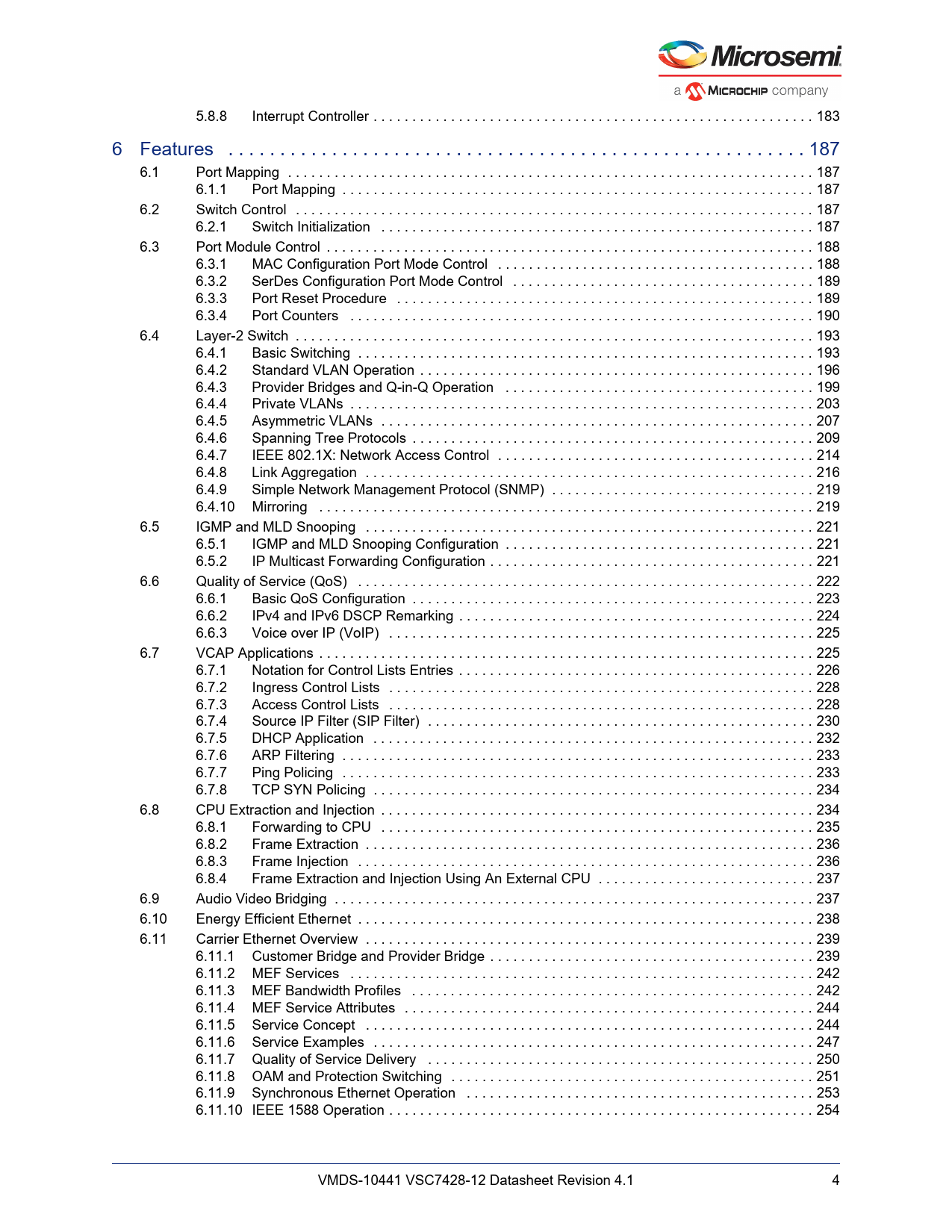 Model Line for this Datasheet Text Version of Document link to page 213 link to page 217 link to page 217 link to page 217 link to page 217 link to page 217 link to page 218 link to page 218 link to page 219 link to page 219 link to page 220 link to page 223 link to page 223 link to page 226 link to page 229 link to page 233 link to page 237 link to page 239 link to page 244 link to page 246 link to page 249 link to page 249 link to page 251 link to page 251 link to page 251 link to page 252 link to page 253 link to page 254 link to page 255 link to page 255 link to page 256 link to page 258 link to page 258 link to page 260 link to page 262 link to page 263 link to page 263 link to page 264 link to page 264 link to page 265 link to page 266 link to page 266 link to page 267 link to page 267 link to page 268 link to page 269 link to page 269 link to page 272 link to page 272 link to page 274 link to page 274 link to page 277 link to page 280 link to page 281 link to page 283 link to page 284 5.8.8 Interrupt Controller . 183 6 Features . 187 6.1 Port Mapping . 187 6.1.1 Port Mapping . 187 6.2 Switch Control . 187 6.2.1 Switch Initialization . 187 6.3 Port Module Control . 188 6.3.1 MAC Configuration Port Mode Control . 188 6.3.2 SerDes Configuration Port Mode Control . 189 6.3.3 Port Reset Procedure . 189 6.3.4 Port Counters . 190 6.4 Layer-2 Switch . 193 6.4.1 Basic Switching . 193 6.4.2 Standard VLAN Operation . 196 6.4.3 Provider Bridges and Q-in-Q Operation . 199 6.4.4 Private VLANs . 203 6.4.5 Asymmetric VLANs . 207 6.4.6 Spanning Tree Protocols . 209 6.4.7 IEEE 802.1X: Network Access Control . 214 6.4.8 Link Aggregation . 216 6.4.9 Simple Network Management Protocol (SNMP) . 219 6.4.10 Mirroring . 219 6.5 IGMP and MLD Snooping . 221 6.5.1 IGMP and MLD Snooping Configuration . 221 6.5.2 IP Multicast Forwarding Configuration . 221 6.6 Quality of Service (QoS) . 222 6.6.1 Basic QoS Configuration . 223 6.6.2 IPv4 and IPv6 DSCP Remarking . 224 6.6.3 Voice over IP (VoIP) . 225 6.7 VCAP Applications . 225 6.7.1 Notation for Control Lists Entries . 226 6.7.2 Ingress Control Lists . 228 6.7.3 Access Control Lists . 228 6.7.4 Source IP Filter (SIP Filter) . 230 6.7.5 DHCP Application . 232 6.7.6 ARP Filtering . 233 6.7.7 Ping Policing . 233 6.7.8 TCP SYN Policing . 234 6.8 CPU Extraction and Injection . 234 6.8.1 Forwarding to CPU . 235 6.8.2 Frame Extraction . 236 6.8.3 Frame Injection . 236 6.8.4 Frame Extraction and Injection Using An External CPU . 237 6.9 Audio Video Bridging . 237 6.10 Energy Efficient Ethernet . 238 6.11 Carrier Ethernet Overview . 239 6.11.1 Customer Bridge and Provider Bridge . 239 6.11.2 MEF Services . 242 6.11.3 MEF Bandwidth Profiles . 242 6.11.4 MEF Service Attributes . 244 6.11.5 Service Concept . 244 6.11.6 Service Examples . 247 6.11.7 Quality of Service Delivery . 250 6.11.8 OAM and Protection Switching . 251 6.11.9 Synchronous Ethernet Operation . 253 6.11.10 IEEE 1588 Operation . 254 VMDS-10441 VSC7428-12 Datasheet Revision 4.1 4 Document Outline 1 Revision History 1.1 Revision 4.1 1.2 Revision 4.0 2 Introduction 2.1 Register Notation 2.2 Standard References 2.3 Terms and Abbreviations 3 Product Overview 3.1 General Features 3.1.1 Layer-2 Switching 3.1.2 Multicast 3.1.3 Carrier Ethernet 3.1.4 Quality of Service 3.1.5 Security 3.1.6 Management 3.2 Applications 3.3 Related Products 3.4 Functional Overview 3.4.1 Frame Arrival 3.4.2 Basic and Advanced Frame Classification 3.4.3 VCAP-II Vitesse Content Aware Processor 3.4.4 Policing 3.4.5 Layer-2 Forwarding 3.4.6 Shared Queue System and Egress Scheduler 3.4.7 Rewriter and Frame Departure 3.4.8 CPU Port Module 3.4.9 Synchronous Ethernet and Precision Time Protocol 3.4.10 CPU System and Interfaces 4 Functional Descriptions 4.1 Port Modules 4.1.1 Port Module Numbering and Macro Connections 4.1.2 MAC 4.1.3 PCS 4.2 SERDES1G 4.2.1 SERDES1G Basic Configuration 4.2.2 SERDES1G Loopback Modes 4.2.3 Synchronous Ethernet 4.2.4 SERDES1G Deserializer Configuration 4.2.5 SERDES1G Serializer Configuration 4.2.6 SERDES1G Input Buffer Configuration 4.2.7 SERDES1G Output Buffer Configuration 4.2.8 SERDES1G Clock and Data Recovery (CDR) in 100BASE-FX 4.2.9 SERDES1G Energy Efficient Ethernet 4.2.10 SERDES1G Data Inversion 4.3 SERDES6G 4.3.1 SERDES6G Basic Configuration 4.3.2 SERDES6G Loopback Modes 4.3.3 Synchronous Ethernet 4.3.4 SERDES6G Deserializer Configuration 4.3.5 SERDES6G Serializer Configuration 4.3.6 SERDES6G Input Buffer Configuration 4.3.7 SERDES6G Output Buffer Configuration 4.3.8 SERDES6G Clock and Data Recovery (CDR) in 100BASE-FX 4.3.9 SERDES6G Energy Efficient Ethernet 4.3.10 SERDES6G Data Inversion 4.3.11 SERDES6G Signal Detection Enhancements 4.3.12 SERDES6G High-Speed I/O Configuration Bus 4.4 Copper Transceivers 4.4.1 Register Access 4.4.2 Cat5 Twisted Pair Media Interface 4.4.3 LED Interface 4.4.4 Ethernet Inline Powered Devices 4.4.5 IEEE 802.3af PoE Support 4.4.6 ActiPHY™ Power Management 4.4.7 Testing Features 4.4.8 VeriPHY Cable Diagnostics 4.5 Statistics 4.6 Classifier 4.6.1 General Data Extraction Setup 4.6.2 Frame Acceptance Filtering 4.6.3 QoS, DP, and DSCP Classification 4.6.4 VLAN Classification 4.6.5 Link Aggregation Code Generation 4.6.6 CPU Forwarding Determination 4.7 VCAP-II 4.7.1 Port Configuration 4.7.2 VCAP IS1 4.7.3 VCAP IS2 4.7.4 VCAP ES0 4.7.5 Range Checkers 4.7.6 VCAP-II Configuration 4.7.7 Advanced VCAP Operations 4.8 Analyzer 4.8.1 MAC Table 4.8.2 VLAN Table 4.8.3 Forwarding Engine 4.8.4 Analyzer Monitoring 4.9 Policers and Ingress Shapers 4.9.1 Policers 4.9.2 Ingress Shapers 4.10 Shared Queue System 4.10.1 Buffer Management 4.10.2 Frame Reference Management 4.10.3 Resource Depletion Condition 4.10.4 Configuration Example 4.10.5 Watermark Programming and Consumption Monitoring 4.10.6 Advanced Resource Management 4.10.7 Ingress Pause Request Generation 4.10.8 Tail Dropping 4.10.9 Test Utilities 4.10.10 Energy Efficient Ethernet 4.11 Scheduler and Shaper 4.11.1 Egress Shapers 4.11.2 Def