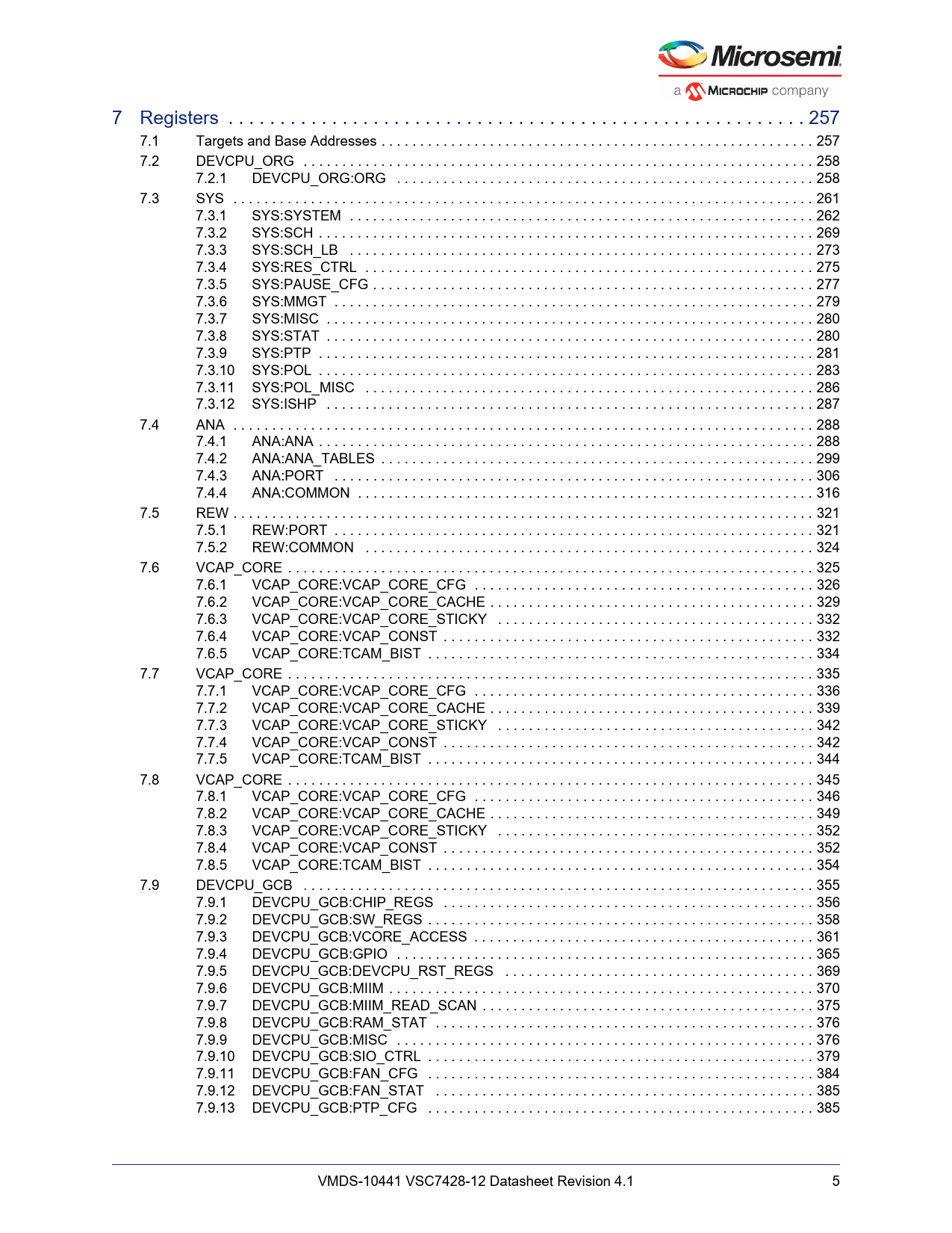 Model Line for this Datasheet Text Version of Document link to page 287 link to page 287 link to page 288 link to page 288 link to page 291 link to page 292 link to page 299 link to page 303 link to page 305 link to page 307 link to page 309 link to page 310 link to page 310 link to page 311 link to page 313 link to page 316 link to page 317 link to page 318 link to page 318 link to page 329 link to page 336 link to page 346 link to page 351 link to page 351 link to page 354 link to page 355 link to page 356 link to page 359 link to page 362 link to page 362 link to page 364 link to page 365 link to page 366 link to page 369 link to page 372 link to page 372 link to page 374 link to page 375 link to page 376 link to page 379 link to page 382 link to page 382 link to page 384 link to page 385 link to page 386 link to page 388 link to page 391 link to page 395 link to page 399 link to page 400 link to page 405 link to page 406 link to page 406 link to page 409 link to page 414 link to page 415 link to page 415 7 Registers . 257 7.1 Targets and Base Addresses . 257 7.2 DEVCPU_ORG . 258 7.2.1 DEVCPU_ORG:ORG . 258 7.3 SYS . 261 7.3.1 SYS:SYSTEM . 262 7.3.2 SYS:SCH . 269 7.3.3 SYS:SCH_LB . 273 7.3.4 SYS:RES_CTRL . 275 7.3.5 SYS:PAUSE_CFG . 277 7.3.6 SYS:MMGT . 279 7.3.7 SYS:MISC . 280 7.3.8 SYS:STAT . 280 7.3.9 SYS:PTP . 281 7.3.10 SYS:POL . 283 7.3.11 SYS:POL_MISC . 286 7.3.12 SYS:ISHP . 287 7.4 ANA . 288 7.4.1 ANA:ANA . 288 7.4.2 ANA:ANA_TABLES . 299 7.4.3 ANA:PORT . 306 7.4.4 ANA:COMMON . 316 7.5 REW . 321 7.5.1 REW:PORT . 321 7.5.2 REW:COMMON . 324 7.6 VCAP_CORE . 325 7.6.1 VCAP_CORE:VCAP_CORE_CFG . 326 7.6.2 VCAP_CORE:VCAP_CORE_CACHE . 329 7.6.3 VCAP_CORE:VCAP_CORE_STICKY . 332 7.6.4 VCAP_CORE:VCAP_CONST . 332 7.6.5 VCAP_CORE:TCAM_BIST . 334 7.7 VCAP_CORE . 335 7.7.1 VCAP_CORE:VCAP_CORE_CFG . 336 7.7.2 VCAP_CORE:VCAP_CORE_CACHE . 339 7.7.3 VCAP_CORE:VCAP_CORE_STICKY . 342 7.7.4 VCAP_CORE:VCAP_CONST . 342 7.7.5 VCAP_CORE:TCAM_BIST . 344 7.8 VCAP_CORE . 345 7.8.1 VCAP_CORE:VCAP_CORE_CFG . 346 7.8.2 VCAP_CORE:VCAP_CORE_CACHE . 349 7.8.3 VCAP_CORE:VCAP_CORE_STICKY . 352 7.8.4 VCAP_CORE:VCAP_CONST . 352 7.8.5 VCAP_CORE:TCAM_BIST . 354 7.9 DEVCPU_GCB . 355 7.9.1 DEVCPU_GCB:CHIP_REGS . 356 7.9.2 DEVCPU_GCB:SW_REGS . 358 7.9.3 DEVCPU_GCB:VCORE_ACCESS . 361 7.9.4 DEVCPU_GCB:GPIO . 365 7.9.5 DEVCPU_GCB:DEVCPU_RST_REGS . 369 7.9.6 DEVCPU_GCB:MIIM . 370 7.9.7 DEVCPU_GCB:MIIM_READ_SCAN . 375 7.9.8 DEVCPU_GCB:RAM_STAT . 376 7.9.9 DEVCPU_GCB:MISC . 376 7.9.10 DEVCPU_GCB:SIO_CTRL . 379 7.9.11 DEVCPU_GCB:FAN_CFG . 384 7.9.12 DEVCPU_GCB:FAN_STAT . 385 7.9.13 DEVCPU_GCB:PTP_CFG . 385 VMDS-10441 VSC7428-12 Datasheet Revision 4.1 5 Document Outline 1 Revision History 1.1 Revision 4.1 1.2 Revision 4.0 2 Introduction 2.1 Register Notation 2.2 Standard References 2.3 Terms and Abbreviations 3 Product Overview 3.1 General Features 3.1.1 Layer-2 Switching 3.1.2 Multicast 3.1.3 Carrier Ethernet 3.1.4 Quality of Service 3.1.5 Security 3.1.6 Management 3.2 Applications 3.3 Related Products 3.4 Functional Overview 3.4.1 Frame Arrival 3.4.2 Basic and Advanced Frame Classification 3.4.3 VCAP-II Vitesse Content Aware Processor 3.4.4 Policing 3.4.5 Layer-2 Forwarding 3.4.6 Shared Queue System and Egress Scheduler 3.4.7 Rewriter and Frame Departure 3.4.8 CPU Port Module 3.4.9 Synchronous Ethernet and Precision Time Protocol 3.4.10 CPU System and Interfaces 4 Functional Descriptions 4.1 Port Modules 4.1.1 Port Module Numbering and Macro Connections 4.1.2 MAC 4.1.3 PCS 4.2 SERDES1G 4.2.1 SERDES1G Basic Configuration 4.2.2 SERDES1G Loopback Modes 4.2.3 Synchronous Ethernet 4.2.4 SERDES1G Deserializer Configuration 4.2.5 SERDES1G Serializer Configuration 4.2.6 SERDES1G Input Buffer Configuration 4.2.7 SERDES1G Output Buffer Configuration 4.2.8 SERDES1G Clock and Data Recovery (CDR) in 100BASE-FX 4.2.9 SERDES1G Energy Efficient Ethernet 4.2.10 SERDES1G Data Inversion 4.3 SERDES6G 4.3.1 SERDES6G Basic Configuration 4.3.2 SERDES6G Loopback Modes 4.3.3 Synchronous Ethernet 4.3.4 SERDES6G Deserializer Configuration 4.3.5 SERDES6G Serializer Configuration 4.3.6 SERDES6G Input Buffer Configuration 4.3.7 SERDES6G Output Buffer Configuration 4.3.8 SERDES6G Clock and Data Recovery (CDR) in 100BASE-FX 4.3.9 SERDES6G Energy Efficient Ethernet 4.3.10 SERDES6G Data Inversion 4.3.11 SERDES6G Signal Detection Enhancements 4.3.12 SERDES6G High-Speed I/O Configuration Bus 4.4 Copper Transceivers 4.4.1 Register Access 4.4.2 Cat5 Twisted Pair Media Interface 4.4.3 LED Interface 4.4.4 Ethernet Inline Powered Devices 4.4.5 IEEE 802.3af PoE Support 4.4.6 ActiPHY™ Power Management 4.4.7 Testing Features 4.4.8 VeriPHY Cable Diagnostics 4.5 Statistics 4.6 Classifier 4.6.1 General Data Extraction Setup 4.6.2 Frame Acceptance Filtering 4.6.3 QoS, DP, and DSCP Classification 4.6.4 VLAN Classification 4.6.5 Link Aggregation Code Generation 4.6.6 CPU Forwarding Determination 4.7 VCAP-II 4.7.1 Port Configuration 4.7.2 VCAP IS1 4.7.3 VCAP IS2 4.7.4 VCAP ES0 4.7.5 Range Checkers 4.7.6 VCAP-II Configuration 4.7.7 Advanced VCAP Operations 4.8 Analyzer 4.8.1 MAC Table 4.8.2 VLAN Table 4.8.3 Forwarding Engine 4.8.4 Analyzer Monitoring 4.9 Policers and Ingress Shapers 4.9.1 Policers 4.9.2 Ingress Shapers 4.10 Shared Queue System 4.10.1 Buffer Management 4.10.2 Frame Reference Management 4.10.3 Resource Depletion Condition 4.10.4 Configuration Example 4.10.5 Watermark Programming and Consumption Monitoring 4.10.6 Advanced Resource Management 4.10.7 Ingress Pause Request Generation 4.10.8 Tail Dropping 4.10.9 Test Utilities 4.10.10 Energy Efficient Ethernet 4.11 Scheduler and Shaper 4.11.1 Egress Shapers 4.11.2 Deficit Weighted Round Robin 4.11.3 Shaping and DWRR Scheduling Examples 4.12 Rewriter 4.12.1 VLAN Editing 4.12.2 DSCP Remarking 4.12.3 FCS Updating 4.12.4 CPU Extraction Header Insertion 4.13 CPU Port Module 4.13.1 Frame Extraction 4.13.2 Frame Injection 4.13.3 Network Processor Interface (NPI) 4.14 Layer-1 Timing 4.15 Hardware Timestamping 4.15.1 Timestamp