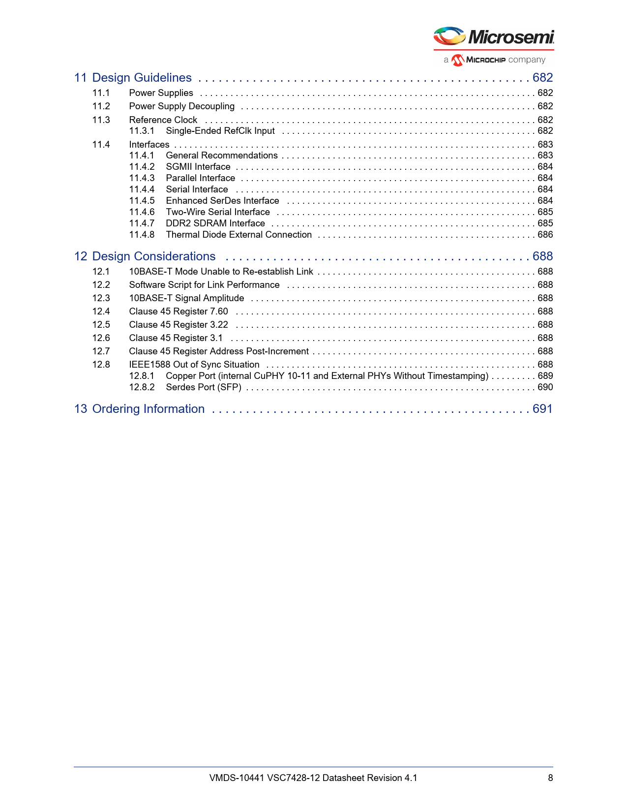 Model Line for this Datasheet Text Version of Document link to page 712 link to page 712 link to page 712 link to page 712 link to page 712 link to page 713 link to page 713 link to page 714 link to page 714 link to page 714 link to page 714 link to page 715 link to page 715 link to page 716 link to page 718 link to page 718 link to page 718 link to page 718 link to page 718 link to page 718 link to page 718 link to page 718 link to page 718 link to page 719 link to page 720 link to page 721 11 Design Guidelines . 682 11.1 Power Supplies . 682 11.2 Power Supply Decoupling . 682 11.3 Reference Clock . 682 11.3.1 Single-Ended RefClk Input . 682 11.4 Interfaces . 683 11.4.1 General Recommendations . 683 11.4.2 SGMII Interface . 684 11.4.3 Parallel Interface . 684 11.4.4 Serial Interface . 684 11.4.5 Enhanced SerDes Interface . 684 11.4.6 Two-Wire Serial Interface . 685 11.4.7 DDR2 SDRAM Interface . 685 11.4.8 Thermal Diode External Connection . 686 12 Design Considerations . 688 12.1 10BASE-T Mode Unable to Re-establish Link . 688 12.2 Software Script for Link Performance . 688 12.3 10BASE-T Signal Amplitude . 688 12.4 Clause 45 Register 7.60 . 688 12.5 Clause 45 Register 3.22 . 688 12.6 Clause 45 Register 3.1 . 688 12.7 Clause 45 Register Address Post-Increment . 688 12.8 IEEE1588 Out of Sync Situation . 688 12.8.1 Copper Port (internal CuPHY 10-11 and External PHYs Without Timestamping) . 689 12.8.2 Serdes Port (SFP) . 690 13 Ordering Information . 691 VMDS-10441 VSC7428-12 Datasheet Revision 4.1 8 Document Outline 1 Revision History 1.1 Revision 4.1 1.2 Revision 4.0 2 Introduction 2.1 Register Notation 2.2 Standard References 2.3 Terms and Abbreviations 3 Product Overview 3.1 General Features 3.1.1 Layer-2 Switching 3.1.2 Multicast 3.1.3 Carrier Ethernet 3.1.4 Quality of Service 3.1.5 Security 3.1.6 Management 3.2 Applications 3.3 Related Products 3.4 Functional Overview 3.4.1 Frame Arrival 3.4.2 Basic and Advanced Frame Classification 3.4.3 VCAP-II Vitesse Content Aware Processor 3.4.4 Policing 3.4.5 Layer-2 Forwarding 3.4.6 Shared Queue System and Egress Scheduler 3.4.7 Rewriter and Frame Departure 3.4.8 CPU Port Module 3.4.9 Synchronous Ethernet and Precision Time Protocol 3.4.10 CPU System and Interfaces 4 Functional Descriptions 4.1 Port Modules 4.1.1 Port Module Numbering and Macro Connections 4.1.2 MAC 4.1.3 PCS 4.2 SERDES1G 4.2.1 SERDES1G Basic Configuration 4.2.2 SERDES1G Loopback Modes 4.2.3 Synchronous Ethernet 4.2.4 SERDES1G Deserializer Configuration 4.2.5 SERDES1G Serializer Configuration 4.2.6 SERDES1G Input Buffer Configuration 4.2.7 SERDES1G Output Buffer Configuration 4.2.8 SERDES1G Clock and Data Recovery (CDR) in 100BASE-FX 4.2.9 SERDES1G Energy Efficient Ethernet 4.2.10 SERDES1G Data Inversion 4.3 SERDES6G 4.3.1 SERDES6G Basic Configuration 4.3.2 SERDES6G Loopback Modes 4.3.3 Synchronous Ethernet 4.3.4 SERDES6G Deserializer Configuration 4.3.5 SERDES6G Serializer Configuration 4.3.6 SERDES6G Input Buffer Configuration 4.3.7 SERDES6G Output Buffer Configuration 4.3.8 SERDES6G Clock and Data Recovery (CDR) in 100BASE-FX 4.3.9 SERDES6G Energy Efficient Ethernet 4.3.10 SERDES6G Data Inversion 4.3.11 SERDES6G Signal Detection Enhancements 4.3.12 SERDES6G High-Speed I/O Configuration Bus 4.4 Copper Transceivers 4.4.1 Register Access 4.4.2 Cat5 Twisted Pair Media Interface 4.4.3 LED Interface 4.4.4 Ethernet Inline Powered Devices 4.4.5 IEEE 802.3af PoE Support 4.4.6 ActiPHY™ Power Management 4.4.7 Testing Features 4.4.8 VeriPHY Cable Diagnostics 4.5 Statistics 4.6 Classifier 4.6.1 General Data Extraction Setup 4.6.2 Frame Acceptance Filtering 4.6.3 QoS, DP, and DSCP Classification 4.6.4 VLAN Classification 4.6.5 Link Aggregation Code Generation 4.6.6 CPU Forwarding Determination 4.7 VCAP-II 4.7.1 Port Configuration 4.7.2 VCAP IS1 4.7.3 VCAP IS2 4.7.4 VCAP ES0 4.7.5 Range Checkers 4.7.6 VCAP-II Configuration 4.7.7 Advanced VCAP Operations 4.8 Analyzer 4.8.1 MAC Table 4.8.2 VLAN Table 4.8.3 Forwarding Engine 4.8.4 Analyzer Monitoring 4.9 Policers and Ingress Shapers 4.9.1 Policers 4.9.2 Ingress Shapers 4.10 Shared Queue System 4.10.1 Buffer Management 4.10.2 Frame Reference Management 4.10.3 Resource Depletion Condition 4.10.4 Configuration Example 4.10.5 Watermark Programming and Consumption Monitoring 4.10.6 Advanced Resource Management 4.10.7 Ingress Pause Request Generation 4.10.8 Tail Dropping 4.10.9 Test Utilities 4.10.10 Energy Efficient Ethernet 4.11 Scheduler and Shaper 4.11.1 Egress Shapers 4.11.2 Deficit Weighted Round Robin 4.11.3 Shaping and DWRR Scheduling Examples 4.12 Rewriter 4.12.1 VLAN Editing 4.12.2 DSCP Remarking 4.12.3 FCS Updating 4.12.4 CPU Extraction Header Insertion 4.13 CPU Port Module 4.13.1 Frame Extraction 4.13.2 Frame Injection 4.13.3 Network Processor Interface (NPI) 4.14 Layer-1 Timing 4.15 Hardware Timestamping 4.15.1 Timestamp Classification 4.15.2 One-Second Timer 4.15.3 Delay Timer 4.15.4 Time of Day Counter 4.16 Clocking and Reset 5 VCore-III System and CPU Interface 5.1 VCore-III Configurations 5.2 Clocking and Reset 5.2.1 Watchdog Timer 5.3 Shared Bus 5.3.1 Shared Bus Arbitration 5.3.2 SI Memory Region 5.3.3 PI Memory Region 5.3.4 Device-Paced Mode 5.3.5 DDR2 Memory Region 5.3.6 Switch Core Registers Memory Region 5.3.7 VCore-III Registers Memory Region 5.4 VCore-III CPU 5.4.1 Big Endian Support 5.4.2 Software Debug and Development 5.5 Manual Frame Injection and Extraction 5.5.1 Manual Frame Extraction 5.5.2 Manual Frame Injection 5.5.3 Frame Interrupts 5.6 Frame DMA 5.6.1 DMA Control Block Structures 5.6.2 Extraction 5.6.3 Injection 5.6.4 Frame DMA Interrupt 5.7 External CPU Support 5.7.1 Register Access and Multimaster Systems 5.7.2 Serial Interface in Slave Mode 5.7.3 Parallel Interface in Slave Mode 5.7.4 MIIM Interface in Slave Mode 5.7.5 Access to the VCore-III Shared Bus 5.7.6 Mailbox and Semaphores 5.8 VCore-III System Peripherals 5.8.1 Timers 5.8.2 UART 5.8.3 Two-Wire Serial Interface 5.8.4 MII Management Controller 5.8.5 GPI
