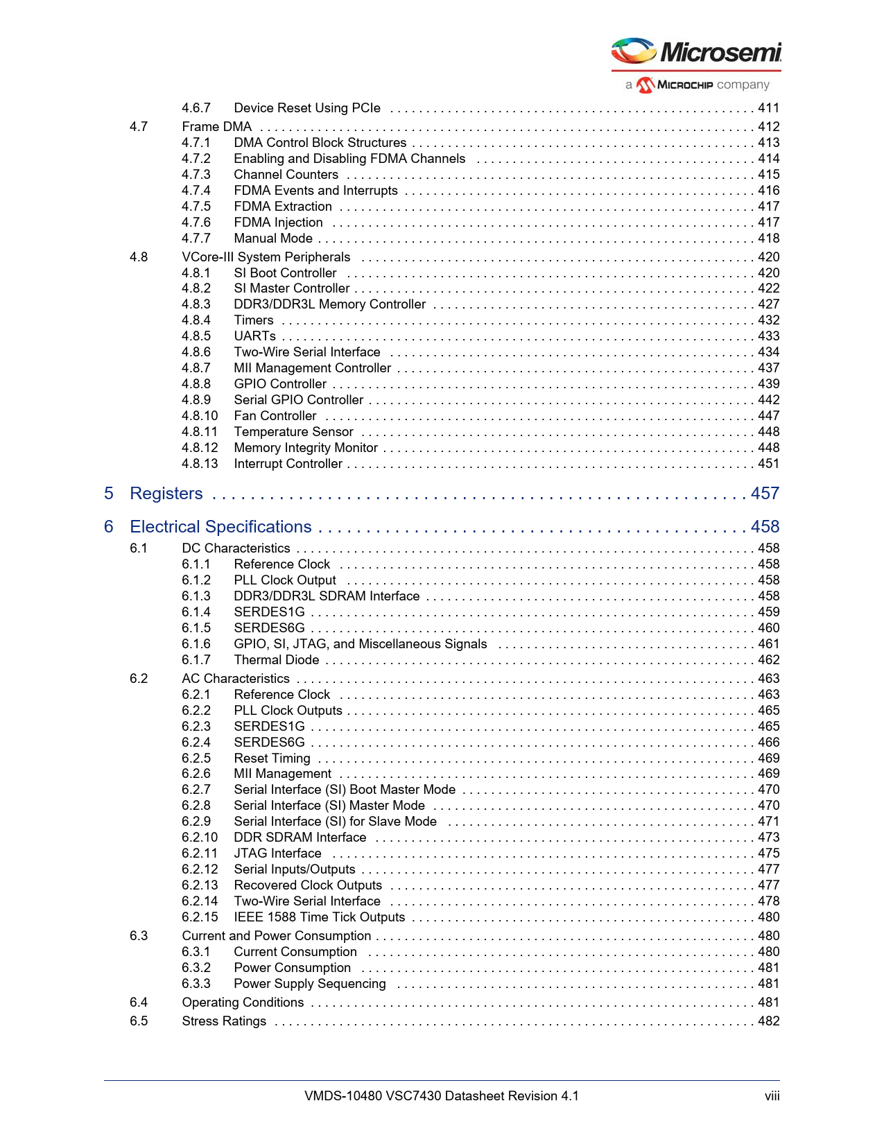 Model Line for this Datasheet Text Version of Document link to page 430 link to page 431 link to page 432 link to page 433 link to page 434 link to page 435 link to page 436 link to page 436 link to page 437 link to page 439 link to page 439 link to page 441 link to page 446 link to page 451 link to page 452 link to page 453 link to page 456 link to page 458 link to page 461 link to page 466 link to page 467 link to page 467 link to page 470 link to page 476 link to page 477 link to page 477 link to page 477 link to page 477 link to page 477 link to page 478 link to page 479 link to page 480 link to page 481 link to page 482 link to page 482 link to page 484 link to page 484 link to page 485 link to page 488 link to page 488 link to page 489 link to page 489 link to page 490 link to page 492 link to page 494 link to page 496 link to page 496 link to page 497 link to page 499 link to page 499 link to page 499 link to page 500 link to page 500 link to page 500 link to page 501 4.6.7 Device Reset Using PCIe . 411 4.7 Frame DMA . 412 4.7.1 DMA Control Block Structures . 413 4.7.2 Enabling and Disabling FDMA Channels . 414 4.7.3 Channel Counters . 415 4.7.4 FDMA Events and Interrupts . 416 4.7.5 FDMA Extraction . 417 4.7.6 FDMA Injection . 417 4.7.7 Manual Mode . 418 4.8 VCore-III System Peripherals . 420 4.8.1 SI Boot Controller . 420 4.8.2 SI Master Controller . 422 4.8.3 DDR3/DDR3L Memory Controller . 427 4.8.4 Timers . 432 4.8.5 UARTs . 433 4.8.6 Two-Wire Serial Interface . 434 4.8.7 MII Management Controller . 437 4.8.8 GPIO Controller . 439 4.8.9 Serial GPIO Controller . 442 4.8.10 Fan Controller . 447 4.8.11 Temperature Sensor . 448 4.8.12 Memory Integrity Monitor . 448 4.8.13 Interrupt Controller . 451 5 Registers . 457 6 Electrical Specifications . 458 6.1 DC Characteristics . 458 6.1.1 Reference Clock . 458 6.1.2 PLL Clock Output . 458 6.1.3 DDR3/DDR3L SDRAM Interface . 458 6.1.4 SERDES1G . 459 6.1.5 SERDES6G . 460 6.1.6 GPIO, SI, JTAG, and Miscellaneous Signals . 461 6.1.7 Thermal Diode . 462 6.2 AC Characteristics . 463 6.2.1 Reference Clock . 463 6.2.2 PLL Clock Outputs . 465 6.2.3 SERDES1G . 465 6.2.4 SERDES6G . 466 6.2.5 Reset Timing . 469 6.2.6 MII Management . 469 6.2.7 Serial Interface (SI) Boot Master Mode . 470 6.2.8 Serial Interface (SI) Master Mode . 470 6.2.9 Serial Interface (SI) for Slave Mode . 471 6.2.10 DDR SDRAM Interface . 473 6.2.11 JTAG Interface . 475 6.2.12 Serial Inputs/Outputs . 477 6.2.13 Recovered Clock Outputs . 477 6.2.14 Two-Wire Serial Interface . 478 6.2.15 IEEE 1588 Time Tick Outputs . 480 6.3 Current and Power Consumption . 480 6.3.1 Current Consumption . 480 6.3.2 Power Consumption . 481 6.3.3 Power Supply Sequencing . 481 6.4 Operating Conditions . 481 6.5 Stress Ratings . 482 VMDS-10480 VSC7430 Datasheet Revision 4.1 vii Document Outline 1 Revision History 1.1 Revision 4.1 1.2 Revision 4.0 2 Product Overview 2.1 General Features 2.1.1 Layer 2 and Layer 3 Forwarding 2.1.2 Carrier Ethernet Support 2.1.3 Timing and Synchronization 2.1.4 Quality of Service (QoS) 2.1.5 Security 2.1.6 Management 2.1.7 Product Parameters 2.2 Applications 2.2.1 Wireless Backhaul 2.2.2 Network Interface Device (NID) 2.2.3 Carrier Ethernet Switch with MPLS-TP 2.2.4 Small Cell Application 3 Functional Descriptions 3.1 Register Notations 3.2 Functional Overview 3.2.1 Frame Arrival in Ports and Port Modules 3.2.2 Basic Classification 3.2.3 Virtualized Service Aware Architecture (ViSAA™) 3.2.4 Security and Control Protocol Classification 3.2.5 Policing 3.2.6 Layer 2 Forwarding 3.2.7 Layer 3 Forwarding 3.2.8 Shared Queue System and Hierarchical Scheduler 3.2.9 Rewriter and Frame Departure 3.2.10 CPU Port Module 3.2.11 Synchronous Ethernet and Precision Time Protocol (PTP) 3.2.12 Ethernet and MPLS OAM 3.2.13 CPU Subsystem 3.3 Frame Headers 3.3.1 Internal Frame Header Placement 3.3.2 Internal Frame Header Layout 3.3.3 VStaX Header 3.4 Port Numbering and Mappings 3.4.1 Supported SerDes Interfaces 3.4.2 Dual-Media Mode 3.4.3 Logical Port Numbers 3.5 SERDES1G 3.6 SERDES6G 3.7 Copper Transceivers 3.7.1 Register Access 3.7.2 Cat5 Twisted Pair Media Interface 3.7.3 Wake-On-LAN and SecureOn 3.7.4 Ethernet Inline Powered Devices 3.7.5 IEEE 802.3af PoE Support 3.7.6 ActiPHY™ Power Management 3.7.7 Testing Features 3.7.8 VeriPHY™ Cable Diagnostics 3.8 DEV1G and DEV2G5 Port Modules 3.8.1 MAC 3.8.2 Half-Duplex Mode 3.8.3 Physical Coding Sublayer (PCS) 3.8.4 Port Statistics 3.9 Assembler 3.9.1 Setting Up a Port in the Assembler 3.9.2 Setting Up a Port for Frame Injection 3.9.3 Setting Up MAC Control Sublayer PAUSE Frame Detection 3.9.4 Setting Up PFC 3.9.5 Setting Up Assembler Port Statistics 3.9.6 Setting Up the Loopback Path 3.10 Versatile Content-Aware Processor (VCAP) 3.10.1 Configuring VCAP 3.10.2 Wide VCAP Entries and Actions 3.10.3 Individual VCAPs 3.10.4 VCAP Programming Examples 3.11 Pipeline Points 3.11.1 Pipeline Definitions 3.12 Analyzer 3.12.1 Initializing the Analyzer 3.13 VCAP CLM Keys and Actions 3.13.1 Keys Overview 3.13.2 VCAP CLM X1 Key Details 3.13.3 VCAP CLM X2 Key Details 3.13.4 VCAP CLM X4 Key Details 3.13.5 VCAP CLM X8 Key Details 3.13.6 VCAP CLM X16 Key Details 3.13.7 VCAP CLM Actions 3.14 Analyzer Classifier 3.14.1 Basic Classifier 3.14.2 VCAP CLM Processing 3.14.3 QoS Mapping Table 3.14.4 Ingress Protection Table (IPT) 3.14.5 Layer 2 Control Protocol Processing 3.14.6 Y.1731 Ethernet MIP 3.14.7 Analyzer Classifier Diagnostics 3.15 VLAN and MSTP 3.15.1 Private VLAN 3.15.2 VLAN Pseudo Code 3.16 VCAP LPM: Keys and Action 3.16.1 VCAP LPM SGL_IP4 Key Details 3.16.2 VCAP LPM DBL_IP4 Key Details 3.16.3 VCAP LPM SGL_IP6 Key Details 3.16.4 VCAP LPM DBL_IP6 Key Details 3.16.5 VCAP LPM Actions 3.17 IP Processing 3.17.1 IP Source/Destination Guard 3.17.2 IP Routing 3.17.3 Statistics 3.17.4 IGMP/MLD Snooping Switch 3.18 VCAP IS2 Keys and Actions 3.18.1 VCAP IS2 Keys 3.18.2 VCAP IS2 Actions 3.19 Analyzer Access Control Lists 3.19.1 VCAP IS2 3.19.2 Analyzer Access Control L