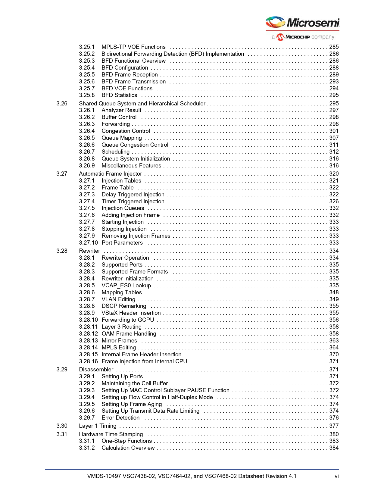 Model Line for this Datasheet Text Version of Document link to page 306 link to page 307 link to page 307 link to page 309 link to page 310 link to page 314 link to page 315 link to page 316 link to page 316 link to page 318 link to page 319 link to page 319 link to page 322 link to page 328 link to page 332 link to page 333 link to page 337 link to page 337 link to page 341 link to page 342 link to page 343 link to page 343 link to page 347 link to page 353 link to page 353 link to page 354 link to page 354 link to page 354 link to page 354 link to page 355 link to page 355 link to page 356 link to page 356 link to page 356 link to page 356 link to page 369 link to page 370 link to page 376 link to page 376 link to page 377 link to page 379 link to page 379 link to page 384 link to page 385 link to page 391 link to page 392 link to page 392 link to page 392 link to page 393 link to page 393 link to page 395 link to page 395 link to page 395 link to page 397 link to page 398 link to page 401 link to page 404 link to page 405 3.25.1 MPLS-TP VOE Functions . 285 3.25.2 Bidirectional Forwarding Detection (BFD) Implementation . 286 3.25.3 BFD Functional Overview . 286 3.25.4 BFD Configuration . 288 3.25.5 BFD Frame Reception . 289 3.25.6 BFD Frame Transmission . 293 3.25.7 BFD VOE Functions . 294 3.25.8 BFD Statistics . 295 3.26 Shared Queue System and Hierarchical Scheduler . 295 3.26.1 Analyzer Result . 297 3.26.2 Buffer Control . 298 3.26.3 Forwarding . 298 3.26.4 Congestion Control . 301 3.26.5 Queue Mapping . 307 3.26.6 Queue Congestion Control . 311 3.26.7 Scheduling . 312 3.26.8 Queue System Initialization . 316 3.26.9 Miscellaneous Features . 316 3.27 Automatic Frame Injector . 320 3.27.1 Injection Tables . 321 3.27.2 Frame Table . 322 3.27.3 Delay Triggered Injection . 322 3.27.4 Timer Triggered Injection . 326 3.27.5 Injection Queues . 332 3.27.6 Adding Injection Frame . 332 3.27.7 Starting Injection . 333 3.27.8 Stopping Injection . 333 3.27.9 Removing Injection Frames . 333 3.27.10 Port Parameters . 333 3.28 Rewriter . 334 3.28.1 Rewriter Operation . 334 3.28.2 Supported Ports . 335 3.28.3 Supported Frame Formats . 335 3.28.4 Rewriter Initialization . 335 3.28.5 VCAP_ES0 Lookup . 335 3.28.6 Mapping Tables . 348 3.28.7 VLAN Editing . 349 3.28.8 DSCP Remarking . 355 3.28.9 VStaX Header Insertion . 355 3.28.10 Forwarding to GCPU . 356 3.28.11 Layer 3 Routing . 358 3.28.12 OAM Frame Handling . 358 3.28.13 Mirror Frames . 363 3.28.14 MPLS Editing . 364 3.28.15 Internal Frame Header Insertion . 370 3.28.16 Frame Injection from Internal CPU . 371 3.29 Disassembler . 371 3.29.1 Setting Up Ports . 371 3.29.2 Maintaining the Cell Buffer . 372 3.29.3 Setting Up MAC Control Sublayer PAUSE Function . 372 3.29.4 Setting up Flow Control in Half-Duplex Mode . 374 3.29.5 Setting Up Frame Aging . 374 3.29.6 Setting Up Transmit Data Rate Limiting . 374 3.29.7 Error Detection . 376 3.30 Layer 1 Timing . 377 3.31 Hardware Time Stamping . 380 3.31.1 One-Step Functions . 383 3.31.2 Calculation Overview . 384 VMDS-10497 VSC7438-02, VSC7464-02, and VSC7468-02 Datasheet Revision 4.1 vi Document Outline 1 Revision History 1.1 Revision 4.1 1.2 Revision 4.0 2 Product Overview 2.1 General Features 2.2 Layer 2 and Layer 3 Forwarding 2.3 Carrier Ethernet Support 2.4 Timing and Synchronization 2.5 Quality of Service 2.6 Security 2.7 Management 2.8 Product Parameters 2.9 Applications 2.9.1 Wireless Backhaul 2.9.2 Network Interface Device (NID) 2.9.3 Carrier Ethernet Switch with MPLS-TP 2.10 Functional Overview 2.10.1 Frame Arrival in Ports and Port Modules 2.10.2 Basic Classification 2.10.3 Virtualized Service Aware Architecture (ViSAA™) 2.10.4 Security and Control Protocol Classification 2.10.5 Policing 2.10.6 Layer 2 Forwarding 2.10.7 Layer 3 Forwarding 2.10.8 Shared Queue System and Hierarchical Scheduler 2.10.9 Rewriter and Frame Departure 2.10.10 CPU Port Module 2.10.11 Synchronous Ethernet and Precision Time Protocol (PTP) 2.10.12 Ethernet and MPLS OAM 3 Functional Descriptions 3.1 Register Notations 3.2 Frame Headers 3.2.1 Internal Frame Header Placement 3.2.2 Internal Frame Header Layout 3.2.3 VStaX Header 3.3 Port Numbering and Mappings 3.3.1 SERDES Macro to I/O Pin Mapping 3.3.2 Supported Port Interfaces 3.3.3 QSGMII 3.3.4 10G Modes 3.3.5 VSC7438-02 Port Numbering and Port Mappings 3.3.6 VSC7464-02 Port Numbering and Port Mappings 3.3.7 VSC7468-02 Port Numbering and Port Mappings 3.3.8 Logical Port Numbers 3.4 SERDES1G 3.5 SERDES6G 3.6 SERDES10G 3.7 DEV1G and DEV2G5 Port Modules 3.7.1 MAC 3.7.2 Half-Duplex Mode 3.7.3 Physical Coding Sublayer (PCS) 3.7.4 Port Statistics 3.8 DEV10G Port Module 3.8.1 MAC 3.8.2 Physical Coding Sublayer (PCS) 3.8.3 Port Statistics 3.9 Assembler 3.9.1 Setting Up a Port in the Assembler 3.9.2 Setting Up a Port for Frame Injection 3.9.3 Setting Up MAC Control Sublayer PAUSE Frame Detection 3.9.4 Setting Up PFC 3.9.5 Setting Up Assembler Port Statistics 3.9.6 Setting Up the Loopback Path 3.10 Versatile Content-Aware Processor (VCAP™) 3.10.1 Configuring VCAP 3.10.2 Wide VCAP Entries and Actions 3.10.3 Individual VCAPs 3.10.4 VCAP Programming Examples 3.11 Pipeline Points 3.11.1 Pipeline Definitions 3.12 Analyzer 3.12.1 Initializing the Analyzer 3.13 VCAP CLM Keys and Actions 3.13.1 Keys Overview 3.13.2 VCAP CLM X1 Key Details 3.13.3 VCAP CLM X2 Key Details 3.13.4 VCAP CLM X4 Key Details 3.13.5 VCAP CLM X8 Key Details 3.13.6 VCAP CLM X16 Key Details 3.13.7 VCAP CLM Actions 3.14 Analyzer Classifier 3.14.1 Basic Classifier 3.14.2 VCAP CLM Processing 3.14.3 QoS Mapping Table 3.14.4 Ingress Protection Table (IPT) 3.14.5 Layer 2 Control Protocol Processing 3.14.6 Y.1731 Ethernet MIP 3.14.7 Analyzer Classifier Diagnostics 3.15 VLAN and MSTP 3.15.1 Private VLAN 3.15.2 VLAN Pseudo Code 3.16 VCAP LPM: Keys and Action 3.16.1 VCAP LPM SGL_IP4 Key Details 3.16.2 VCAP LPM DBL_IP4 Key Details 3.16.3 VCAP LPM SGL_IP6 Key Details 3.16.4 VCAP LPM DBL_IP6 Key Details 3.16.5 VCAP LPM Actions 3.17