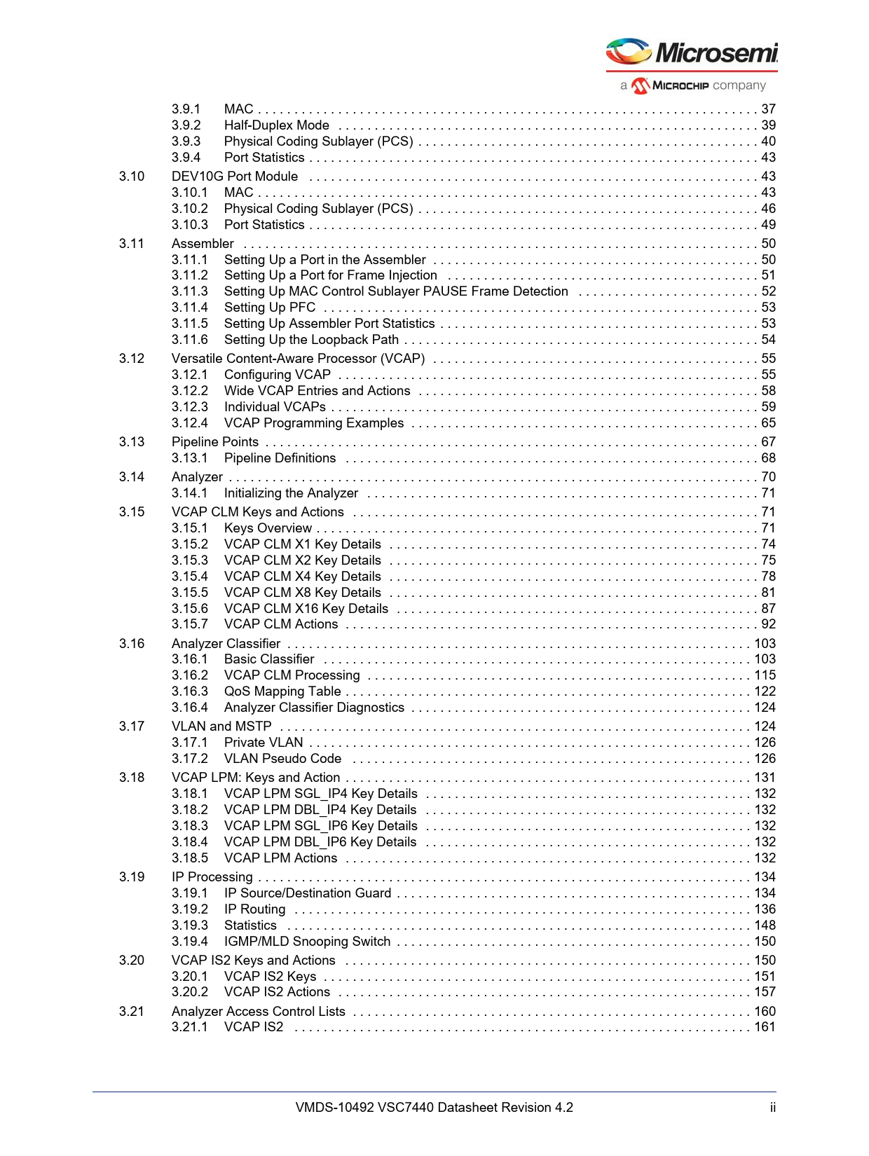 Model Line for this Datasheet Text Version of Document link to page 54 link to page 56 link to page 57 link to page 60 link to page 60 link to page 60 link to page 63 link to page 66 link to page 67 link to page 67 link to page 68 link to page 69 link to page 70 link to page 70 link to page 71 link to page 72 link to page 72 link to page 75 link to page 76 link to page 82 link to page 84 link to page 85 link to page 87 link to page 88 link to page 88 link to page 88 link to page 91 link to page 92 link to page 95 link to page 98 link to page 104 link to page 109 link to page 120 link to page 120 link to page 132 link to page 139 link to page 141 link to page 141 link to page 143 link to page 143 link to page 148 link to page 149 link to page 149 link to page 149 link to page 149 link to page 149 link to page 151 link to page 151 link to page 153 link to page 165 link to page 167 link to page 167 link to page 168 link to page 174 link to page 177 link to page 178 3.9.1 MAC . 37 3.9.2 Half-Duplex Mode . 39 3.9.3 Physical Coding Sublayer (PCS) . 40 3.9.4 Port Statistics . 43 3.10 DEV10G Port Module . 43 3.10.1 MAC . 43 3.10.2 Physical Coding Sublayer (PCS) . 46 3.10.3 Port Statistics . 49 3.11 Assembler . 50 3.11.1 Setting Up a Port in the Assembler . 50 3.11.2 Setting Up a Port for Frame Injection . 51 3.11.3 Setting Up MAC Control Sublayer PAUSE Frame Detection . 52 3.11.4 Setting Up PFC . 53 3.11.5 Setting Up Assembler Port Statistics . 53 3.11.6 Setting Up the Loopback Path . 54 3.12 Versatile Content-Aware Processor (VCAP) . 55 3.12.1 Configuring VCAP . 55 3.12.2 Wide VCAP Entries and Actions . 58 3.12.3 Individual VCAPs . 59 3.12.4 VCAP Programming Examples . 65 3.13 Pipeline Points . 67 3.13.1 Pipeline Definitions . 68 3.14 Analyzer . 70 3.14.1 Initializing the Analyzer . 71 3.15 VCAP CLM Keys and Actions . 71 3.15.1 Keys Overview . 71 3.15.2 VCAP CLM X1 Key Details . 74 3.15.3 VCAP CLM X2 Key Details . 75 3.15.4 VCAP CLM X4 Key Details . 78 3.15.5 VCAP CLM X8 Key Details . 81 3.15.6 VCAP CLM X16 Key Details . 87 3.15.7 VCAP CLM Actions . 92 3.16 Analyzer Classifier . 103 3.16.1 Basic Classifier . 103 3.16.2 VCAP CLM Processing . 115 3.16.3 QoS Mapping Table . 122 3.16.4 Analyzer Classifier Diagnostics . 124 3.17 VLAN and MSTP . 124 3.17.1 Private VLAN . 126 3.17.2 VLAN Pseudo Code . 126 3.18 VCAP LPM: Keys and Action . 131 3.18.1 VCAP LPM SGL_IP4 Key Details . 132 3.18.2 VCAP LPM DBL_IP4 Key Details . 132 3.18.3 VCAP LPM SGL_IP6 Key Details . 132 3.18.4 VCAP LPM DBL_IP6 Key Details . 132 3.18.5 VCAP LPM Actions . 132 3.19 IP Processing . 134 3.19.1 IP Source/Destination Guard . 134 3.19.2 IP Routing . 136 3.19.3 Statistics . 148 3.19.4 IGMP/MLD Snooping Switch . 150 3.20 VCAP IS2 Keys and Actions . 150 3.20.1 VCAP IS2 Keys . 151 3.20.2 VCAP IS2 Actions . 157 3.21 Analyzer Access Control Lists . 160 3.21.1 VCAP IS2 . 161 VMDS-10492 VSC7440 Datasheet Revision 4.2 i Document Outline 1 Revision History 1.1 Revision 4.2 1.2 Revision 4.1 1.3 Revision 4.0 2 Product Overview 2.1 General Features 2.1.1 Layer 2 and Layer 3 Forwarding 2.1.2 Timing and Synchronization 2.1.3 Quality of Service 2.1.4 Security 2.1.5 Management 2.1.6 Product Parameters 2.2 Applications 3 Functional Descriptions 3.1 Register Notations 3.2 Functional Overview 3.2.1 Frame Arrival in Ports and Port Modules 3.2.2 Basic Classification 3.2.3 Security and Control Protocol Classification 3.2.4 Policing 3.2.5 Layer 2 Forwarding 3.2.6 Layer 3 Forwarding 3.2.7 Shared Queue System and Hierarchical Scheduler 3.2.8 Rewriter and Frame Departure 3.2.9 CPU Port Module 3.2.10 Synchronous Ethernet and Precision Time Protocol (PTP) 3.2.11 CPU Subsystem 3.3 Frame Headers 3.3.1 Internal Frame Header Placement 3.3.2 Internal Frame Header Layout 3.3.3 VStaX Header 3.4 Port Numbering and Mappings 3.4.1 Supported SerDes Interfaces 3.4.2 Dual-Media Mode 3.4.3 10G Modes 3.4.4 Logical Port Numbers 3.5 SERDES1G 3.6 SERDES6G 3.7 SERDES10G 3.8 Copper Transceivers 3.8.1 Register Access 3.8.2 Cat5 Twisted Pair Media Interface 3.8.3 Wake-On-LAN and SecureOn 3.8.4 Ethernet Inline Powered Devices 3.8.5 IEEE 802.3af PoE Support 3.8.6 ActiPHY™ Power Management 3.8.7 Testing Features 3.8.8 VeriPHY™ Cable Diagnostics 3.9 DEV1G and DEV2G5 Port Modules 3.9.1 MAC 3.9.2 Half-Duplex Mode 3.9.3 Physical Coding Sublayer (PCS) 3.9.4 Port Statistics 3.10 DEV10G Port Module 3.10.1 MAC 3.10.2 Physical Coding Sublayer (PCS) 3.10.3 Port Statistics 3.11 Assembler 3.11.1 Setting Up a Port in the Assembler 3.11.2 Setting Up a Port for Frame Injection 3.11.3 Setting Up MAC Control Sublayer PAUSE Frame Detection 3.11.4 Setting Up PFC 3.11.5 Setting Up Assembler Port Statistics 3.11.6 Setting Up the Loopback Path 3.12 Versatile Content-Aware Processor (VCAP) 3.12.1 Configuring VCAP 3.12.2 Wide VCAP Entries and Actions 3.12.3 Individual VCAPs 3.12.4 VCAP Programming Examples 3.13 Pipeline Points 3.13.1 Pipeline Definitions 3.14 Analyzer 3.14.1 Initializing the Analyzer 3.15 VCAP CLM Keys and Actions 3.15.1 Keys Overview 3.15.2 VCAP CLM X1 Key Details 3.15.3 VCAP CLM X2 Key Details 3.15.4 VCAP CLM X4 Key Details 3.15.5 VCAP CLM X8 Key Details 3.15.6 VCAP CLM X16 Key Details 3.15.7 VCAP CLM Actions 3.16 Analyzer Classifier 3.16.1 Basic Classifier 3.16.2 VCAP CLM Processing 3.16.3 QoS Mapping Table 3.16.4 Analyzer Classifier Diagnostics 3.17 VLAN and MSTP 3.17.1 Private VLAN 3.17.2 VLAN Pseudo Code 3.18 VCAP LPM: Keys and Action 3.18.1 VCAP LPM SGL_IP4 Key Details 3.18.2 VCAP LPM DBL_IP4 Key Details 3.18.3 VCAP LPM SGL_IP6 Key Details 3.18.4 VCAP LPM DBL_IP6 Key Details 3.18.5 VCAP LPM Actions 3.19 IP Processing 3.19.1 IP Source/Destination Guard 3.19.2 IP Routing 3.19.3 Statistics 3.19.4 IGMP/MLD Snooping Switch 3.20 VCAP IS2 Keys and Actions 3.20.1 VCAP IS2 Keys 3.20.2 VCAP IS2 Actions 3.21 Analyzer Access Control Lists 3.21.1 VCAP IS2 3.21.2 Analyzer Access Control List Frame Rewriting 3.22 Analyzer Layer 2 Forwarding and Learning 3.22.1 Analyzer MAC Table 3.22.2 MAC Tabl