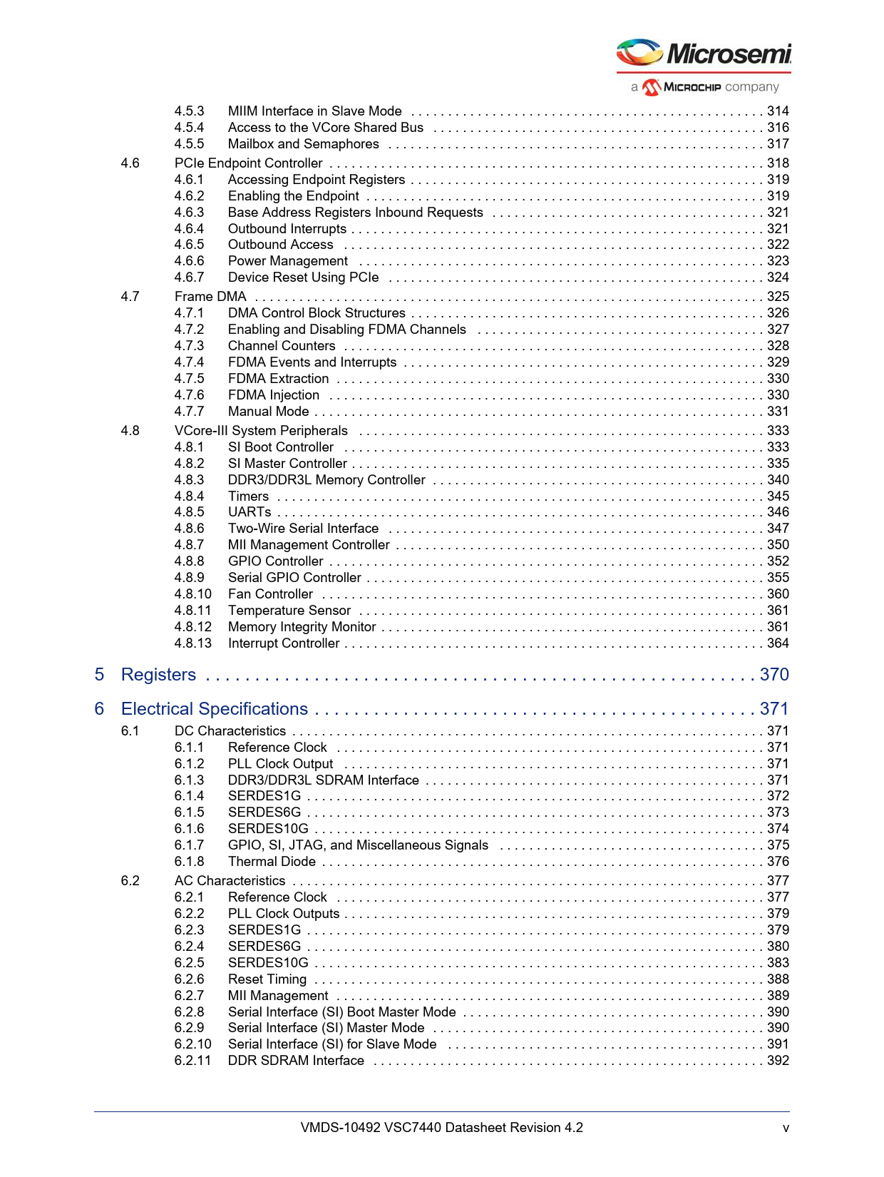 Model Line for this Datasheet Text Version of Document link to page 331 link to page 333 link to page 334 link to page 335 link to page 336 link to page 336 link to page 338 link to page 338 link to page 339 link to page 340 link to page 341 link to page 342 link to page 343 link to page 344 link to page 345 link to page 346 link to page 347 link to page 347 link to page 348 link to page 350 link to page 350 link to page 352 link to page 357 link to page 362 link to page 363 link to page 364 link to page 367 link to page 369 link to page 372 link to page 377 link to page 378 link to page 378 link to page 381 link to page 387 link to page 388 link to page 388 link to page 388 link to page 388 link to page 388 link to page 389 link to page 390 link to page 391 link to page 392 link to page 393 link to page 394 link to page 394 link to page 396 link to page 396 link to page 397 link to page 400 link to page 405 link to page 406 link to page 407 link to page 407 link to page 408 link to page 409 4.5.3 MIIM Interface in Slave Mode . 314 4.5.4 Access to the VCore Shared Bus . 316 4.5.5 Mailbox and Semaphores . 317 4.6 PCIe Endpoint Controller . 318 4.6.1 Accessing Endpoint Registers . 319 4.6.2 Enabling the Endpoint . 319 4.6.3 Base Address Registers Inbound Requests . 321 4.6.4 Outbound Interrupts . 321 4.6.5 Outbound Access . 322 4.6.6 Power Management . 323 4.6.7 Device Reset Using PCIe . 324 4.7 Frame DMA . 325 4.7.1 DMA Control Block Structures . 326 4.7.2 Enabling and Disabling FDMA Channels . 327 4.7.3 Channel Counters . 328 4.7.4 FDMA Events and Interrupts . 329 4.7.5 FDMA Extraction . 330 4.7.6 FDMA Injection . 330 4.7.7 Manual Mode . 331 4.8 VCore-III System Peripherals . 333 4.8.1 SI Boot Controller . 333 4.8.2 SI Master Controller . 335 4.8.3 DDR3/DDR3L Memory Controller . 340 4.8.4 Timers . 345 4.8.5 UARTs . 346 4.8.6 Two-Wire Serial Interface . 347 4.8.7 MII Management Controller . 350 4.8.8 GPIO Controller . 352 4.8.9 Serial GPIO Controller . 355 4.8.10 Fan Controller . 360 4.8.11 Temperature Sensor . 361 4.8.12 Memory Integrity Monitor . 361 4.8.13 Interrupt Controller . 364 5 Registers . 370 6 Electrical Specifications . 371 6.1 DC Characteristics . 371 6.1.1 Reference Clock . 371 6.1.2 PLL Clock Output . 371 6.1.3 DDR3/DDR3L SDRAM Interface . 371 6.1.4 SERDES1G . 372 6.1.5 SERDES6G . 373 6.1.6 SERDES10G . 374 6.1.7 GPIO, SI, JTAG, and Miscellaneous Signals . 375 6.1.8 Thermal Diode . 376 6.2 AC Characteristics . 377 6.2.1 Reference Clock . 377 6.2.2 PLL Clock Outputs . 379 6.2.3 SERDES1G . 379 6.2.4 SERDES6G . 380 6.2.5 SERDES10G . 383 6.2.6 Reset Timing . 388 6.2.7 MII Management . 389 6.2.8 Serial Interface (SI) Boot Master Mode . 390 6.2.9 Serial Interface (SI) Master Mode . 390 6.2.10 Serial Interface (SI) for Slave Mode . 391 6.2.11 DDR SDRAM Interface . 392 VMDS-10492 VSC7440 Datasheet Revision 4.2 v Document Outline 1 Revision History 1.1 Revision 4.2 1.2 Revision 4.1 1.3 Revision 4.0 2 Product Overview 2.1 General Features 2.1.1 Layer 2 and Layer 3 Forwarding 2.1.2 Timing and Synchronization 2.1.3 Quality of Service 2.1.4 Security 2.1.5 Management 2.1.6 Product Parameters 2.2 Applications 3 Functional Descriptions 3.1 Register Notations 3.2 Functional Overview 3.2.1 Frame Arrival in Ports and Port Modules 3.2.2 Basic Classification 3.2.3 Security and Control Protocol Classification 3.2.4 Policing 3.2.5 Layer 2 Forwarding 3.2.6 Layer 3 Forwarding 3.2.7 Shared Queue System and Hierarchical Scheduler 3.2.8 Rewriter and Frame Departure 3.2.9 CPU Port Module 3.2.10 Synchronous Ethernet and Precision Time Protocol (PTP) 3.2.11 CPU Subsystem 3.3 Frame Headers 3.3.1 Internal Frame Header Placement 3.3.2 Internal Frame Header Layout 3.3.3 VStaX Header 3.4 Port Numbering and Mappings 3.4.1 Supported SerDes Interfaces 3.4.2 Dual-Media Mode 3.4.3 10G Modes 3.4.4 Logical Port Numbers 3.5 SERDES1G 3.6 SERDES6G 3.7 SERDES10G 3.8 Copper Transceivers 3.8.1 Register Access 3.8.2 Cat5 Twisted Pair Media Interface 3.8.3 Wake-On-LAN and SecureOn 3.8.4 Ethernet Inline Powered Devices 3.8.5 IEEE 802.3af PoE Support 3.8.6 ActiPHY™ Power Management 3.8.7 Testing Features 3.8.8 VeriPHY™ Cable Diagnostics 3.9 DEV1G and DEV2G5 Port Modules 3.9.1 MAC 3.9.2 Half-Duplex Mode 3.9.3 Physical Coding Sublayer (PCS) 3.9.4 Port Statistics 3.10 DEV10G Port Module 3.10.1 MAC 3.10.2 Physical Coding Sublayer (PCS) 3.10.3 Port Statistics 3.11 Assembler 3.11.1 Setting Up a Port in the Assembler 3.11.2 Setting Up a Port for Frame Injection 3.11.3 Setting Up MAC Control Sublayer PAUSE Frame Detection 3.11.4 Setting Up PFC 3.11.5 Setting Up Assembler Port Statistics 3.11.6 Setting Up the Loopback Path 3.12 Versatile Content-Aware Processor (VCAP) 3.12.1 Configuring VCAP 3.12.2 Wide VCAP Entries and Actions 3.12.3 Individual VCAPs 3.12.4 VCAP Programming Examples 3.13 Pipeline Points 3.13.1 Pipeline Definitions 3.14 Analyzer 3.14.1 Initializing the Analyzer 3.15 VCAP CLM Keys and Actions 3.15.1 Keys Overview 3.15.2 VCAP CLM X1 Key Details 3.15.3 VCAP CLM X2 Key Details 3.15.4 VCAP CLM X4 Key Details 3.15.5 VCAP CLM X8 Key Details 3.15.6 VCAP CLM X16 Key Details 3.15.7 VCAP CLM Actions 3.16 Analyzer Classifier 3.16.1 Basic Classifier 3.16.2 VCAP CLM Processing 3.16.3 QoS Mapping Table 3.16.4 Analyzer Classifier Diagnostics 3.17 VLAN and MSTP 3.17.1 Private VLAN 3.17.2 VLAN Pseudo Code 3.18 VCAP LPM: Keys and Action 3.18.1 VCAP LPM SGL_IP4 Key Details 3.18.2 VCAP LPM DBL_IP4 Key Details 3.18.3 VCAP LPM SGL_IP6 Key Details 3.18.4 VCAP LPM DBL_IP6 Key Details 3.18.5 VCAP LPM Actions 3.19 IP Processing 3.19.1 IP Source/Destination Guard 3.19.2 IP Routing 3.19.3 Statistics 3.19.4 IGMP/MLD Snooping Switch 3.20 VCAP IS2 Keys and Actions 3.20.1 VCAP IS2 Keys 3.20.2 VCAP IS2 Actions 3.21 Analyzer Access Control Lists 3.21.1 VCAP IS2 3.21.2 Analyzer Access Control List Frame Rewriting 3.22 Analyzer Layer 2 Forwarding and Learning 3.22.1 Analyzer MAC Table 3.22.2 MAC Table Updates 3.22.3 CPU Access to MAC Table 3.22.4 SCA