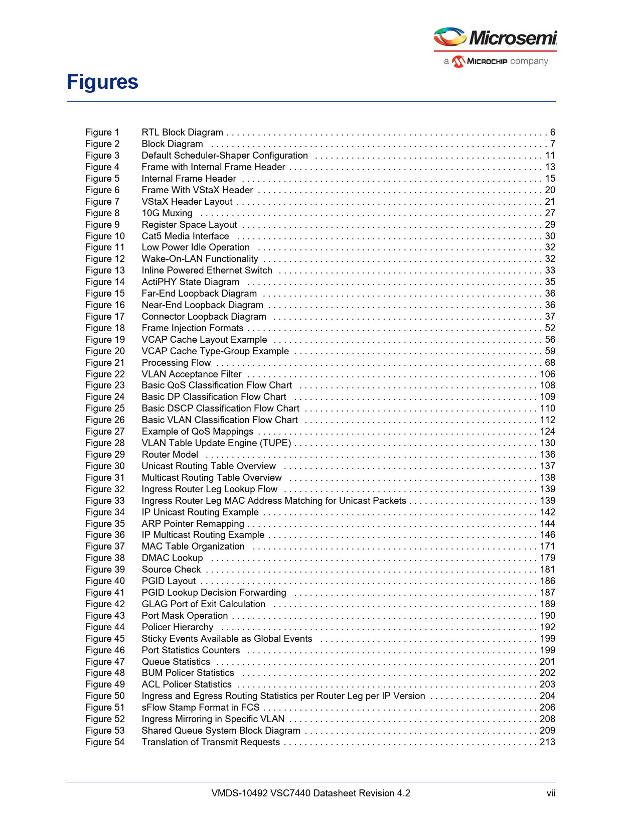 Figure 1 RTL Block Diagram . 6 Figure 2 Block Diagram . 7 Figure 3 Default Scheduler-Shaper Configuration . 11 Figure 4 Frame with Internal Frame Header . 13 Figure 5 Internal Frame Header . 15 Figure 6 Frame With VStaX Header . 20 Figure 7 VStaX Header Layout . 21 Figure 8 10G Muxing . 27 Figure 9 Register Space Layout . 29 Figure 10 Cat5 Media Interface . 30 Figure 11 Low Power Idle Operation . 32 Figure 12 Wake-On-LAN Functionality . 32 Figure 13 Inline Powered Ethernet Switch . 33 Figure 14 ActiPHY State Diagram . 35 Figure 15 Far-End Loopback Diagram . 36 Figure 16 Near-End Loopback Diagram . 36 Figure 17 Connector Loopback Diagram . 37 Figure 18 Frame Injection Formats . 52 Figure 19 VCAP Cache Layout Example . 56 Figure 20 VCAP Cache Type-Group Example . 59 Figure 21 Processing Flow . 68 Figure 22 VLAN Acceptance Filter . 106 Figure 23 Basic QoS Classification Flow Chart . 108 Figure 24 Basic DP Classification Flow Chart . 109 Figure 25 Basic DSCP Classification Flow Chart . 110 Figure 26 Basic VLAN Classification Flow Chart . 112 Figure 27 Example of QoS Mappings . 124 Figure 28 VLAN Table Update Engine (TUPE) . 130 Figure 29 Router Model . 136 Figure 30 Unicast Routing Table Overview . 137 Figure 31 Multicast Routing Table Overview . 138 Figure 32 Ingress Router Leg Lookup Flow . 139 Figure 33 Ingress Router Leg MAC Address Matching for Unicast Packets . 139 Figure 34 IP Unicast Routing Example . 142 Figure 35 ARP Pointer Remapping . 144 Figure 36 IP Multicast Routing Example . 146 Figure 37 MAC Table Organization . 171 Figure 38 DMAC Lookup . 179 Figure 39 Source Check . 181 Figure 40 PGID Layout . 186 Figure 41 PGID Lookup Decision Forwarding . 187 Figure 42 GLAG Port of Exit Calculation . 189 Figure 43 Port Mask Operation . 190 Figure 44 Policer Hierarchy . 192 Figure 45 Sticky Events Available as Global Events . 199 Figure 46 Port Statistics Counters . 199 Figure 47 Queue Statistics . 201 Figure 48 BUM Policer Statistics . 202 Figure 49 ACL Policer Statistics . 203 Figure 50 Ingress and Egress Routing Statistics per Router Leg per IP Version . 204 Figure 51 sFlow Stamp Format in FCS . 206 Figure 52 Ingress Mirroring in Specific VLAN . 208 Figure 53 Shared Queue System Block Diagram . 209 Figure 54 Translation of Transmit Requests . 213 VMDS-10492 VSC7440 Datasheet Revision 4.2 vii Document Outline 1 Revision History 1.1 Revision 4.2 1.2 Revision 4.1 1.3 Revision 4.0 2 Product Overview 2.1 General Features 2.1.1 Layer 2 and Layer 3 Forwarding 2.1.2 Timing and Synchronization 2.1.3 Quality of Service 2.1.4 Security 2.1.5 Management 2.1.6 Product Parameters 2.2 Applications 3 Functional Descriptions 3.1 Register Notations 3.2 Functional Overview 3.2.1 Frame Arrival in Ports and Port Modules 3.2.2 Basic Classification 3.2.3 Security and Control Protocol Classification 3.2.4 Policing 3.2.5 Layer 2 Forwarding 3.2.6 Layer 3 Forwarding 3.2.7 Shared Queue System and Hierarchical Scheduler 3.2.8 Rewriter and Frame Departure 3.2.9 CPU Port Module 3.2.10 Synchronous Ethernet and Precision Time Protocol (PTP) 3.2.11 CPU Subsystem 3.3 Frame Headers 3.3.1 Internal Frame Header Placement 3.3.2 Internal Frame Header Layout 3.3.3 VStaX Header 3.4 Port Numbering and Mappings 3.4.1 Supported SerDes Interfaces 3.4.2 Dual-Media Mode 3.4.3 10G Modes 3.4.4 Logical Port Numbers 3.5 SERDES1G 3.6 SERDES6G 3.7 SERDES10G 3.8 Copper Transceivers 3.8.1 Register Access 3.8.2 Cat5 Twisted Pair Media Interface 3.8.3 Wake-On-LAN and SecureOn 3.8.4 Ethernet Inline Powered Devices 3.8.5 IEEE 802.3af PoE Support 3.8.6 ActiPHY™ Power Management 3.8.7 Testing Features 3.8.8 VeriPHY™ Cable Diagnostics 3.9 DEV1G and DEV2G5 Port Modules 3.9.1 MAC 3.9.2 Half-Duplex Mode 3.9.3 Physical Coding Sublayer (PCS) 3.9.4 Port Statistics 3.10 DEV10G Port Module 3.10.1 MAC 3.10.2 Physical Coding Sublayer (PCS) 3.10.3 Port Statistics 3.11 Assembler 3.11.1 Setting Up a Port in the Assembler 3.11.2 Setting Up a Port for Frame Injection 3.11.3 Setting Up MAC Control Sublayer PAUSE Frame Detection 3.11.4 Setting Up PFC 3.11.5 Setting Up Assembler Port Statistics 3.11.6 Setting Up the Loopback Path 3.12 Versatile Content-Aware Processor (VCAP) 3.12.1 Configuring VCAP 3.12.2 Wide VCAP Entries and Actions 3.12.3 Individual VCAPs 3.12.4 VCAP Programming Examples 3.13 Pipeline Points 3.13.1 Pipeline Definitions 3.14 Analyzer 3.14.1 Initializing the Analyzer 3.15 VCAP CLM Keys and Actions 3.15.1 Keys Overview 3.15.2 VCAP CLM X1 Key Details 3.15.3 VCAP CLM X2 Key Details 3.15.4 VCAP CLM X4 Key Details 3.15.5 VCAP CLM X8 Key Details 3.15.6 VCAP CLM X16 Key Details 3.15.7 VCAP CLM Actions 3.16 Analyzer Classifier 3.16.1 Basic Classifier 3.16.2 VCAP CLM Processing 3.16.3 QoS Mapping Table 3.16.4 Analyzer Classifier Diagnostics 3.17 VLAN and MSTP 3.17.1 Private VLAN 3.17.2 VLAN Pseudo Code 3.18 VCAP LPM: Keys and Action 3.18.1 VCAP LPM SGL_IP4 Key Details 3.18.2 VCAP LPM DBL_IP4 Key Details 3.18.3 VCAP LPM SGL_IP6 Key Details 3.18.4 VCAP LPM DBL_IP6 Key Details 3.18.5 VCAP LPM Actions 3.19 IP Processing 3.19.1 IP Source/Destination Guard 3.19.2 IP Routing 3.19.3 Statistics 3.19.4 IGMP/MLD Snooping Switch 3.20 VCAP IS2 Keys and Actions 3.20.1 VCAP IS2 Keys 3.20.2 VCAP IS2 Actions 3.21 Analyzer Access Control Lists 3.21.1 VCAP IS2 3.21.2 Analyzer Access Control List Frame Rewriting 3.22 Analyzer Layer 2 Forwarding and Learning 3.22.1 Analyzer MAC Table 3.22.2 MAC Table Updates 3.22.3 CPU Access to MAC Table 3.22.4 SCAN Command 3.22.5 Forwarding Lookups 3.22.6 Source Check and Automated Learning 3.22.7 Automated Aging (AUTOAGE) 3.22.8 Interrupt Handling 3.23 Analyzer Access Control Forwarding, Policing, and Statistics 3.23.1 Mask Handling 3.23.2 Policing 3.23.3 Analyzer Statistics 3.23.4 Analyzer sFlow Sampling 3.23.5 Mirroring 3.24 Shared Queue System and Hierarchical Scheduler 3.24.1 Analyzer Result 3.24.2 Buffer Control 3.24.3 Forwarding 3.24.4 Congestion Control 3.24.5 Queue Mapping 3.24.6 Queue Congestion Control 3.24.7 Scheduling 3.24.8 