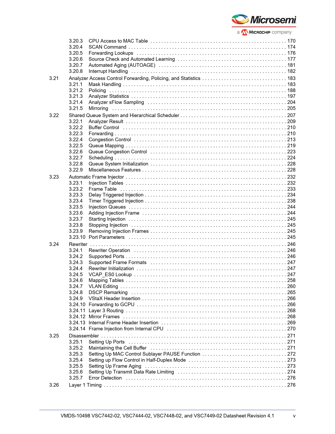 link to page 189 link to page 193 link to page 195 link to page 196 link to page 200 link to page 201 link to page 202 link to page 202 link to page 207 link to page 216 link to page 223 link to page 224 link to page 226 link to page 228 link to page 229 link to page 229 link to page 232 link to page 238 link to page 242 link to page 243 link to page 247 link to page 247 link to page 251 link to page 251 link to page 252 link to page 253 link to page 257 link to page 263 link to page 263 link to page 264 link to page 264 link to page 264 link to page 264 link to page 265 link to page 265 link to page 265 link to page 266 link to page 266 link to page 266 link to page 277 link to page 279 link to page 284 link to page 285 link to page 285 link to page 287 link to page 287 link to page 288 link to page 289 link to page 290 link to page 290 link to page 290 link to page 291 link to page 292 link to page 292 link to page 293 link to page 295 link to page 295 3.20.3 CPU Access to MAC Table . 170 3.20.4 SCAN Command . 174 3.20.5 Forwarding Lookups . 176 3.20.6 Source Check and Automated Learning . 177 3.20.7 Automated Aging (AUTOAGE) . 181 3.20.8 Interrupt Handling . 182 3.21 Analyzer Access Control Forwarding, Policing, and Statistics . 183 3.21.1 Mask Handling . 183 3.21.2 Policing . 188 3.21.3 Analyzer Statistics . 197 3.21.4 Analyzer sFlow Sampling . 204 3.21.5 Mirroring . 205 3.22 Shared Queue System and Hierarchical Scheduler . 207 3.22.1 Analyzer Result . 209 3.22.2 Buffer Control . 210 3.22.3 Forwarding . 210 3.22.4 Congestion Control . 213 3.22.5 Queue Mapping . 219 3.22.6 Queue Congestion Control . 223 3.22.7 Scheduling . 224 3.22.8 Queue System Initialization . 228 3.22.9 Miscellaneous Features . 228 3.23 Automatic Frame Injector . 232 3.23.1 Injection Tables . 232 3.23.2 Frame Table . 233 3.23.3 Delay Triggered Injection . 234 3.23.4 Timer Triggered Injection . 238 3.23.5 Injection Queues . 244 3.23.6 Adding Injection Frame . 244 3.23.7 Starting Injection . 245 3.23.8 Stopping Injection . 245 3.23.9 Removing Injection Frames . 245 3.23.10 Port Parameters . 245 3.24 Rewriter . 246 3.24.1 Rewriter Operation . 246 3.24.2 Supported Ports . 246 3.24.3 Supported Frame Formats . 247 3.24.4 Rewriter Initialization . 247 3.24.5 VCAP_ES0 Lookup . 247 3.24.6 Mapping Tables . 258 3.24.7 VLAN Editing . 260 3.24.8 DSCP Remarking . 265 3.24.9 VStaX Header Insertion . 266 3.24.10 Forwarding to GCPU . 266 3.24.11 Layer 3 Routing . 268 3.24.12 Mirror Frames . 268 3.24.13 Internal Frame Header Insertion . 269 3.24.14 Frame Injection from Internal CPU . 270 3.25 Disassembler . 271 3.25.1 Setting Up Ports . 271 3.25.2 Maintaining the Cell Buffer . 271 3.25.3 Setting Up MAC Control Sublayer PAUSE Function . 272 3.25.4 Setting up Flow Control in Half-Duplex Mode . 273 3.25.5 Setting Up Frame Aging . 273 3.25.6 Setting Up Transmit Data Rate Limiting . 274 3.25.7 Error Detection . 276 3.26 Layer 1 Timing . 276 VMDS-10498 VSC7442-02, VSC7444-02, VSC7448-02, and VSC7449-02 Datasheet Revision 4.1 v Document Outline 1 Revision History 1.1 Revision 4.1 1.2 Revision 4.0 2 Product Overview 2.1 General Features 2.2 Layer 2 and Layer 3 Forwarding 2.3 Timing and Synchronization 2.4 Quality of Service 2.5 Security 2.6 Management 2.7 Product Parameters 2.8 Applications 2.9 Functional Overview 2.9.1 Frame Arrival in Ports and Port Modules 2.9.2 Basic Classification 2.9.3 Security and Control Protocol Classification 2.9.4 Policing 2.9.5 Layer 2 Forwarding 2.9.6 Layer 3 Forwarding 2.9.7 Shared Queue System and Hierarchical Scheduler 2.9.8 Rewriter and Frame Departure 2.9.9 CPU Port Module 2.9.10 Synchronous Ethernet and Precision Time Protocol (PTP) 3 Functional Descriptions 3.1 Register Notations 3.2 Frame Headers 3.2.1 Internal Frame Header Placement 3.2.2 Internal Frame Header Layout 3.2.3 VStaX Header 3.3 Port Numbering and Mappings 3.3.1 SERDES Macro to I/O Pin Mapping 3.3.2 Supported Port Interfaces 3.3.3 QSGMII 3.3.4 10G Modes 3.3.5 VSC7442-02 Port Numbering and Port Mappings 3.3.6 VSC7444-02 Port Numbering and Port Mappings 3.3.7 VSC7448-02 Port Numbering and Port Mappings 3.3.8 VSC7449-02 Port Numbering and Port Mappings 3.3.9 Logical Port Numbers 3.4 SERDES1G 3.5 SERDES6G 3.6 SERDES10G 3.7 DEV1G and DEV2G5 Port Modules 3.7.1 MAC 3.7.2 Half-Duplex Mode 3.7.3 Physical Coding Sublayer (PCS) 3.7.4 Port Statistics 3.8 DEV10G Port Module 3.8.1 MAC 3.8.2 Physical Coding Sublayer (PCS) 3.8.3 Port Statistics 3.9 Assembler 3.9.1 Setting Up a Port in the Assembler 3.9.2 Setting Up a Port for Frame Injection 3.9.3 Setting Up MAC Control Sublayer PAUSE Frame Detection 3.9.4 Setting Up PFC 3.9.5 Setting Up Assembler Port Statistics 3.9.6 Setting Up the Loopback Path 3.10 Versatile Content-Aware Processor (VCAP™) 3.10.1 Configuring VCAP 3.10.2 Wide VCAP Entries and Actions 3.10.3 Individual VCAPs 3.10.4 VCAP Programming Examples 3.11 Pipeline Points 3.11.1 Pipeline Definitions 3.12 Analyzer 3.12.1 Initializing the Analyzer 3.13 VCAP CLM Keys and Actions 3.13.1 Keys Overview 3.13.2 VCAP CLM X1 Key Details 3.13.3 VCAP CLM X2 Key Details 3.13.4 VCAP CLM X4 Key Details 3.13.5 VCAP CLM X8 Key Details 3.13.6 VCAP CLM X16 Key Details 3.13.7 VCAP CLM Actions 3.14 Analyzer Classifier 3.14.1 Basic Classifier 3.14.2 VCAP CLM Processing 3.14.3 QoS Mapping Table 3.14.4 Analyzer Classifier Diagnostics 3.15 VLAN and MSTP 3.15.1 Private VLAN 3.15.2 VLAN Pseudo Code 3.16 VCAP LPM: Keys and Action 3.16.1 VCAP LPM SGL_IP4 Key Details 3.16.2 VCAP LPM DBL_IP4 Key Details 3.16.3 VCAP LPM SGL_IP6 Key Details 3.16.4 VCAP LPM DBL_IP6 Key Details 3.16.5 VCAP LPM Actions 3.17 IP Processing 3.17.1 IP Source/Destination Guard 3.17.2 IP Routing 3.17.3 Frame Types for IP Routing 3.17.4 Statistics 3.17.5 IGMP/MLD Snooping Switch 3.18 VCAP IS2 Keys and Actions 3.18.1 VCAP IS2 Keys 3.18.2 VCAP IS2 Actions 3.19 Analyzer Access Control Lists 3.19.1 VCAP IS2 3.19.2 Analyzer Access Control List Frame Rewriting 3.20 Analyzer Layer 2 Forwarding and Learning 3.20.