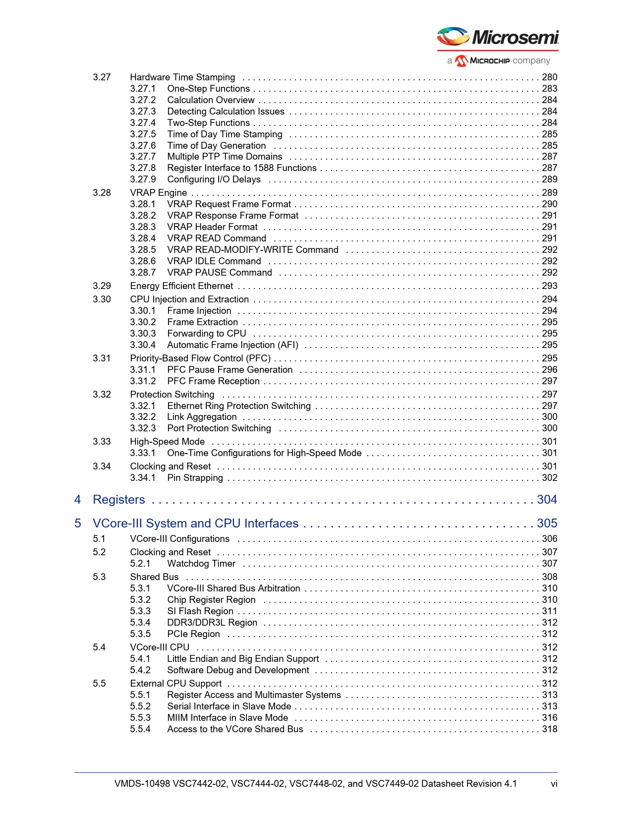 link to page 299 link to page 302 link to page 303 link to page 303 link to page 303 link to page 304 link to page 304 link to page 306 link to page 306 link to page 308 link to page 308 link to page 309 link to page 310 link to page 310 link to page 310 link to page 311 link to page 311 link to page 311 link to page 312 link to page 313 link to page 313 link to page 314 link to page 314 link to page 314 link to page 314 link to page 315 link to page 316 link to page 316 link to page 316 link to page 319 link to page 319 link to page 320 link to page 320 link to page 320 link to page 321 link to page 323 link to page 324 link to page 325 link to page 326 link to page 326 link to page 327 link to page 329 link to page 329 link to page 330 link to page 331 link to page 331 link to page 331 link to page 331 link to page 331 link to page 331 link to page 332 link to page 332 link to page 335 link to page 337 3.27 Hardware Time Stamping . 280 3.27.1 One-Step Functions . 283 3.27.2 Calculation Overview . 284 3.27.3 Detecting Calculation Issues . 284 3.27.4 Two-Step Functions . 284 3.27.5 Time of Day Time Stamping . 285 3.27.6 Time of Day Generation . 285 3.27.7 Multiple PTP Time Domains . 287 3.27.8 Register Interface to 1588 Functions . 287 3.27.9 Configuring I/O Delays . 289 3.28 VRAP Engine . 289 3.28.1 VRAP Request Frame Format . 290 3.28.2 VRAP Response Frame Format . 291 3.28.3 VRAP Header Format . 291 3.28.4 VRAP READ Command . 291 3.28.5 VRAP READ-MODIFY-WRITE Command . 292 3.28.6 VRAP IDLE Command . 292 3.28.7 VRAP PAUSE Command . 292 3.29 Energy Efficient Ethernet . 293 3.30 CPU Injection and Extraction . 294 3.30.1 Frame Injection . 294 3.30.2 Frame Extraction . 295 3.30.3 Forwarding to CPU . 295 3.30.4 Automatic Frame Injection (AFI) . 295 3.31 Priority-Based Flow Control (PFC) . 295 3.31.1 PFC Pause Frame Generation . 296 3.31.2 PFC Frame Reception . 297 3.32 Protection Switching . 297 3.32.1 Ethernet Ring Protection Switching . 297 3.32.2 Link Aggregation . 300 3.32.3 Port Protection Switching . 300 3.33 High-Speed Mode . 301 3.33.1 One-Time Configurations for High-Speed Mode . 301 3.34 Clocking and Reset . 301 3.34.1 Pin Strapping . 302 4 Registers . 304 5 VCore-III System and CPU Interfaces . 305 5.1 VCore-III Configurations . 306 5.2 Clocking and Reset . 307 5.2.1 Watchdog Timer . 307 5.3 Shared Bus . 308 5.3.1 VCore-III Shared Bus Arbitration . 310 5.3.2 Chip Register Region . 310 5.3.3 SI Flash Region . 311 5.3.4 DDR3/DDR3L Region . 312 5.3.5 PCIe Region . 312 5.4 VCore-III CPU . 312 5.4.1 Little Endian and Big Endian Support . 312 5.4.2 Software Debug and Development . 312 5.5 External CPU Support . 312 5.5.1 Register Access and Multimaster Systems . 313 5.5.2 Serial Interface in Slave Mode . 313 5.5.3 MIIM Interface in Slave Mode . 316 5.5.4 Access to the VCore Shared Bus . 318 VMDS-10498 VSC7442-02, VSC7444-02, VSC7448-02, and VSC7449-02 Datasheet Revision 4.1 vi Document Outline 1 Revision History 1.1 Revision 4.1 1.2 Revision 4.0 2 Product Overview 2.1 General Features 2.2 Layer 2 and Layer 3 Forwarding 2.3 Timing and Synchronization 2.4 Quality of Service 2.5 Security 2.6 Management 2.7 Product Parameters 2.8 Applications 2.9 Functional Overview 2.9.1 Frame Arrival in Ports and Port Modules 2.9.2 Basic Classification 2.9.3 Security and Control Protocol Classification 2.9.4 Policing 2.9.5 Layer 2 Forwarding 2.9.6 Layer 3 Forwarding 2.9.7 Shared Queue System and Hierarchical Scheduler 2.9.8 Rewriter and Frame Departure 2.9.9 CPU Port Module 2.9.10 Synchronous Ethernet and Precision Time Protocol (PTP) 3 Functional Descriptions 3.1 Register Notations 3.2 Frame Headers 3.2.1 Internal Frame Header Placement 3.2.2 Internal Frame Header Layout 3.2.3 VStaX Header 3.3 Port Numbering and Mappings 3.3.1 SERDES Macro to I/O Pin Mapping 3.3.2 Supported Port Interfaces 3.3.3 QSGMII 3.3.4 10G Modes 3.3.5 VSC7442-02 Port Numbering and Port Mappings 3.3.6 VSC7444-02 Port Numbering and Port Mappings 3.3.7 VSC7448-02 Port Numbering and Port Mappings 3.3.8 VSC7449-02 Port Numbering and Port Mappings 3.3.9 Logical Port Numbers 3.4 SERDES1G 3.5 SERDES6G 3.6 SERDES10G 3.7 DEV1G and DEV2G5 Port Modules 3.7.1 MAC 3.7.2 Half-Duplex Mode 3.7.3 Physical Coding Sublayer (PCS) 3.7.4 Port Statistics 3.8 DEV10G Port Module 3.8.1 MAC 3.8.2 Physical Coding Sublayer (PCS) 3.8.3 Port Statistics 3.9 Assembler 3.9.1 Setting Up a Port in the Assembler 3.9.2 Setting Up a Port for Frame Injection 3.9.3 Setting Up MAC Control Sublayer PAUSE Frame Detection 3.9.4 Setting Up PFC 3.9.5 Setting Up Assembler Port Statistics 3.9.6 Setting Up the Loopback Path 3.10 Versatile Content-Aware Processor (VCAP™) 3.10.1 Configuring VCAP 3.10.2 Wide VCAP Entries and Actions 3.10.3 Individual VCAPs 3.10.4 VCAP Programming Examples 3.11 Pipeline Points 3.11.1 Pipeline Definitions 3.12 Analyzer 3.12.1 Initializing the Analyzer 3.13 VCAP CLM Keys and Actions 3.13.1 Keys Overview 3.13.2 VCAP CLM X1 Key Details 3.13.3 VCAP CLM X2 Key Details 3.13.4 VCAP CLM X4 Key Details 3.13.5 VCAP CLM X8 Key Details 3.13.6 VCAP CLM X16 Key Details 3.13.7 VCAP CLM Actions 3.14 Analyzer Classifier 3.14.1 Basic Classifier 3.14.2 VCAP CLM Processing 3.14.3 QoS Mapping Table 3.14.4 Analyzer Classifier Diagnostics 3.15 VLAN and MSTP 3.15.1 Private VLAN 3.15.2 VLAN Pseudo Code 3.16 VCAP LPM: Keys and Action 3.16.1 VCAP LPM SGL_IP4 Key Details 3.16.2 VCAP LPM DBL_IP4 Key Details 3.16.3 VCAP LPM SGL_IP6 Key Details 3.16.4 VCAP LPM DBL_IP6 Key Details 3.16.5 VCAP LPM Actions 3.17 IP Processing 3.17.1 IP Source/Destination Guard 3.17.2 IP Routing 3.17.3 Frame Types for IP Routing 3.17.4 Statistics 3.17.5 IGMP/MLD Snooping Switch 3.18 VCAP IS2 Keys and Actions 3.18.1 VCAP IS2 Keys 3.18.2 VCAP IS2 Actions 3.19 Analyzer Access Control Lists 3.19.1 VCAP IS2 3.19.2 Analyzer Access Control List Frame Rewriting 3.20 Analyzer Layer 2 Forwarding and Learning 3.20.1 Analyzer MAC Table 3.20.2 MAC Table Updates 3.20.3 CPU Access to MAC Table 3.20.4 SCAN Command 3.2