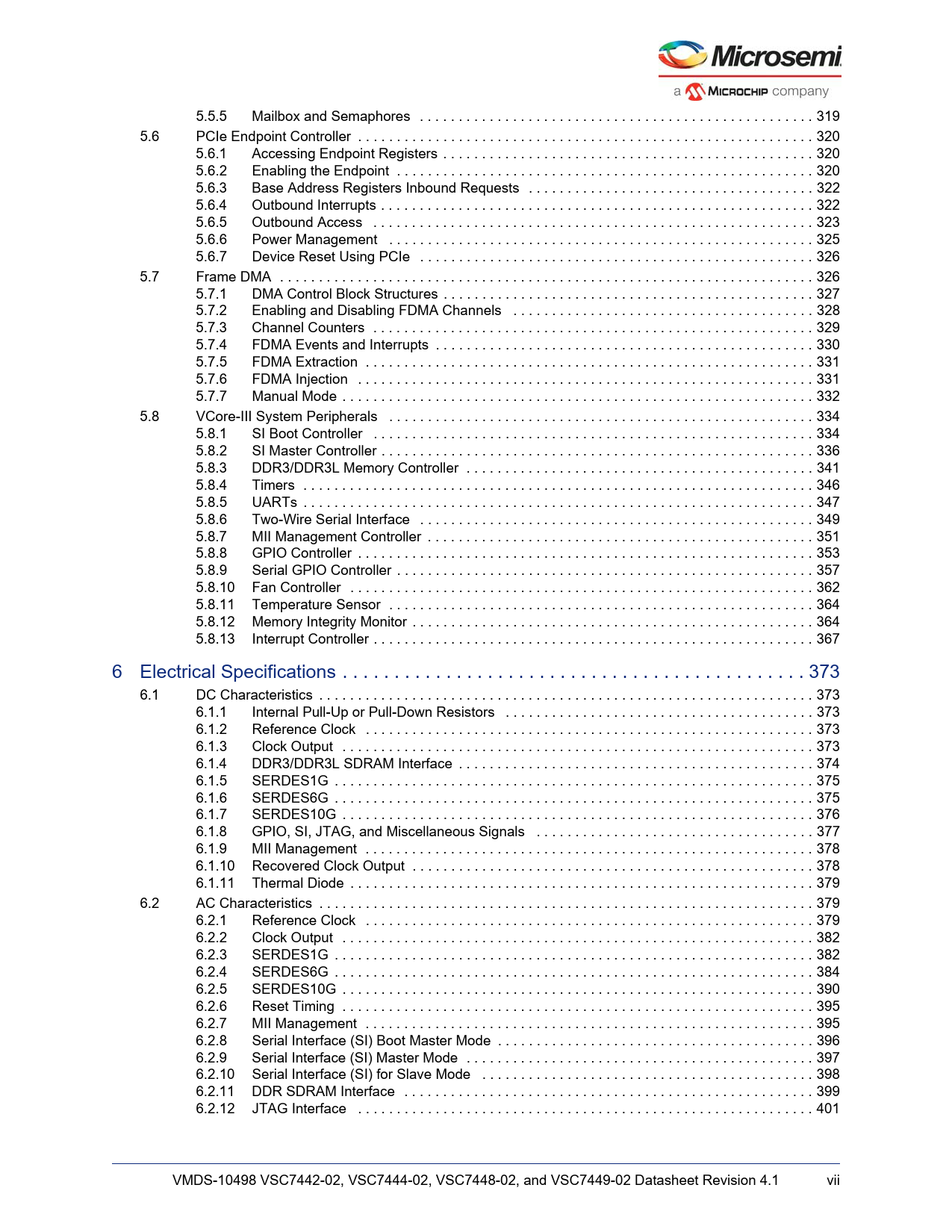 link to page 338 link to page 339 link to page 339 link to page 339 link to page 341 link to page 341 link to page 342 link to page 344 link to page 345 link to page 345 link to page 346 link to page 347 link to page 348 link to page 349 link to page 350 link to page 350 link to page 351 link to page 353 link to page 353 link to page 355 link to page 360 link to page 365 link to page 366 link to page 368 link to page 370 link to page 372 link to page 376 link to page 381 link to page 383 link to page 383 link to page 386 link to page 392 link to page 392 link to page 392 link to page 392 link to page 392 link to page 393 link to page 394 link to page 394 link to page 395 link to page 396 link to page 397 link to page 397 link to page 398 link to page 398 link to page 398 link to page 401 link to page 401 link to page 403 link to page 409 link to page 414 link to page 414 link to page 415 link to page 416 link to page 417 link to page 418 link to page 420 5.5.5 Mailbox and Semaphores . 319 5.6 PCIe Endpoint Controller . 320 5.6.1 Accessing Endpoint Registers . 320 5.6.2 Enabling the Endpoint . 320 5.6.3 Base Address Registers Inbound Requests . 322 5.6.4 Outbound Interrupts . 322 5.6.5 Outbound Access . 323 5.6.6 Power Management . 325 5.6.7 Device Reset Using PCIe . 326 5.7 Frame DMA . 326 5.7.1 DMA Control Block Structures . 327 5.7.2 Enabling and Disabling FDMA Channels . 328 5.7.3 Channel Counters . 329 5.7.4 FDMA Events and Interrupts . 330 5.7.5 FDMA Extraction . 331 5.7.6 FDMA Injection . 331 5.7.7 Manual Mode . 332 5.8 VCore-III System Peripherals . 334 5.8.1 SI Boot Controller . 334 5.8.2 SI Master Controller . 336 5.8.3 DDR3/DDR3L Memory Controller . 341 5.8.4 Timers . 346 5.8.5 UARTs . 347 5.8.6 Two-Wire Serial Interface . 349 5.8.7 MII Management Controller . 351 5.8.8 GPIO Controller . 353 5.8.9 Serial GPIO Controller . 357 5.8.10 Fan Controller . 362 5.8.11 Temperature Sensor . 364 5.8.12 Memory Integrity Monitor . 364 5.8.13 Interrupt Controller . 367 6 Electrical Specifications . 373 6.1 DC Characteristics . 373 6.1.1 Internal Pull-Up or Pull-Down Resistors . 373 6.1.2 Reference Clock . 373 6.1.3 Clock Output . 373 6.1.4 DDR3/DDR3L SDRAM Interface . 374 6.1.5 SERDES1G . 375 6.1.6 SERDES6G . 375 6.1.7 SERDES10G . 376 6.1.8 GPIO, SI, JTAG, and Miscellaneous Signals . 377 6.1.9 MII Management . 378 6.1.10 Recovered Clock Output . 378 6.1.11 Thermal Diode . 379 6.2 AC Characteristics . 379 6.2.1 Reference Clock . 379 6.2.2 Clock Output . 382 6.2.3 SERDES1G . 382 6.2.4 SERDES6G . 384 6.2.5 SERDES10G . 390 6.2.6 Reset Timing . 395 6.2.7 MII Management . 395 6.2.8 Serial Interface (SI) Boot Master Mode . 396 6.2.9 Serial Interface (SI) Master Mode . 397 6.2.10 Serial Interface (SI) for Slave Mode . 398 6.2.11 DDR SDRAM Interface . 399 6.2.12 JTAG Interface . 401 VMDS-10498 VSC7442-02, VSC7444-02, VSC7448-02, and VSC7449-02 Datasheet Revision 4.1 vii Document Outline 1 Revision History 1.1 Revision 4.1 1.2 Revision 4.0 2 Product Overview 2.1 General Features 2.2 Layer 2 and Layer 3 Forwarding 2.3 Timing and Synchronization 2.4 Quality of Service 2.5 Security 2.6 Management 2.7 Product Parameters 2.8 Applications 2.9 Functional Overview 2.9.1 Frame Arrival in Ports and Port Modules 2.9.2 Basic Classification 2.9.3 Security and Control Protocol Classification 2.9.4 Policing 2.9.5 Layer 2 Forwarding 2.9.6 Layer 3 Forwarding 2.9.7 Shared Queue System and Hierarchical Scheduler 2.9.8 Rewriter and Frame Departure 2.9.9 CPU Port Module 2.9.10 Synchronous Ethernet and Precision Time Protocol (PTP) 3 Functional Descriptions 3.1 Register Notations 3.2 Frame Headers 3.2.1 Internal Frame Header Placement 3.2.2 Internal Frame Header Layout 3.2.3 VStaX Header 3.3 Port Numbering and Mappings 3.3.1 SERDES Macro to I/O Pin Mapping 3.3.2 Supported Port Interfaces 3.3.3 QSGMII 3.3.4 10G Modes 3.3.5 VSC7442-02 Port Numbering and Port Mappings 3.3.6 VSC7444-02 Port Numbering and Port Mappings 3.3.7 VSC7448-02 Port Numbering and Port Mappings 3.3.8 VSC7449-02 Port Numbering and Port Mappings 3.3.9 Logical Port Numbers 3.4 SERDES1G 3.5 SERDES6G 3.6 SERDES10G 3.7 DEV1G and DEV2G5 Port Modules 3.7.1 MAC 3.7.2 Half-Duplex Mode 3.7.3 Physical Coding Sublayer (PCS) 3.7.4 Port Statistics 3.8 DEV10G Port Module 3.8.1 MAC 3.8.2 Physical Coding Sublayer (PCS) 3.8.3 Port Statistics 3.9 Assembler 3.9.1 Setting Up a Port in the Assembler 3.9.2 Setting Up a Port for Frame Injection 3.9.3 Setting Up MAC Control Sublayer PAUSE Frame Detection 3.9.4 Setting Up PFC 3.9.5 Setting Up Assembler Port Statistics 3.9.6 Setting Up the Loopback Path 3.10 Versatile Content-Aware Processor (VCAP™) 3.10.1 Configuring VCAP 3.10.2 Wide VCAP Entries and Actions 3.10.3 Individual VCAPs 3.10.4 VCAP Programming Examples 3.11 Pipeline Points 3.11.1 Pipeline Definitions 3.12 Analyzer 3.12.1 Initializing the Analyzer 3.13 VCAP CLM Keys and Actions 3.13.1 Keys Overview 3.13.2 VCAP CLM X1 Key Details 3.13.3 VCAP CLM X2 Key Details 3.13.4 VCAP CLM X4 Key Details 3.13.5 VCAP CLM X8 Key Details 3.13.6 VCAP CLM X16 Key Details 3.13.7 VCAP CLM Actions 3.14 Analyzer Classifier 3.14.1 Basic Classifier 3.14.2 VCAP CLM Processing 3.14.3 QoS Mapping Table 3.14.4 Analyzer Classifier Diagnostics 3.15 VLAN and MSTP 3.15.1 Private VLAN 3.15.2 VLAN Pseudo Code 3.16 VCAP LPM: Keys and Action 3.16.1 VCAP LPM SGL_IP4 Key Details 3.16.2 VCAP LPM DBL_IP4 Key Details 3.16.3 VCAP LPM SGL_IP6 Key Details 3.16.4 VCAP LPM DBL_IP6 Key Details 3.16.5 VCAP LPM Actions 3.17 IP Processing 3.17.1 IP Source/Destination Guard 3.17.2 IP Routing 3.17.3 Frame Types for IP Routing 3.17.4 Statistics 3.17.5 IGMP/MLD Snooping Switch 3.18 VCAP IS2 Keys and Actions 3.18.1 VCAP IS2 Keys 3.18.2 VCAP IS2 Actions 3.19 Analyzer Access Control Lists 3.19.1 VCAP IS2 3.19.2 Analyzer Access Control List Frame Rewriting 3.20 Analyzer Layer 2 Forwarding and Learning 3.20.1 Analyzer MAC Table 3.20.2 MAC Table Updates 3.20.3 CPU Access to MAC Table 3.20.4 SCAN Command 3.20.5 Forwarding Lookups