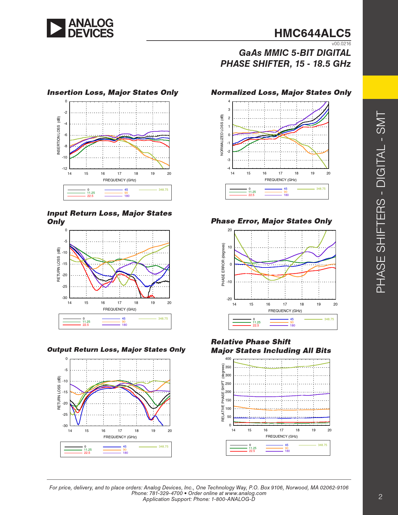 HMC644ALC5 v00.0216 GaAs MMIC 5-BIT DIGITALPHASE SHIFTER, 15 - 18.5 GHzInsertion Loss, Major States OnlyNormalized Loss, Major States Only 0 4 3 -2 ) B) B 2 T d (d ( -4 S SS 1 S O M O L L -6 0 N ED IO IZ T AL -1 R -8 E M S R O -2 L - S IN N -10 -3 -12 -4 ITA 14 15 16 17 18 19 20 14 15 16 17 18 19 20 FREQUENCY (GHz) FREQUENCY (GHz) IG 0 45 348.75 0 45 348.75 11.25 90 11.25 90 22.5 180 22.5 180 S - D Input Return Loss, Major StatesOnlyPhase Error, Major States Only 0 20 IFTER -5 ) H ) 10 B -10 (d S (degrees S O L -15 0 E S N S UR T -20 A RE -10 PHASE ERROR -25 PH -30 -20 14 15 16 17 18 19 20 14 15 16 17 18 19 20 FREQUENCY (GHz) FREQUENCY (GHz) 0 45 348.75 0 45 348.75 11.25 90 11.25 90 22.5 180 22.5 180 Relative Phase ShiftOutput Return Loss, Major States OnlyMajor States Including All Bits 0 400 ) s e 350 -5 re g ) e 300 B (d -10 T (d 250 S IF S O SH L -15 200 N ASE UR 150 T -20 PH RE IVE 100 -25 AT 50 EL R -30 0 14 15 16 17 18 19 20 14 15 16 17 18 19 20 FREQUENCY (GHz) FREQUENCY (GHz) 0 45 348.75 0 45 348.75 11.25 90 11.25 90 22.5 180 22.5 180 For price, delivery, and to place orders: Analog Devices, Inc., One Technology Way, P.O. Box 9106, Norwood, MA 02062-9106 Phone: 781-329-4700 • Order online at www.analog.com Application Support: Phone: 1-800-ANALOG-D 2