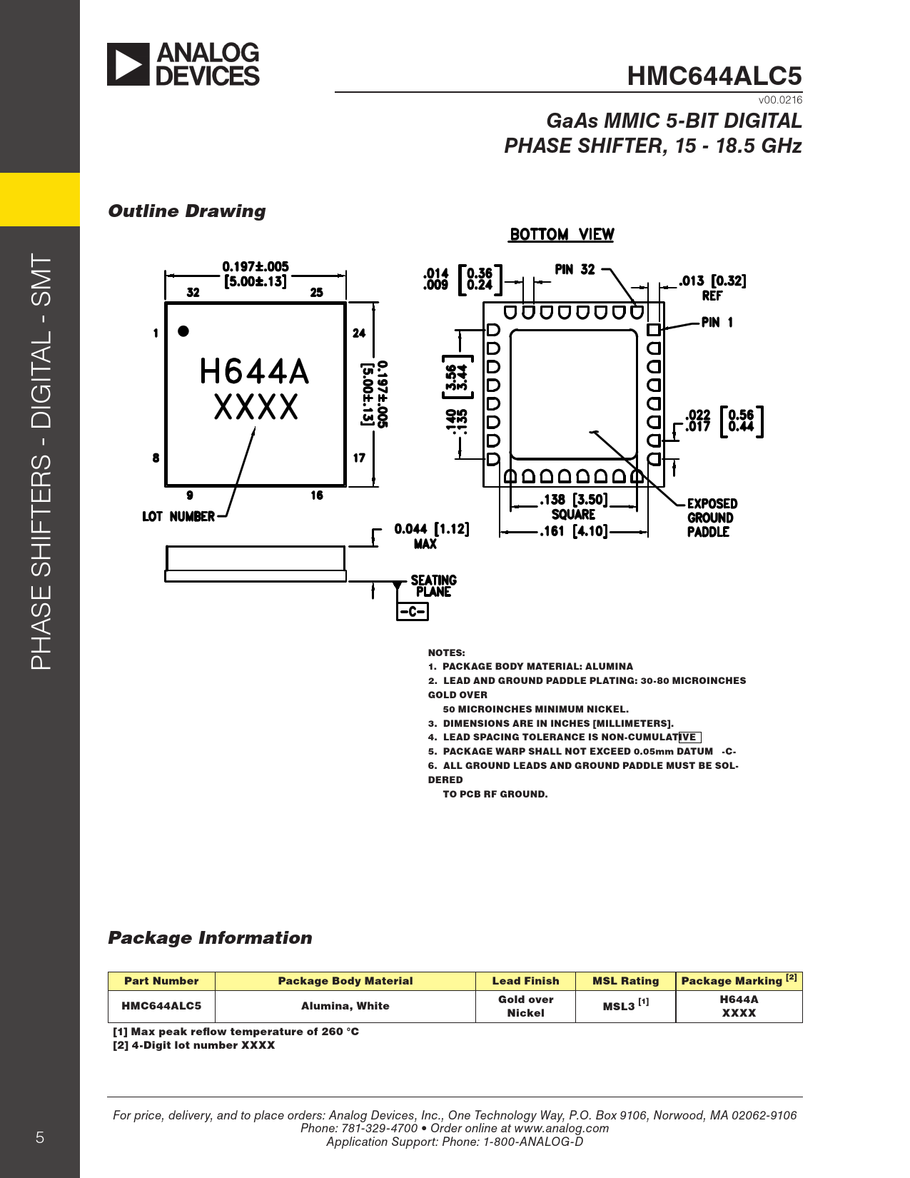 HMC644ALC5 GaAs MMIC 5-BIT DIGITAL PHASE SHIFTER, 15 - 18.5 GHz Outline Drawing