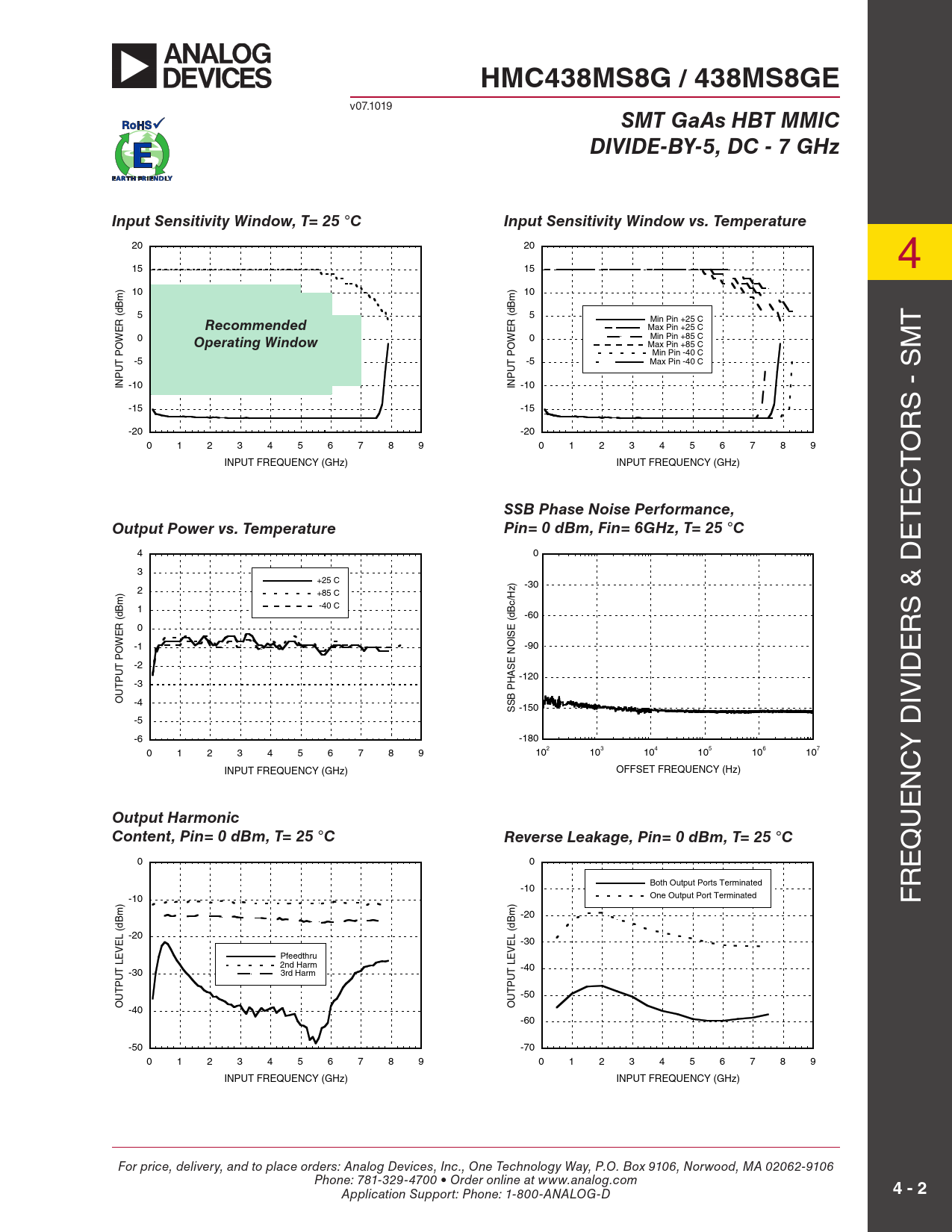 HMC438MS8G / 438MS8GE. SMT GaAs HBT MMIC. DIVIDE-BY-5, DC - 7 GHz. Input Sensitivity Window, T= 25 °C