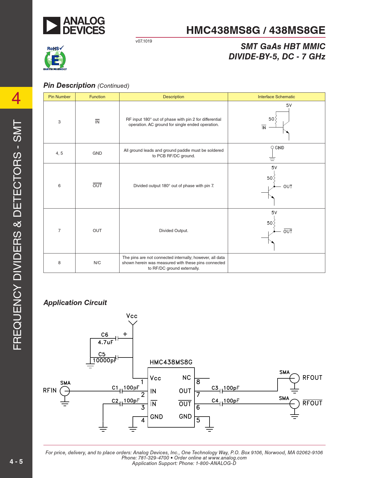 HMC438MS8G / 438MS8GE. SMT GaAs HBT MMIC. DIVIDE-BY-5, DC - 7 GHz. Pin Description. Application Circuit. 4 - 5