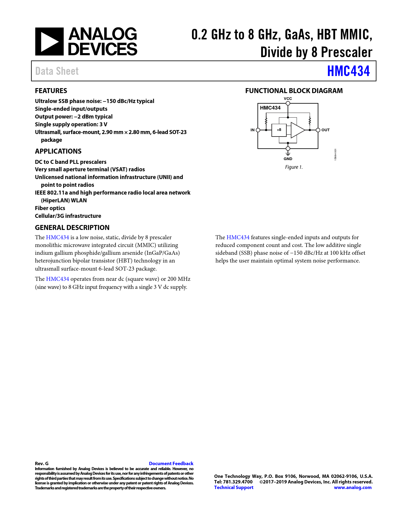 The HMC434 is a low noise, static, divide by 8 prescaler The HMC434 features single-ended inputs and outputs for monolithic microwave integrated circuit (MMIC) utilizing reduced component count and cost. The low additive single indium gal ium phosphide/gal ium arsenide (InGaP/GaAs) sideband (SSB) phase noise of −150 dBc/Hz at 100 kHz offset heterojunction bipolar transistor (HBT) technology in an helps the user maintain optimal system noise performance. ultrasmall surface-mount 6-lead SOT-23 package. The HMC434 operates from near dc (square wave) or 200 MHz (sine wave) to 8 GHz input frequency with a single 3 V dc supply.