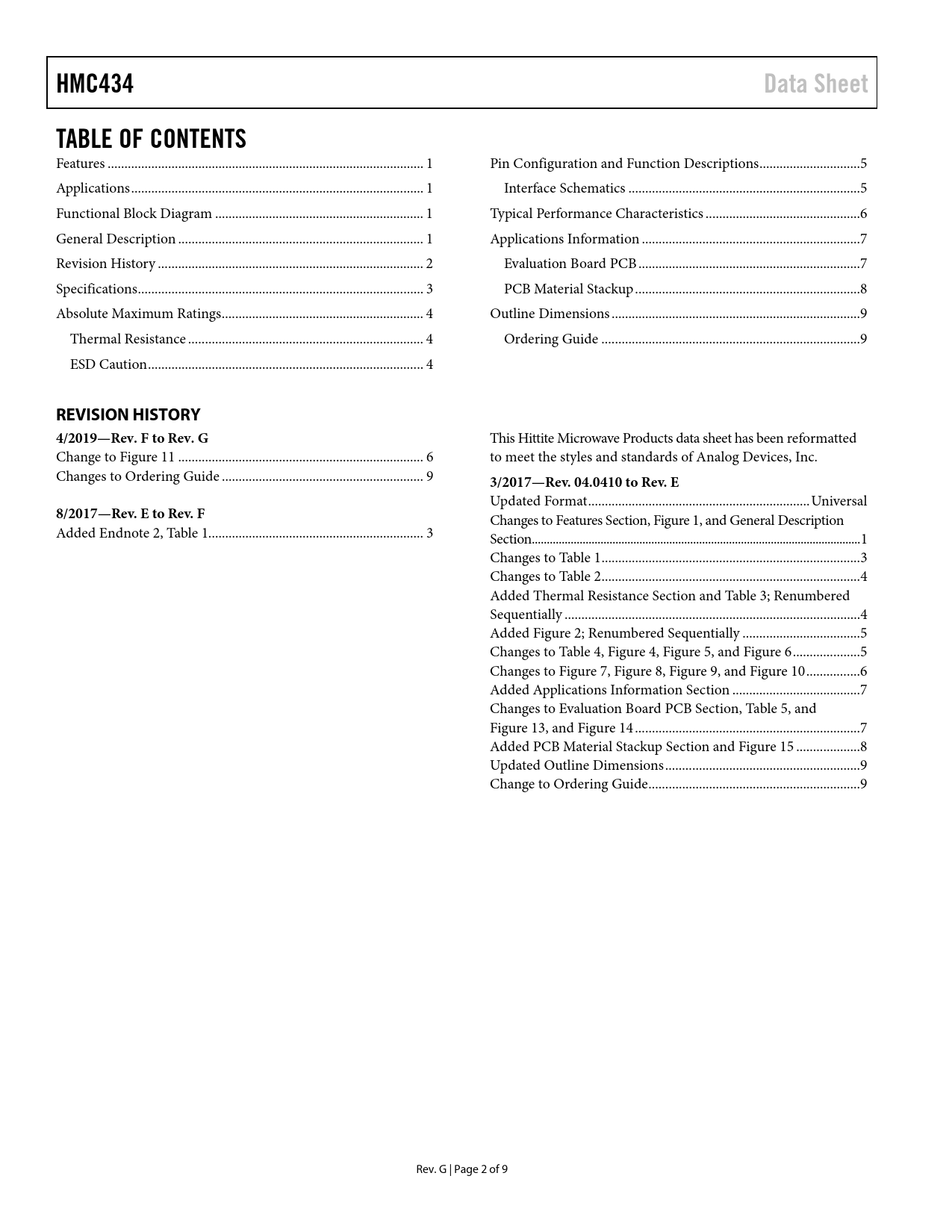 link to page 1 link to page 1 link to page 1 link to page 1 link to page 2 link to page 3 link to page 4 link to page 4 link to page 4 link to page 5 link to page 5 link to page 6 link to page 7 link to page 7 link to page 8 link to page 9 link to page 9 HMC434Data SheetTABLE OF CONTENTS Features .. 1 Pin Configuration and Function Descriptions ..5 Applications ... 1 Interface Schematics ...5 Functional Block Diagram .. 1 Typical Performance Characteristics ..6 General Description ... 1 Applications Information ...7 Revision History ... 2 Evaluation Board PCB ..7 Specifications ... 3 PCB Material Stackup ...8 Absolute Maximum Ratings .. 4 Outline Dimensions ..9 Thermal Resistance .. 4 Ordering Guide ...9 ESD Caution .. 4 REVISION HISTORY 4/2019—Rev. F to Rev. G This Hittite Microwave Products data sheet has been reformatted Change to Figure 11 ... 6 to meet the styles and standards of Analog Devices, Inc. Changes to Ordering Guide .. 9 3/2017—Rev. 04.0410 to Rev. E Updated Format .. Universal 8/2017—Rev. E to Rev. F Changes to Features Section, Figure 1, and General Description Added Endnote 2, Table 1.. 3 Section.. ... ... ... .. .. .. .. ... ... ... ... ... .. .. ... ... ... ... ... .. .. . 1 Changes to Table 1 ... 3 Changes to Table 2 ... 4 Added Thermal Resistance Section and Table 3; Renumbered Sequentially .. 4 Added Figure 2; Renumbered Sequential y ... 5 Changes to Table 4, Figure 4, Figure 5, and Figure 6 .. 5 Changes to Figure 7, Figure 8, Figure 9, and Figure 10 .. 6 Added Applications Information Section .. 7 Changes to Evaluation Board PCB Section, Table 5, and Figure 13, and Figure 14 ... 7 Added PCB Material Stackup Section and Figure 15 ... 8 Updated Outline Dimensions .. 9 Change to Ordering Guide ... 9 Rev. G | Page 2 of 9 Document Outline Features Applications Functional Block Diagram General Description Revision History Specifications Absolute Maximum Ratings Thermal Resistance ESD Caution Pin Configuration and Function Descriptions Interface Schematics Typical Performance Characteristics Applications Information Evaluation Board PCB PCB Material Stackup Outline Dimensions Ordering Guide