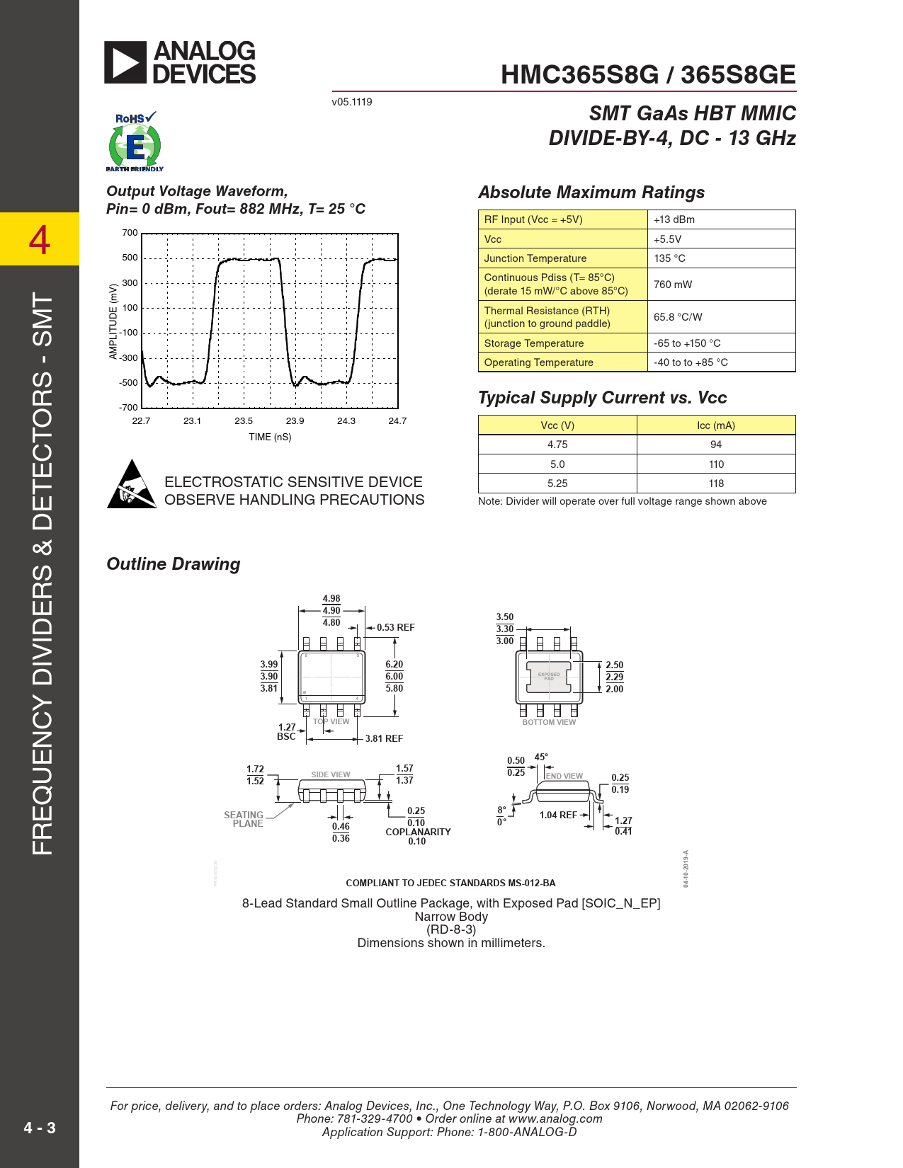 HMC365S8G / 365S8GE. SMT GaAs HBT MMIC. DIVIDE-BY-4, DC - 13 GHz. Output Voltage Waveform,. Absolute Maximum Ratings
