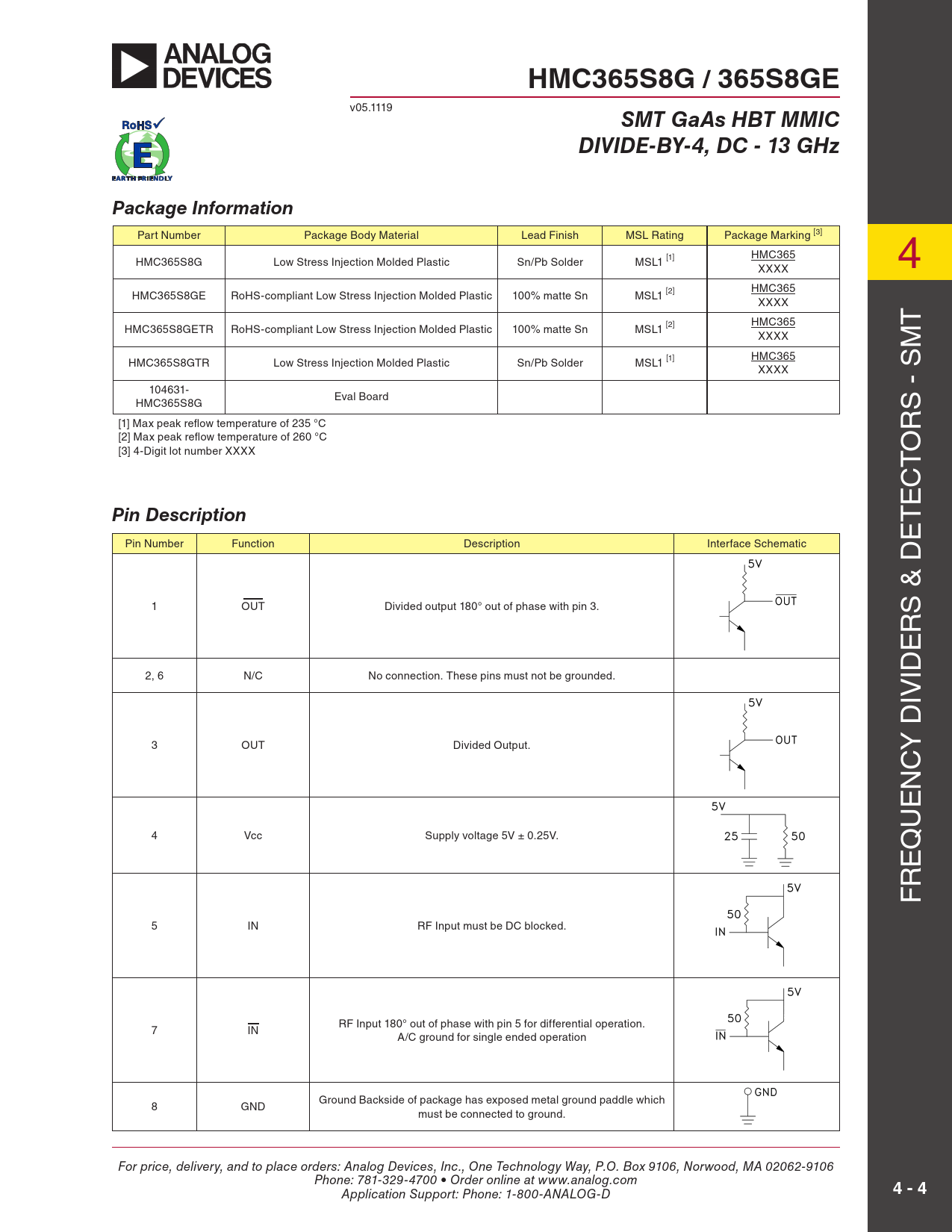 HMC365S8G / 365S8GE. SMT GaAs HBT MMIC. DIVIDE-BY-4, DC - 13 GHz. Package Information. Pin Description. 4 - 4