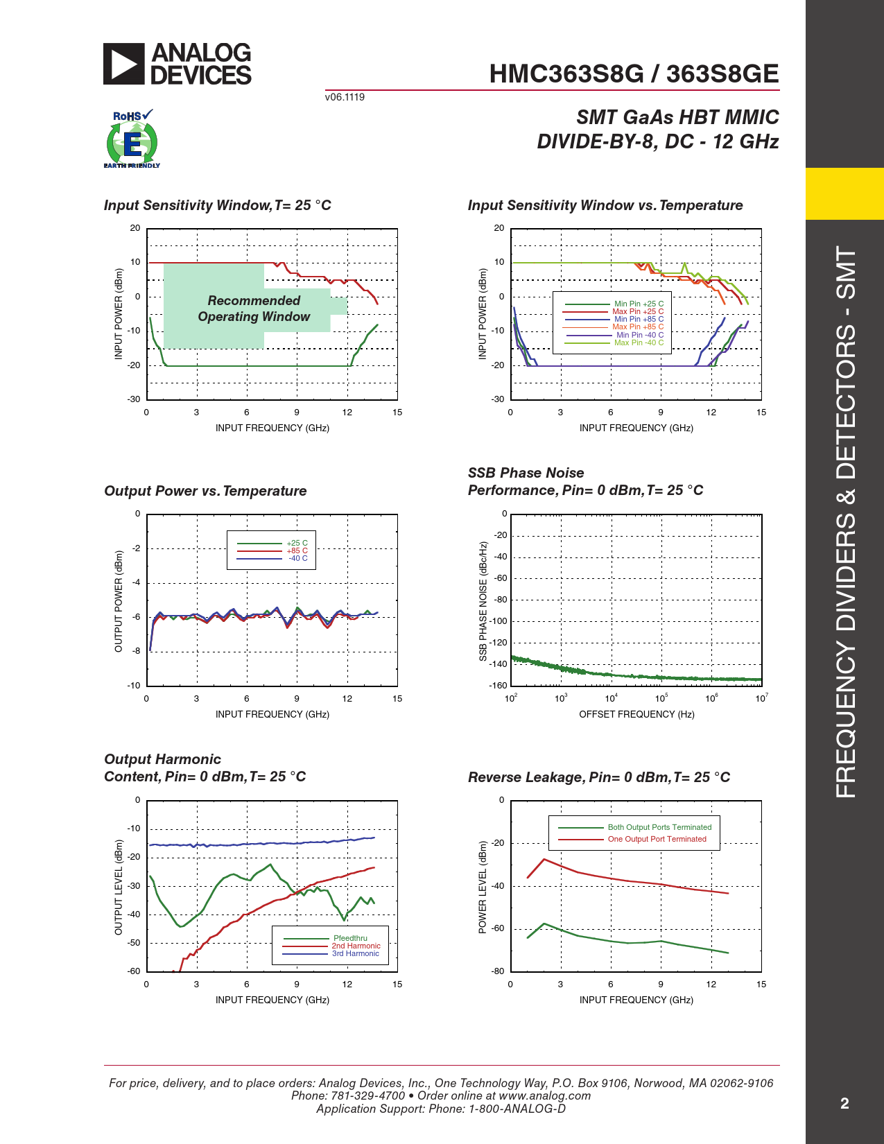 HMC363S8G / 363S8GE v06.1119 SMT GaAs HBT MMICDIVIDE-BY-8, DC - 12 GHzInput Sensitivity Window, T= 25 °CInput Sensitivity Window vs. Temperature 20 20 10 10 t ) m m M (dB 0 (dB R Recommended 0 R Min Pin +25 C s E E W Max Pin +25 C W O Operating Window Min Pin +85 C O P -10 P -10 Max Pin +85 C Min Pin -40 C UT UT Max Pin -40 C s - P P IN IN r -20 -20 o t -30 -30 0 3 6 9 12 15 0 3 6 9 12 15 c INPUT FREQUENCY (GHz) INPUT FREQUENCY (GHz) e t e SSB Phase NoiseOutput Power vs. TemperaturePerformance, Pin= 0 dBm, T= 25 °C 0 0 s & D -20 -2 +25 C +85 C r -40 C -40 e (dBm) (dBc/Hz) -4 -60 iD -80 POWER NOISE -6 iv -100 PHASE -120 OUTPUT -8 SSB y D -140 c -10 -160 n 0 3 6 9 12 15 102 103 104 105 106 107 e INPUT FREQUENCY (GHz) OFFSET FREQUENCY (Hz) u q Output Harmonic e Content, Pin= 0 dBm, T= 25 °CReverse Leakage, Pin= 0 dBm, T= 25 °C r 0 0 F -10 Both Output Ports Terminated -20 One Output Port Terminated -20 (dBm) (dBm) -30 -40 LEVEL LEVEL -40 OUTPUT -60 POWER -50 Pfeedthru 2nd Harmonic 3rd Harmonic -60 -80 0 3 6 9 12 15 0 3 6 9 12 15 INPUT FREQUENCY (GHz) INPUT FREQUENCY (GHz) For price, delivery, and to place orders: Analog Devices, Inc., One Technology Way, P.O. Box 9106, Norwood, MA 02062-9106 Phone: 781-329-4700 • Order online at www.analog.com 2 Application Support: Phone: 1-800-ANALOG-D Document Outline Typical Applications Features Functional Diagram General Description Electrical Specifications, TA = +25° C, 50 Ohm System, Vcc= 5V Operating Chracteristics Input Sensitivity Window, T= 25 °C Input Sensitivity Window vs. Temperature Output Power vs. Temperature SSB Phase Noise Performance, Pin= 0 dBm, T= 25 °C Output Harmonic Content, Pin= 0 dBm, T= 25 °C Reverse Leakage, Pin= 0 dBm, T= 25 °C Output Voltage Waveform, Pin= 0 dBm, Fout= 882 MHz, T= 25 °C Absolute Maximum Ratings Typical Supply Current vs. Vcc Outline Drawing Package Information Pin Description Application Circuit Evaluation PCB List of Materials for Evaluation PCB 104631 [1]