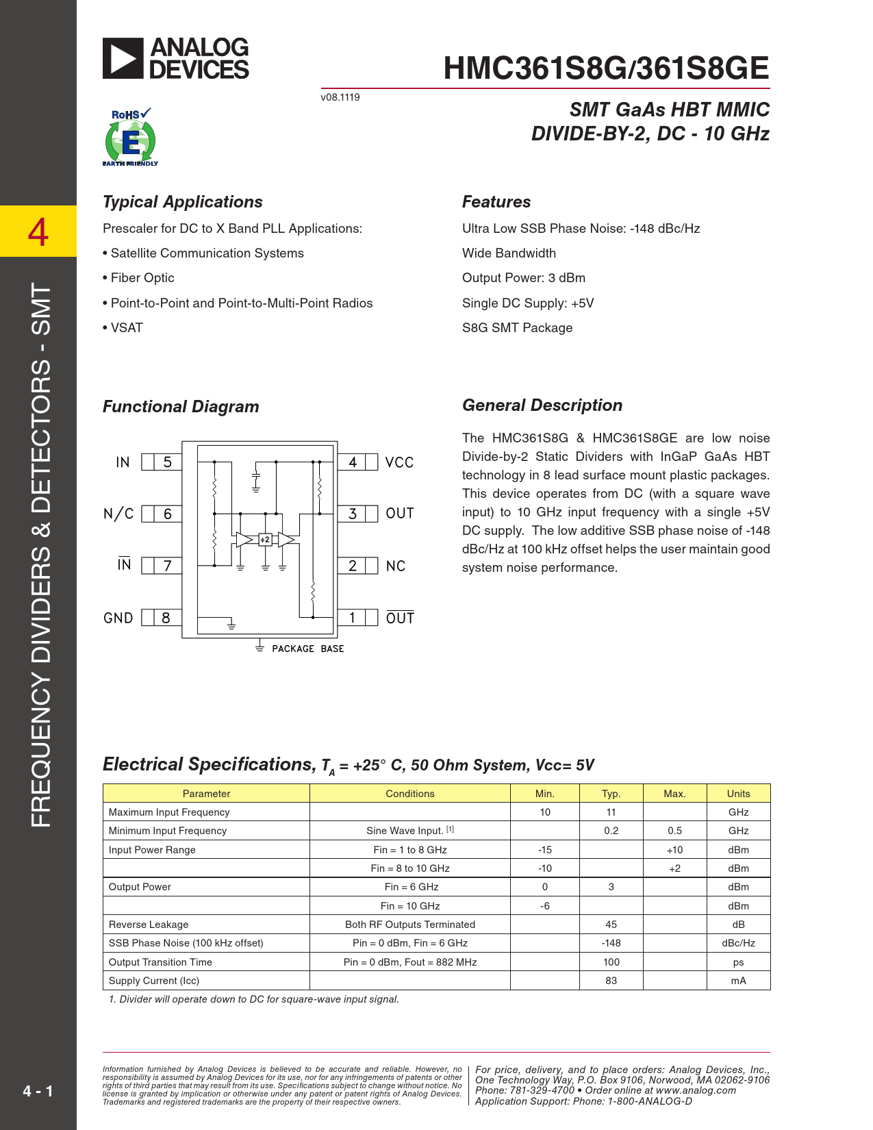 4 Prescaler for DC to X Band PLL Applications: Ultra Low SSB Phase Noise: -148 dBc/Hz 4 • Satel ite Communication Systems Wide Bandwidth T • Fiber Optic Output Power: 3 dBm T M • Point-to-Point and Point-to-Multi-Point Radios Single DC Supply: +5V M • VSAT S8G SMT Package S - S S - S R R O
