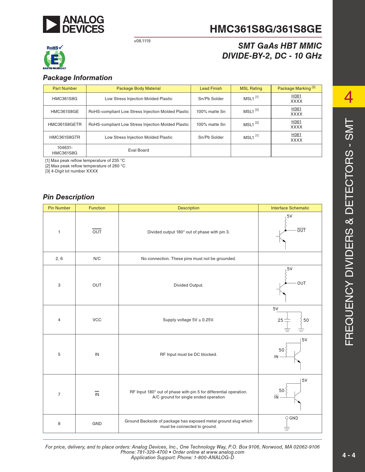 HMC361S8G/361S8GE. SMT GaAs HBT MMIC. DIVIDE-BY-2, DC - 10 GHz. Package Information. Pin Description. 4 - 4