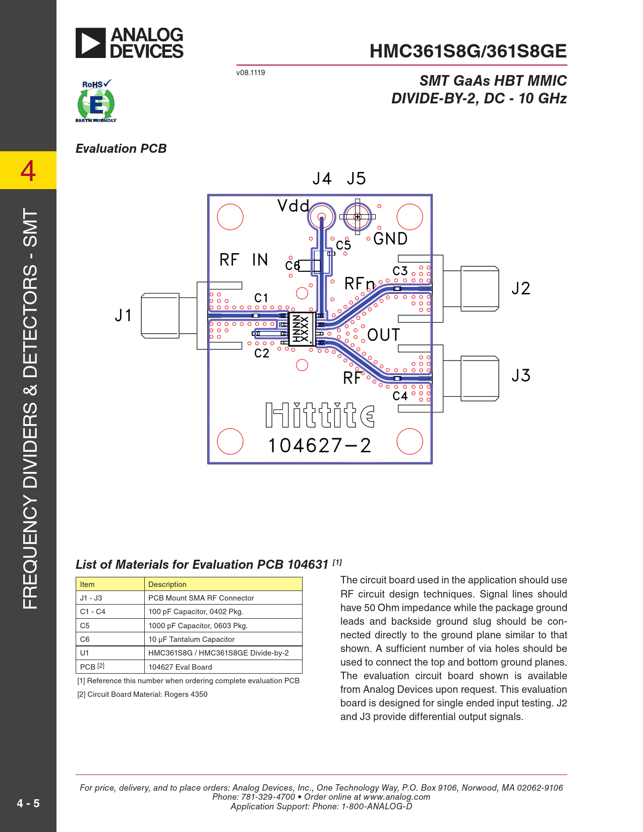 HMC361S8G/361S8GE v08.1119 SMT GaAs HBT MMICDIVIDE-BY-2, DC - 10 GHzEvaluation PCB 4 4 T T M M S - S S - S R R O O T T C C E E T T E E S & D S & D R R E E ID ID IV IV Y D Y D C C N N E E U U Q List of Materials for Evaluation PCB 104631 [1] Q E The circuit board used in the application should use Item Description E R RF circuit design techniques. Signal lines should J1 - J3 PCB Mount SMA RF Connector R F have 50 Ohm impedance while the package ground C1 - C4 100 pF Capacitor, 0402 Pkg. F leads and backside ground slug should be con- C5 1000 pF Capacitor, 0603 Pkg. nected directly to the ground plane similar to that C6 10 µF Tantalum Capacitor shown. A sufficient number of via holes should be U1 HMC361S8G / HMC361S8GE Divide-by-2 used to connect the top and bottom ground planes. PCB [2] 104627 Eval Board The evaluation circuit board shown is available [1] Reference this number when ordering complete evaluation PCB from Analog Devices upon request. This evaluation [2] Circuit Board Material: Rogers 4350 board is designed for single ended input testing. J2 and J3 provide differential output signals. For price, delivery, and to place orders: Analog Devices, Inc., One Technology Way, P.O. Box 9106, Norwood, MA 02062-9106 4 - 5 Phone: 781-329-4700 • Order online at www.analog.com Application Support: Phone: 1-800-ANALOG-D