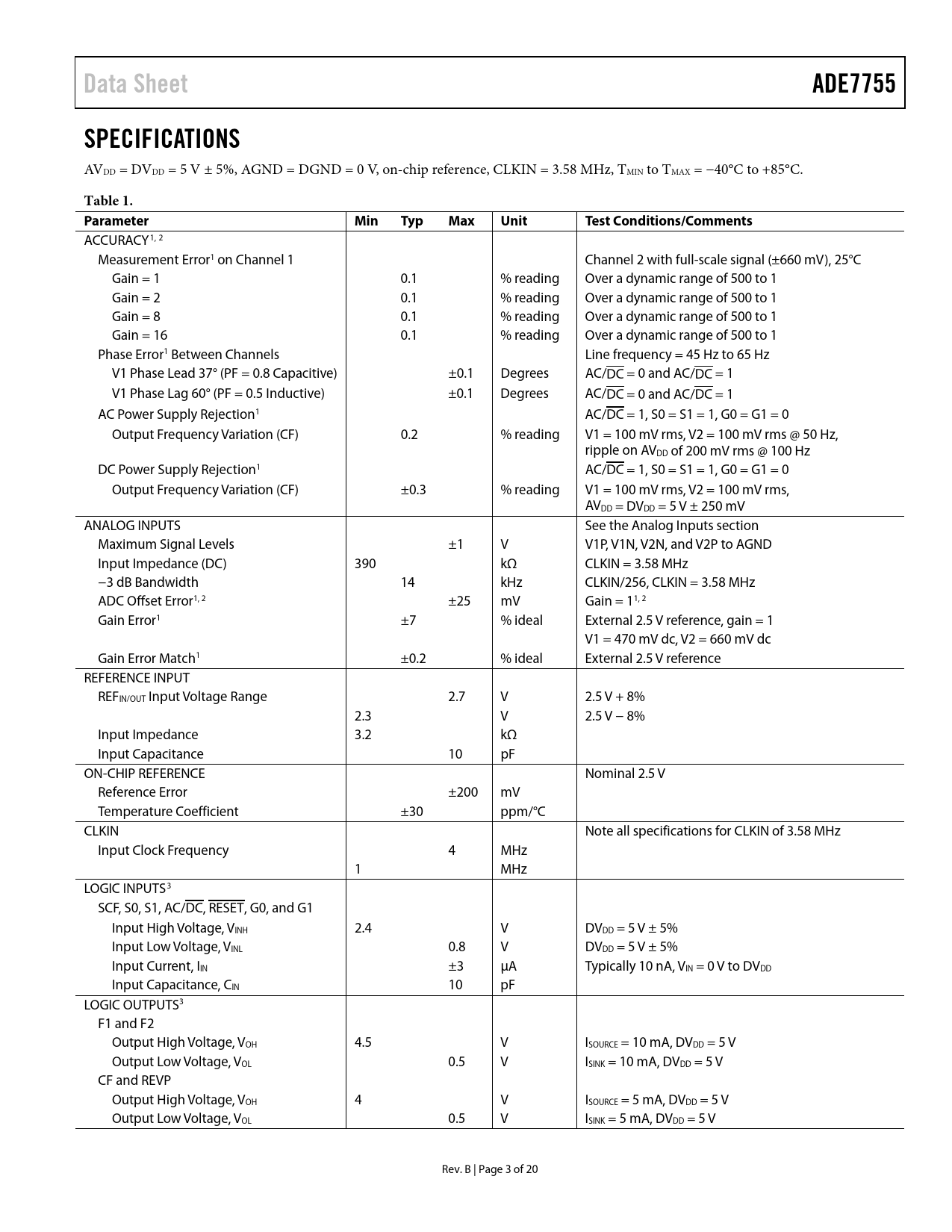 link to page 13 link to page 4 link to page 4 link to page 4 link to page 4 link to page 4 link to page 4 link to page 4 link to page 4 link to page 4 link to page 4 link to page 4 link to page 4 link to page 4 Data SheetADE7755SPECIFICATIONS AVDD = DVDD = 5 V ± 5%, AGND = DGND = 0 V, on-chip reference, CLKIN = 3.58 MHz, TMIN to TMAX = −40°C to +85°C. Table 1. ParameterMinTypMaxUnitTest Conditions/Comments ACCURACY1, 2 Measurement Error1 on Channel 1 Channel 2 with full-scale signal (±660 mV), 25°C Gain = 1 0.1 % reading Over a dynamic range of 500 to 1 Gain = 2 0.1 % reading Over a dynamic range of 500 to 1 Gain = 8 0.1 % reading Over a dynamic range of 500 to 1 Gain = 16 0.1 % reading Over a dynamic range of 500 to 1 Phase Error1 Between Channels Line frequency = 45 Hz to 65 Hz V1 Phase Lead 37° (PF = 0.8 Capacitive) ±0.1 Degrees AC/DC = 0 and AC/DC = 1 V1 Phase Lag 60° (PF = 0.5 Inductive) ±0.1 Degrees AC/DC = 0 and AC/DC = 1 AC Power Supply Rejection1 AC/DC = 1, S0 = S1 = 1, G0 = G1 = 0 Output Frequency Variation (CF) 0.2 % reading V1 = 100 mV rms, V2 = 100 mV rms @ 50 Hz, ripple on AVDD of 200 mV rms @ 100 Hz DC Power Supply Rejection1 AC/DC = 1, S0 = S1 = 1, G0 = G1 = 0 Output Frequency Variation (CF) ±0.3 % reading V1 = 100 mV rms, V2 = 100 mV rms, AVDD = DVDD = 5 V ± 250 mV ANALOG INPUTS See the Analog Inputs section Maximum Signal Levels ±1 V V1P, V1N, V2N, and V2P to AGND Input Impedance (DC) 390 kΩ CLKIN = 3.58 MHz −3 dB Bandwidth 14 kHz CLKIN/256, CLKIN = 3.58 MHz ADC Offset Error1, 2 ±25 mV Gain = 11, 2 Gain Error1 ±7 % ideal External 2.5 V reference, gain = 1 V1 = 470 mV dc, V2 = 660 mV dc Gain Error Match1 ±0.2 % ideal External 2.5 V reference REFERENCE INPUT REFIN/OUT Input Voltage Range 2.7 V 2.5 V + 8% 2.3 V 2.5 V − 8% Input Impedance 3.2 kΩ Input Capacitance 10 pF ON-CHIP REFERENCE Nominal 2.5 V Reference Error ±200 mV Temperature Coefficient ±30 ppm/°C CLKIN Note all specifications for CLKIN of 3.58 MHz Input Clock Frequency 4 MHz 1 MHz LOGIC INPUTS3 SCF, S0, S1, AC/DC, RESET, G0, and G1 Input High Voltage, VINH 2.4 V DVDD = 5 V ± 5% Input Low Voltage, VINL 0.8 V DVDD = 5 V ± 5% Input Current, IIN ±3 µA Typically 10 nA, VIN = 0 V to DVDD Input Capacitance, CIN 10 pF LOGIC OUTPUTS3 F1 and F2 Output High Voltage, VOH 4.5 V ISOURCE = 10 mA, DVDD = 5 V Output Low Voltage, VOL 0.5 V ISINK = 10 mA, DVDD = 5 V CF and REVP Output High Voltage, VOH 4 V ISOURCE = 5 mA, DVDD = 5 V Output Low Voltage, VOL 0.5 V ISINK = 5 mA, DVDD = 5 V Rev. B | Page 3 of 20 Document Outline Features General Description Functional Block Diagram Revision History Specifications Timing Characteristics Absolute Maximum Ratings ESD Caution Pin Configuration and Function Descriptions Typical Performance Characteristics Terminology Theory of Operation Power Factor Considerations Nonsinusoidal Voltage and Current Analog Inputs Channel 1 (Current Channel) Channel 2 (Voltage Channel) Typical Connection Diagrams Power Supply Monitor HPF and Offset Effects Digital-to-Frequency Conversion Interfacing the ADE7755 to a Microcontroller for Energy Measurement Power Measurement Considerations Transfer Function Frequency Outputs F1 and F2 Example 1 Example 2 Frequency Output CF Selecting a Frequency for an Energy Meter Application Frequency Outputs No Load Threshold Outline Dimensions Ordering Guide