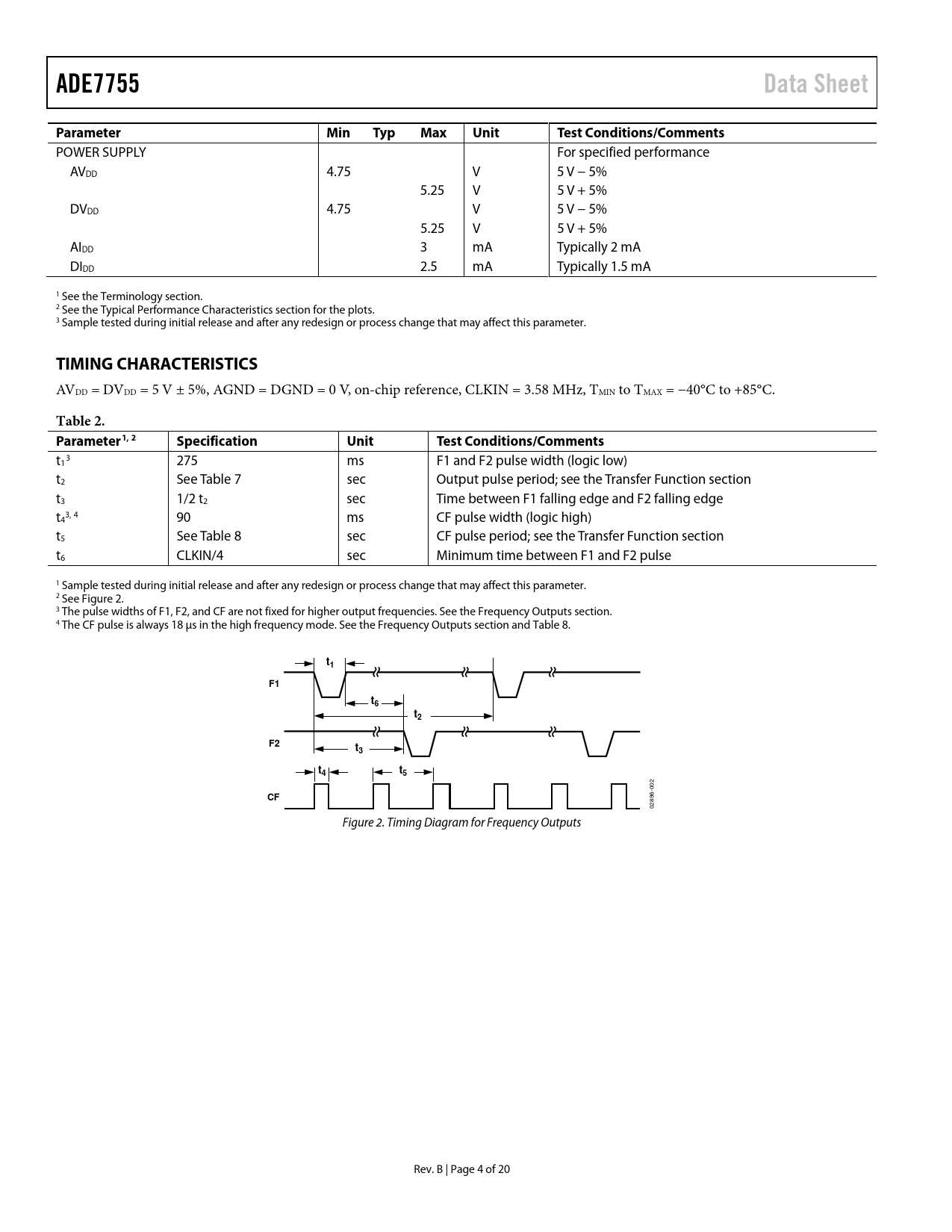 ADE7755. Data Sheet. Parameter. Min. Typ. Max. Unit. Test Conditions/Comments. TIMING CHARACTERISTICS. Table 2. Parameter1, 2