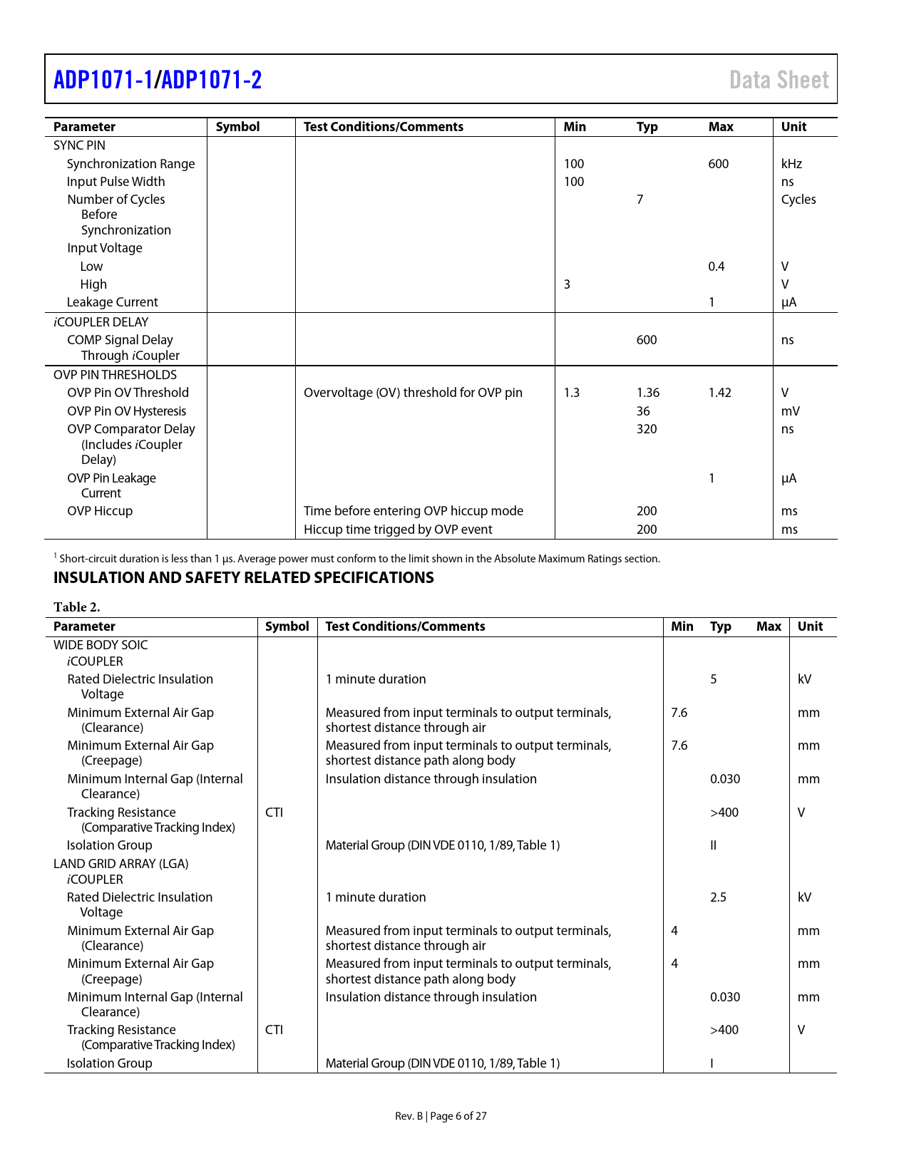 link to page 8 link to page 3 link to page 3 ADP1071-1/ADP1071-2Data SheetParameterSymbolTest Conditions/CommentsMinTypMaxUnit SYNC PIN Synchronization Range 100 600 kHz Input Pulse Width 100 ns Number of Cycles 7 Cycles Before Synchronization Input Voltage Low 0.4 V High 3 V Leakage Current 1 µA iCOUPLER DELAY COMP Signal Delay 600 ns Through iCoupler OVP PIN THRESHOLDS OVP Pin OV Threshold Overvoltage (OV) threshold for OVP pin 1.3 1.36 1.42 V OVP Pin OV Hysteresis 36 mV OVP Comparator Delay 320 ns (Includes iCoupler Delay) OVP Pin Leakage 1 µA Current OVP Hiccup Time before entering OVP hiccup mode 200 ms Hiccup time trigged by OVP event 200 ms 1 Short-circuit duration is less than 1 μs. Average power must conform to the limit shown in the Absolute Maximum Ratings section. INSULATION AND SAFETY RELATED SPECIFICATIONSTable 2. ParameterSymbol Test Conditions/CommentsMin TypMax Unit WIDE BODY SOIC iCOUPLER Rated Dielectric Insulation 1 minute duration 5 kV Voltage Minimum External Air Gap Measured from input terminals to output terminals, 7.6 mm (Clearance) shortest distance through air Minimum External Air Gap Measured from input terminals to output terminals, 7.6 mm (Creepage) shortest distance path along body Minimum Internal Gap (Internal Insulation distance through insulation 0.030 mm Clearance) Tracking Resistance CTI >400 V (Comparative Tracking Index) Isolation Group Material Group (DIN VDE 0110, 1/89, Table 1) II LAND GRID ARRAY (LGA) iCOUPLER Rated Dielectric Insulation 1 minute duration 2.5 kV Voltage Minimum External Air Gap Measured from input terminals to output terminals, 4 mm (Clearance) shortest distance through air Minimum External Air Gap Measured from input terminals to output terminals, 4 mm (Creepage) shortest distance path along body Minimum Internal Gap (Internal Insulation distance through insulation 0.030 mm Clearance) Tracking Resistance CTI >400 V (Comparative Tracking Index) Isolation Group Material Group (DIN VDE 0110, 1/89, Table 1) I Rev. B | Page 6 of 27 Document Outline Features Applications Functional Block Diagram General Description Revision History Specifications Insulation and Safety Related Specifications Regulatory Information Absolute Maximum Ratings Thermal Resistance ESD Caution Pin Configurations and Function Descriptions Typical Performance Characteristics Theory of Operation Detailed Block Diagram Primary Side Supply, Input Voltage, and LDO Secondary Side Supply and LDO Precision Enable Soft Start Procedure Output Voltage Sensing and Feedback Loop Compensation and Steady State Operation Slope Compensation Input/Output Current-Limit Protection Temperature Sensing Frequency Setting (RT Pin) Maximum Duty Cycle Frequency Synchronization Synchronous Rectifier (SR) Driver Output Overvoltage Protection (OVP) SR Dead Time Light Load Mode (LLM) and Continuous Conduction Mode (CCM) Soft Stop OCP/Feedback Recovery Output Voltage Tracking Remote System Reset OCP Counter External Start-Up Circuit Insulation Lifetime Layout Guidelines Applications Information Typical Application Circuits Outline Dimensions Ordering Guide