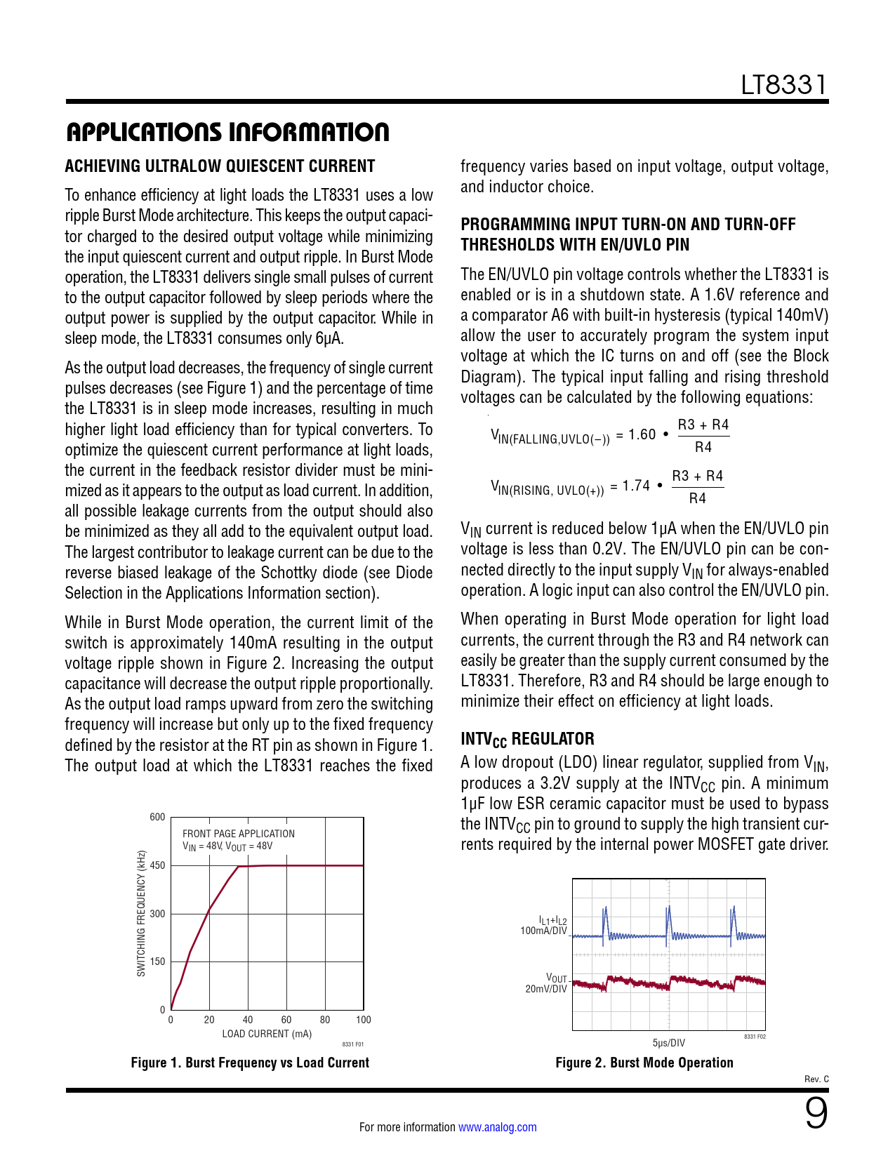 link to page 9 link to page 9 link to page 7 link to page 7 LT8331 APPLICATIONS INFORMATIONACHIEVING ULTRALOW QUIESCENT CURRENT frequency varies based on input voltage, output voltage, To enhance efficiency at light loads the LT8331 uses a low and inductor choice. ripple Burst Mode architecture. This keeps the output capaci- PROGRAMMING INPUT TURN-ON AND TURN-OFF tor charged to the desired output voltage while minimizing THRESHOLDS WITH EN/UVLO PIN the input quiescent current and output ripple. In Burst Mode operation, the LT8331 delivers single small pulses of current The EN/UVLO pin voltage controls whether the LT8331 is to the output capacitor followed by sleep periods where the enabled or is in a shutdown state. A 1.6V reference and output power is supplied by the output capacitor. While in a comparator A6 with built-in hysteresis (typical 140mV) sleep mode, the LT8331 consumes only 6µA. allow the user to accurately program the system input voltage at which the IC turns on and off (see the Block As the output load decreases, the frequency of single current Diagram). The typical input falling and rising threshold pulses decreases (see Figure 1) and the percentage of time voltages can be calculated by the following equations: the LT8331 is in sleep mode increases, resulting in much higher light load efficiency than for typical converters. To R3 + R4 V optimize the quiescent current performance at light loads, IN(FALLING,UVLO(–)) = 1.60 • R4 the current in the feedback resistor divider must be mini- R3 + R4 mized as it appears to the output as load current. In addition, V IN(RISING, UVLO(+)) = 1.74 • R4 all possible leakage currents from the output should also be minimized as they all add to the equivalent output load. VIN current is reduced below 1µA when the EN/UVLO pin The largest contributor to leakage current can be due to the voltage is less than 0.2V. The EN/UVLO pin can be con- reverse biased leakage of the Schottky diode (see Diode nected directly to the input supply VIN for always-enabled Selection in the Applications Information section). operation. A logic input can also control the EN/UVLO pin. While in Burst Mode operation, the current limit of the When operating in Burst Mode operation for light load switch is approximately 140mA resulting in the output currents, the current through the R3 and R4 network can voltage ripple shown in Figure 2. Increasing the output easily be greater than the supply current consumed by the capacitance will decrease the output ripple proportionally. LT8331. Therefore, R3 and R4 should be large enough to As the output load ramps upward from zero the switching minimize their effect on efficiency at light loads. frequency will increase but only up to the fixed frequency defined by the resistor at the RT pin as shown in Figure 1. INTVCC REGULATOR The output load at which the LT8331 reaches the fixed A low dropout (LDO) linear regulator, supplied from VIN, produces a 3.2V supply at the INTVCC pin. A minimum 1µF low ESR ceramic capacitor must be used to bypass 600 the INTVCC pin to ground to supply the high transient cur- FRONT PAGE APPLICATION VIN = 48V, VOUT = 48V rents required by the internal power MOSFET gate driver. 450 300 IL1+IL2 100mA/DIV 150 SWITCHING FREQUENCY (kHz) VOUT 20mV/DIV 0 0 20 40 60 80 100 LOAD CURRENT (mA) 8331 F02 8331 F01 5µs/DIV Figure 1. Burst Frequency vs Load CurrentFigure 2. Burst Mode Operation Rev. C For more information www.analog.com 9 Document Outline Features Applications Typical Application Description Absolute Maximum Ratings Order Information Electrical Characteristics Pin Configuration Electrical Characteristics Typical Performance Characteristics Pin Functions Block Diagram Operation Applications Information Typical Applications Package Description Revision History Typical Application Related Parts