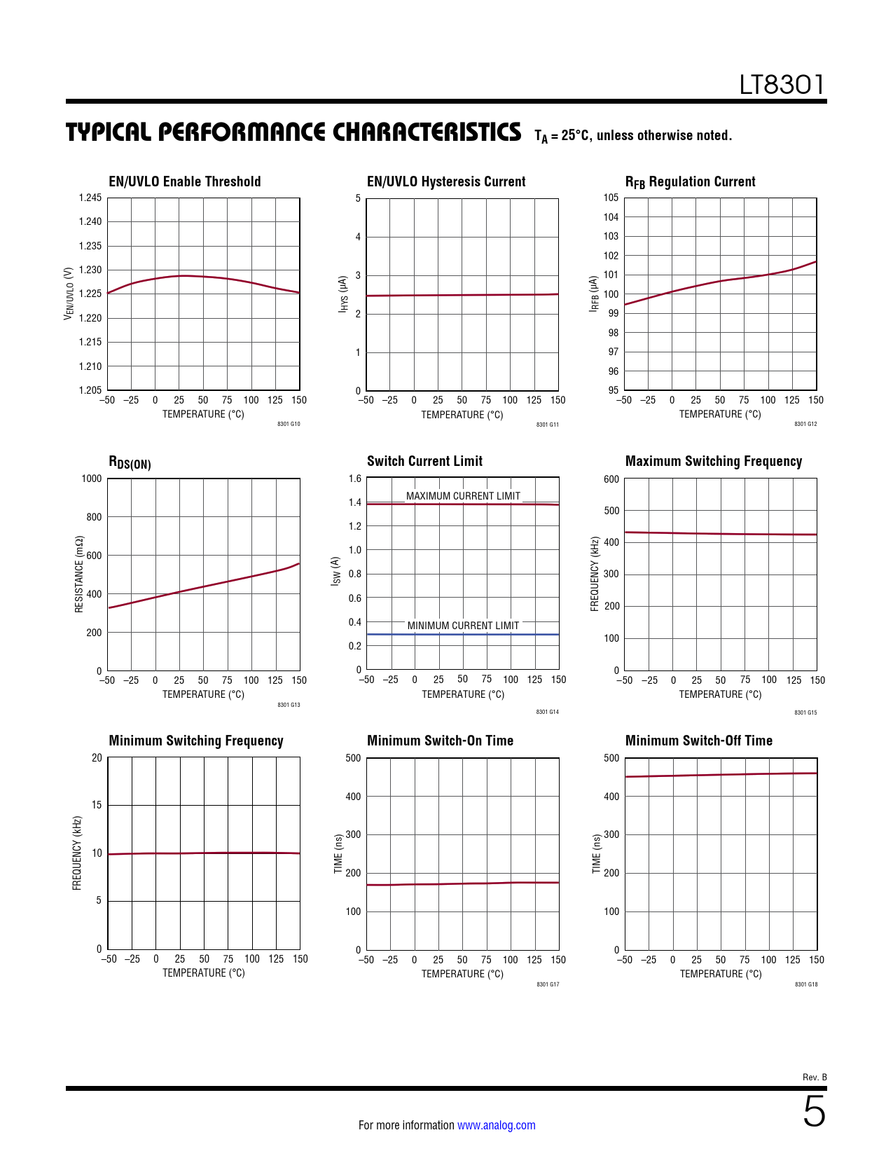 20 500 500 400 400 15 300 300 10 TIME (ns) 200 TIME (ns) 200 FREQUENCY (kHz) 5 100 100 0 0 0 –50 –25 0 25 50 75 100 125 150 –50 –25 0 25 50 75 100 125 150 –50 –25 0 25 50 75 100 125 150 TEMPERATURE (°C) TEMPERATURE (°C) TEMPERATURE (°C) 8301 G17 8301 G18 8301 G16 Rev. B For more information www.analog.com 5 Document Outline Features Applications Typical Application Description Absolute Maximum Ratings Order Information Pin Configuration Electrical Characteristics Typical Performance Characteristics Pin Functions Block Diagram Operation Applications Information Typical Applications Package Description Revision History Typical Application Related Parts