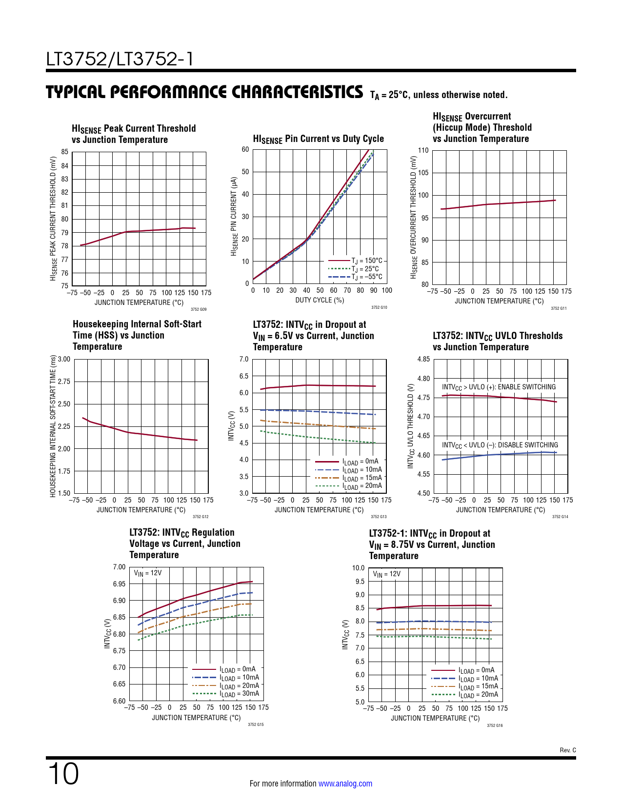 Housekeeping Internal Soft-Start LT3752: INTVCC in Dropout at Time (HSS) vs Junction VIN = 6.5V vs Current, Junction LT3752: INTVCC UVLO Thresholds Temperature Temperature vs Junction Temperature