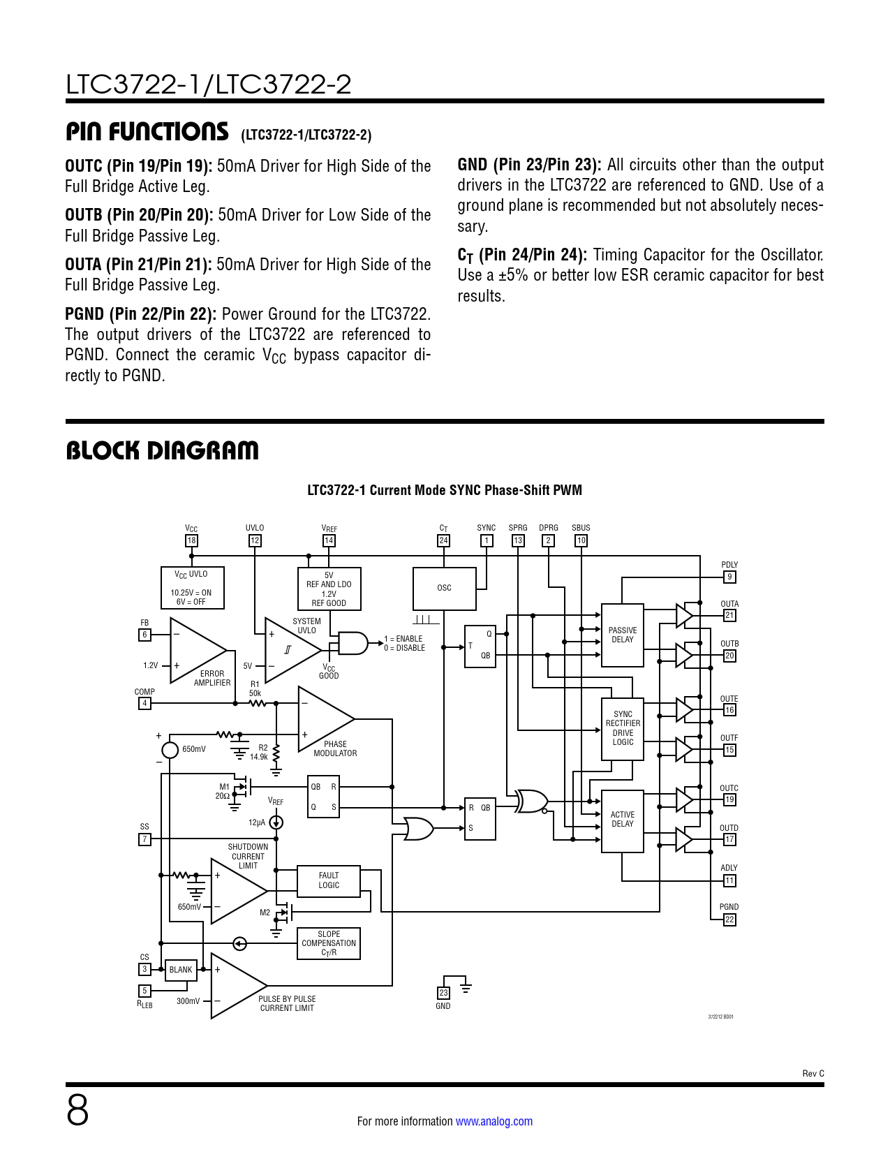 LTC3722-1/LTC3722-2 PIN FUNCTIONS (LTC3722-1/LTC3722-2)OUTC (Pin 19/Pin 19): 50mA Driver for High Side of the GND (Pin 23/Pin 23): All circuits other than the output Full Bridge Active Leg. drivers in the LTC3722 are referenced to GND. Use of a OUTB (Pin 20/Pin 20): 50mA Driver for Low Side of the ground plane is recommended but not absolutely neces- Full Bridge Passive Leg. sary. OUTA (Pin 21/Pin 21): 50mA Driver for High Side of the CT (Pin 24/Pin 24): Timing Capacitor for the Oscillator. Full Bridge Passive Leg. Use a ±5% or better low ESR ceramic capacitor for best results. PGND (Pin 22/Pin 22): Power Ground for the LTC3722. The output drivers of the LTC3722 are referenced to PGND. Connect the ceramic VCC bypass capacitor di- rectly to PGND. BLOCK DIAGRAMLTC3722-1 Current Mode SYNC Phase-Shift PWM VCC UVLO VREF CT SYNC SPRG DPRG SBUS 18 12 14 24 1 13 2 10 PDLY VCC UVLO 5V 9 REF AND LDO OSC 10.25V = ON 1.2V 6V = OFF REF GOOD OUTA 21 FB – + SYSTEM 6 UVLO PASSIVE Q 1 = ENABLE DELAY OUTB 0 = DISABLE T + – QB 20 1.2V 5V V ERROR CC GOOD AMPLIFIER R1 COMP 50k – OUTE 4 16 SYNC + RECTIFIER + DRIVE OUTF PHASE LOGIC 650mV R2 15 14.9k MODULATOR – M1 QB R OUTC 20Ω V 19 REF Q S R QB ACTIVE SS 12µA S DELAY OUTD 7 17 SHUTDOWN CURRENT LIMIT ADLY + FAULT 11 LOGIC 650mV – PGND M2 22 SLOPE COMPENSATION CT/R CS 3 BLANK + 5 23 R 300mV – PULSE BY PULSE LEB CURRENT LIMIT GND 372212 BD01 Rev C 8 For more information www.analog.com Document Outline Features Applications Description Typical Application Absolute Maximum Ratings Pin Configuration Order Information Electrical Characteristics Typical Performance Characteristics Pin Functions Block Diagram Timing Diagram Operation Revision History Typical application Related Parts