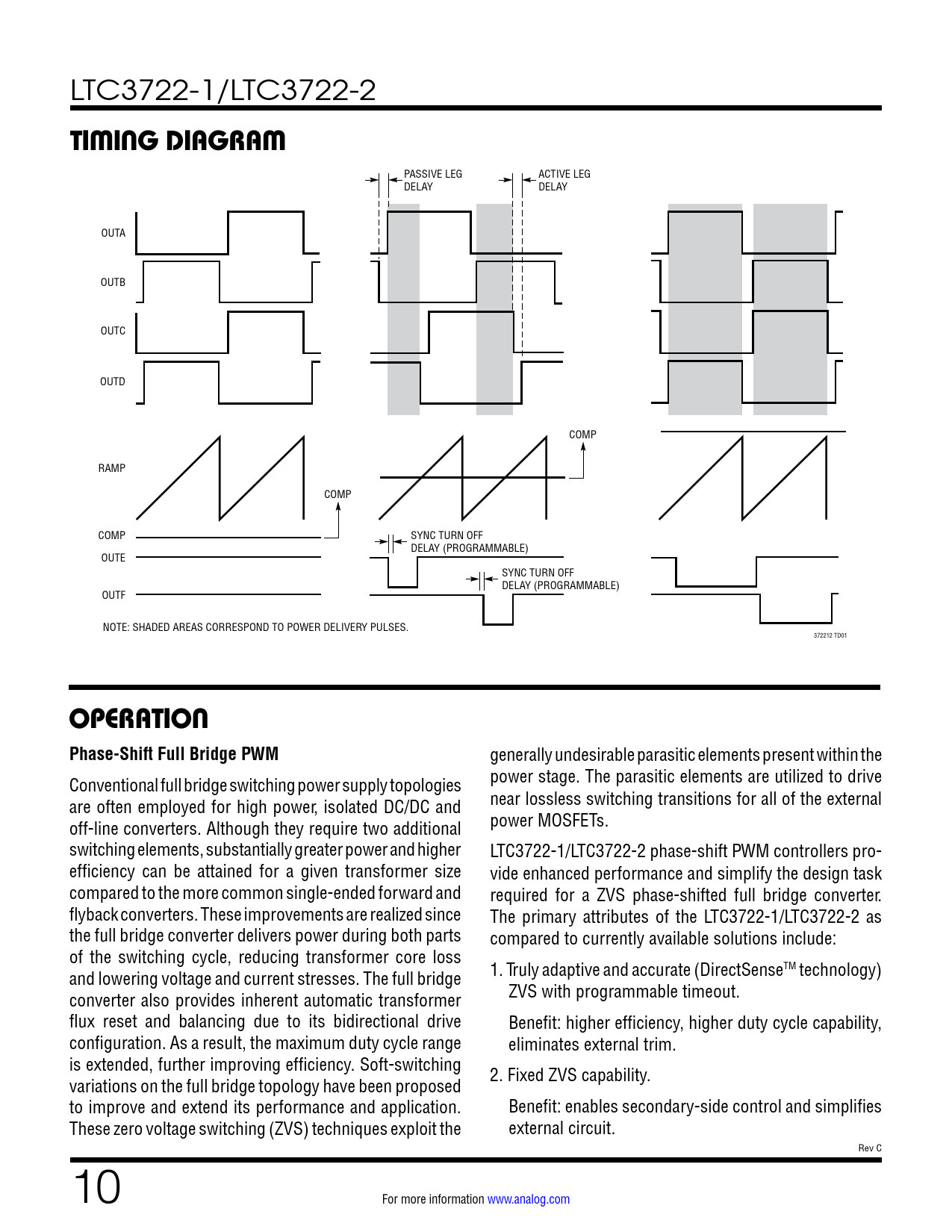 LTC3722-1/LTC3722-2 TIMING DIAGRAM PASSIVE LEG ACTIVE LEG DELAY DELAY OUTA OUTB OUTC OUTD COMP RAMP COMP COMP SYNC TURN OFF DELAY (PROGRAMMABLE) OUTE SYNC TURN OFF DELAY (PROGRAMMABLE) OUTF NOTE: SHADED AREAS CORRESPOND TO POWER DELIVERY PULSES. 372212 TD01 OPERATIONPhase-Shift Full Bridge PWM generally undesirable parasitic elements present within the Conventional full bridge switching power supply topologies power stage. The parasitic elements are utilized to drive are often employed for high power, isolated DC/DC and near lossless switching transitions for all of the external off-line converters. Although they require two additional power MOSFETs. switching elements, substantially greater power and higher LTC3722-1/LTC3722-2 phase-shift PWM controllers pro- efficiency can be attained for a given transformer size vide enhanced performance and simplify the design task compared to the more common single-ended forward and required for a ZVS phase-shifted full bridge converter. flyback converters. These improvements are realized since The primary attributes of the LTC3722-1/LTC3722-2 as the full bridge converter delivers power during both parts compared to currently available solutions include: of the switching cycle, reducing transformer core loss and lowering voltage and current stresses. The full bridge 1. Truly adaptive and accurate (DirectSenseTM technology) converter also provides inherent automatic transformer ZVS with programmable timeout. flux reset and balancing due to its bidirectional drive Benefit: higher efficiency, higher duty cycle capability, configuration. As a result, the maximum duty cycle range eliminates external trim. is extended, further improving efficiency. Soft-switching variations on the full bridge topology have been proposed 2. Fixed ZVS capability. to improve and extend its performance and application. Benefit: enables secondary-side control and simplifies These zero voltage switching (ZVS) techniques exploit the external circuit. Rev C 10 For more information www.analog.com Document Outline Features Applications Description Typical Application Absolute Maximum Ratings Pin Configuration Order Information Electrical Characteristics Typical Performance Characteristics Pin Functions Block Diagram Timing Diagram Operation Revision History Typical application Related Parts
