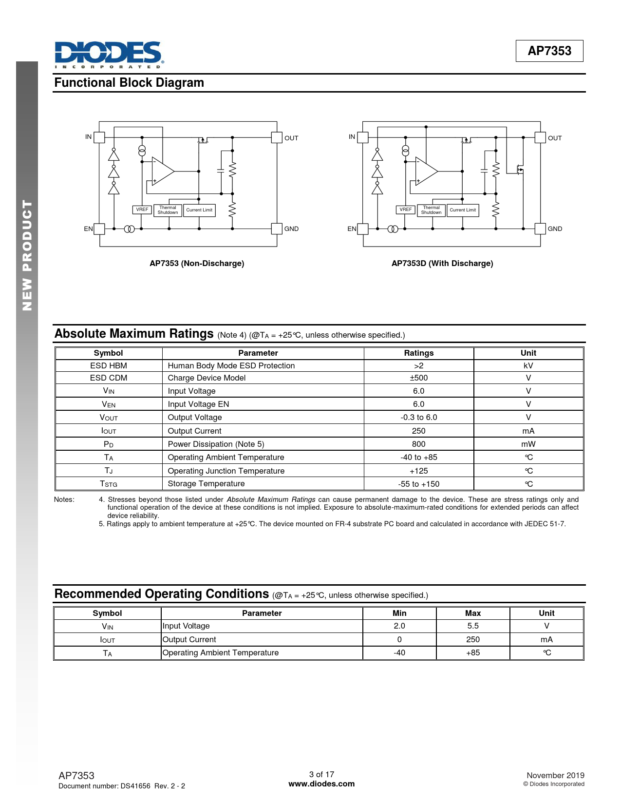VIN Input Voltage 2.0 5.5 V IOUT Output Current 0 250 mA TA Operating Ambient Temperature -40 +85 °C AP7353 3 of 17 November 2019 Document number: DS41656 Rev. 2 - 2