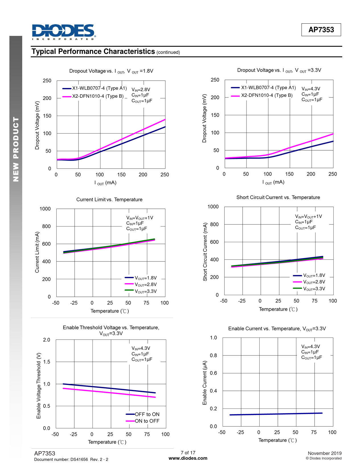 V V IN=VOUT+1V IN=VOUT+1V C C IN=1μF IN=1μF C C OUT=1μF OUT=1μF V V OUT=1.8V OUT=1.8V V V OUT=2.8V OUT=2.8V V V OUT=3.3V OUT=3.3V V VIN=4.3V IN=4.3V CIN=1μF CIN=1μF COUT=1μF COUT=1μF AP7353 7 of 17 November 2019 Document number: DS41656 Rev. 2 - 2