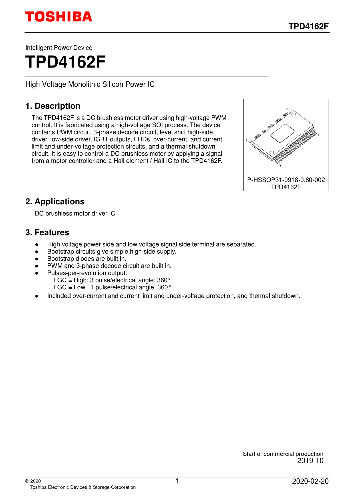 ● High voltage power side and low voltage signal side terminal are separated. ● Bootstrap circuits give simple high-side supply. ● Bootstrap diodes are built in. ● PWM and 3-phase decode circuit are built in. ● Pulses-per-revolution output: FGC = High: 3 pulse/electrical angle: 360° FGC = Low : 1 pulse/electrical angle: 360° ● Included over-current and current limit and under-voltage protection, and thermal shutdown. Start of commercial production 2019-10 © 2 020 1 2020-02-20 Toshiba Electronic Devices & Storage Corporation