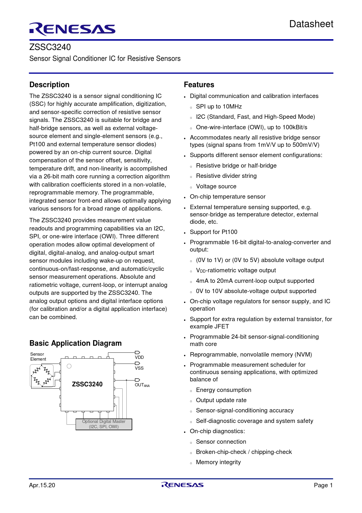 Datasheet ZSSC3240 Sensor Signal Conditioner IC for Resistive Sensors DescriptionFeatures The ZSSC3240 is a sensor signal conditioning IC • Digital communication and calibration interfaces (SSC) for highly accurate amplification, digitization, o SPI up to 10MHz and sensor-specific correction of resistive sensor signals. The ZSSC3240 is suitable for bridge and o I2C (Standard, Fast, and High-Speed Mode) half-bridge sensors, as well as external voltage- o One-wire-interface (OWI), up to 100kBit/s source element and single-element sensors (e.g., • Accommodates nearly all resistive bridge sensor Pt100 and external temperature sensor diodes) types (signal spans from 1mV/V up to 500mV/V) powered by an on-chip current source. Digital • Supports different sensor element configurations: compensation of the sensor offset, sensitivity, temperature drift, and non-linearity is accomplished o Resistive bridge or half-bridge via a 26-bit math core running a correction algorithm o Resistive divider string with calibration coefficients stored in a non-volatile, o Voltage source reprogrammable memory. The programmable, • On-chip temperature sensor integrated sensor front-end allows optimally applying various sensors for a broad range of applications. • External temperature sensing supported, e.g. sensor-bridge as temperature detector, external The ZSSC3240 provides measurement value diode, etc. readouts and programming capabilities via an I2C, • Support for Pt100 SPI, or one-wire interface (OWI). Three different operation modes allow optimal development of • Programmable 16-bit digital-to-analog-converter and output: digital, digital-analog, and analog-output smart sensor modules including wake-up on request, o (0V to 1V) or (0V to 5V) absolute voltage output continuous-on/fast-response, and automatic/cyclic o VDD-ratiometric voltage output sensor measurement operations. Absolute and o 4mA to 20mA current-loop output supported ratiometric voltage, current-loop, or interrupt analog outputs are supported by the ZSSC3240. The o 0V to 10V absolute-voltage output supported analog output options and digital interface options • On-chip voltage regulators for sensor supply, and IC (for calibration and/or a digital application interface) operation can be combined. • Support for extra regulation by external transistor, for example JFET • Programmable 24-bit sensor-signal-conditioning Basic Application Diagram math core Sensor • Reprogrammable, nonvolatile memory (NVM) VDD Element • Programmable measurement scheduler for VSS continuous sensing applications, with optimized balance of ZSSC3240 OUTANA o Energy consumption o Output update rate o Sensor-signal-conditioning accuracy Optional Digital Master o Self-diagnostic coverage and system safety (I2C, SPI, OWI) • On-chip diagnostics: o Sensor connection o Broken-chip-check / chipping-check o Memory integrity Apr.15.20 Page 1 Document Outline 1. Pin Assignments 2. Pin Descriptions 3. Absolute Maximum Ratings 4. Recommended Operating Conditions 5. Electrical Characteristics 6. Device Description 6.1 Signal Flow 6.2 Analog (Sensor) Front-End 6.2.1. Programmable-Gain Amplifier (PGA) 6.2.2. Analog-to-Digital Converter (ADC) 6.2.3. Internal Temperature Sensor 6.2.4. Supported Supplies for Sensor Elements and Additional, External Temperature Sensing 6.3 On-Chip Diagnostics 6.4 Digital Interfaces 6.4.1. SPI 6.4.2. I2C 6.4.3. One-Wire-Interface, OWI 6.5 Measurement and Output Options 6.5.1. Single Measurements, Digital Raw Results, and SSC Results 6.5.2. Cyclic, Continuous, Repeated Measurements – Measurement Scheduler 6.5.3. Analog Outputs: Digital-to-Analog Converter (DAC) 6.5.4. Output Interrupt Signaling 6.6 System Setup and Control 6.6.1. Digital Commands 6.6.2. Nonvolatile Memory (NVM) 6.6.3. Digital Sensor-Signal-Conditioning Mathematics 6.7 External, Extra LDO (LDOctrl) for Applications for > 5.5V 7. Calibration 8. Package Outline Drawings 9. Marking Diagram 10. Ordering Information 11. Glossary 12. Revision History