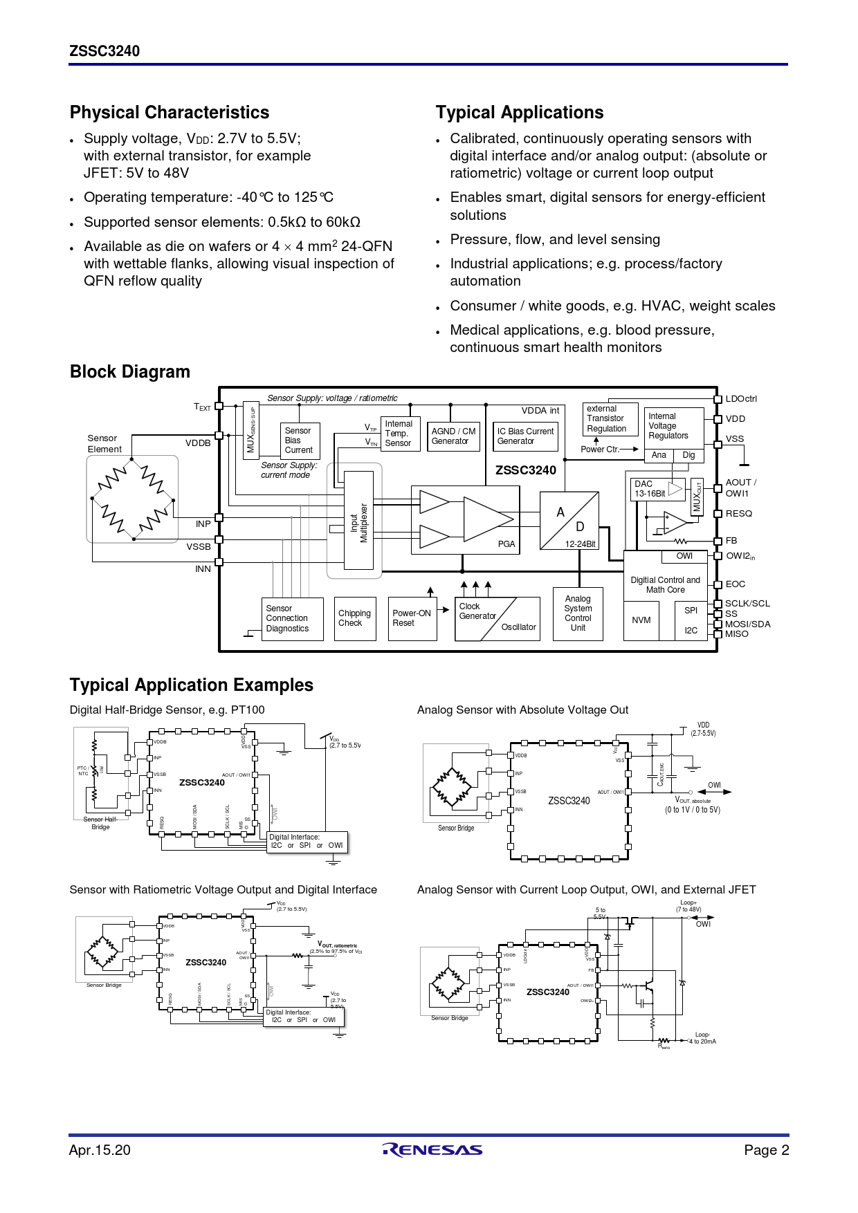 Pages / Page64 / 2 — ZSSC3240. Physical Characteristics. Typical Applications. Block Diagram. …