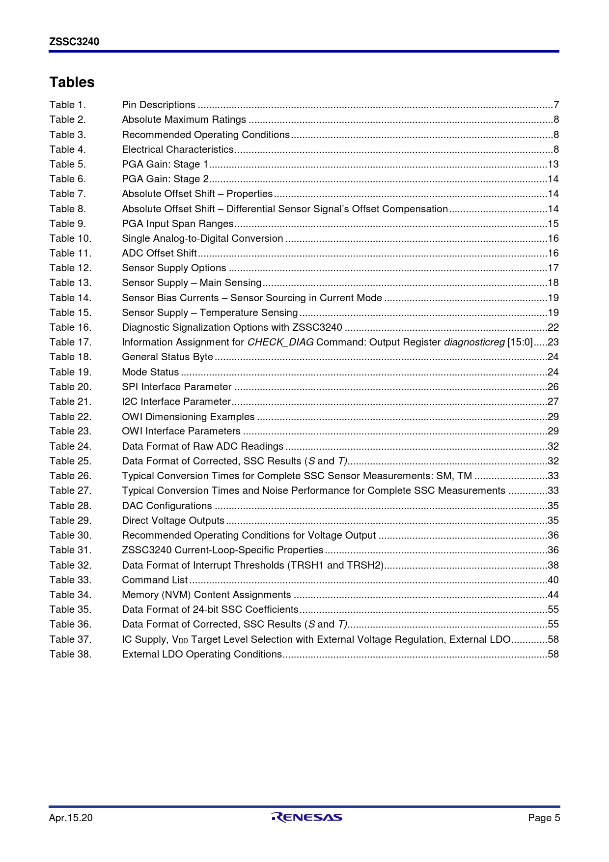 link to page 7 link to page 8 link to page 8 link to page 8 link to page 13 link to page 14 link to page 14 link to page 14 link to page 15 link to page 16 link to page 16 link to page 17 link to page 18 link to page 19 link to page 19 link to page 22 link to page 23 link to page 24 link to page 24 link to page 26 link to page 27 link to page 29 link to page 29 link to page 32 link to page 32 link to page 33 link to page 33 link to page 35 link to page 35 link to page 36 link to page 36 link to page 38 link to page 40 link to page 44 link to page 55 link to page 55 link to page 58 link to page 58 ZSSC3240Tables Table 1. Pin Descriptions .. 7 Table 2. Absolute Maximum Ratings .. 8 Table 3. Recommended Operating Conditions ... 8 Table 4. Electrical Characteristics ... 8 Table 5. PGA Gain: Stage 1..13 Table 6. PGA Gain: Stage 2..14 Table 7. Absolute Offset Shift – Properties ...14 Table 8. Absolute Offset Shift – Differential Sensor Signal’s Offset Compensation ...14 Table 9. PGA Input Span Ranges ...15 Table 10. Single Analog-to-Digital Conversion ...16 Table 11. ADC Offset Shift ..16 Table 12. Sensor Supply Options ...17 Table 13. Sensor Supply – Main Sensing ...18 Table 14. Sensor Bias Currents – Sensor Sourcing in Current Mode ..19 Table 15. Sensor Supply – Temperature Sensing ..19 Table 16. Diagnostic Signalization Options with ZSSC3240 ..22 Table 17. Information Assignment for CHECK_DIAG Command: Output Register diagnosticreg [15:0] ...23 Table 18. General Status Byte ..24 Table 19. Mode Status ..24 Table 20. SPI Interface Parameter ...26 Table 21. I2C Interface Parameter ..27 Table 22. OWI Dimensioning Examples ...29 Table 23. OWI Interface Parameters ..29 Table 24. Data Format of Raw ADC Readings ...32 Table 25. Data Format of Corrected, SSC Results (S and T) ...32 Table 26. Typical Conversion Times for Complete SSC Sensor Measurements: SM, TM ..33 Table 27. Typical Conversion Times and Noise Performance for Complete SSC Measurements ..33 Table 28. DAC Configurations ..35 Table 29. Direct Voltage Outputs ..35 Table 30. Recommended Operating Conditions for Voltage Output ..36 Table 31. ZSSC3240 Current-Loop-Specific Properties ...36 Table 32. Data Format of Interrupt Thresholds (TRSH1 and TRSH2)..38 Table 33. Command List ...40 Table 34. Memory (NVM) Content Assignments ..44 Table 35. Data Format of 24-bit SSC Coefficients ..55 Table 36. Data Format of Corrected, SSC Results (S and T) ...55 Table 37. IC Supply, VDD Target Level Selection with External Voltage Regulation, External LDO ...58 Table 38. External LDO Operating Conditions ..58 Apr.15.20 Page 5 Document Outline 1. Pin Assignments 2. Pin Descriptions 3. Absolute Maximum Ratings 4. Recommended Operating Conditions 5. Electrical Characteristics 6. Device Description 6.1 Signal Flow 6.2 Analog (Sensor) Front-End 6.2.1. Programmable-Gain Amplifier (PGA) 6.2.2. Analog-to-Digital Converter (ADC) 6.2.3. Internal Temperature Sensor 6.2.4. Supported Supplies for Sensor Elements and Additional, External Temperature Sensing 6.3 On-Chip Diagnostics 6.4 Digital Interfaces 6.4.1. SPI 6.4.2. I2C 6.4.3. One-Wire-Interface, OWI 6.5 Measurement and Output Options 6.5.1. Single Measurements, Digital Raw Results, and SSC Results 6.5.2. Cyclic, Continuous, Repeated Measurements – Measurement Scheduler 6.5.3. Analog Outputs: Digital-to-Analog Converter (DAC) 6.5.4. Output Interrupt Signaling 6.6 System Setup and Control 6.6.1. Digital Commands 6.6.2. Nonvolatile Memory (NVM) 6.6.3. Digital Sensor-Signal-Conditioning Mathematics 6.7 External, Extra LDO (LDOctrl) for Applications for > 5.5V 7. Calibration 8. Package Outline Drawings 9. Marking Diagram 10. Ordering Information 11. Glossary 12. Revision History