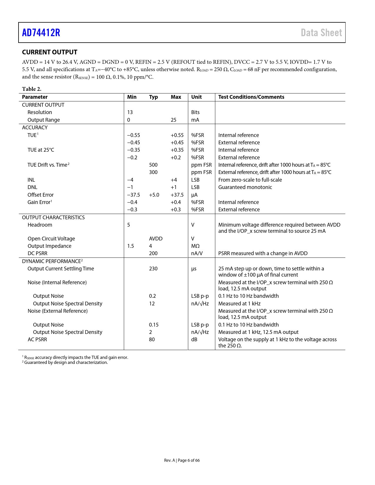 AD74412RData SheetCURRENT OUTPUT AVDD = 14 V to 26.4 V, AGND = DGND = 0 V, REFIN = 2.5 V (REFOUT tied to REFIN), DVCC = 2.7 V to 5.5 V, IOVDD= 1.7 V to 5.5 V, and all specifications at TA=−40°C to +85°C, unless otherwise noted. RLOAD = 250 Ω, CLOAD = 68 nF per recommended configuration, and the sense resistor (RSENSE) = 100 Ω, 0.1%, 10 ppm/°C. Table 2. ParameterMinTypMaxUnitTest Conditions/Comments CURRENT OUTPUT Resolution 13 Bits Output Range 0 25 mA ACCURACY TUE1 −0.55 +0.55 %FSR Internal reference −0.45 +0.45 %FSR External reference TUE at 25°C −0.35 +0.35 %FSR Internal reference −0.2 +0.2 %FSR External reference TUE Drift vs. Time2 500 ppm FSR Internal reference, drift after 1000 hours at TA = 85°C 300 ppm FSR External reference, drift after 1000 hours at TA = 85°C INL −4 +4 LSB From zero-scale to full-scale DNL −1 +1 LSB Guaranteed monotonic Offset Error −37.5 +5.0 +37.5 µA Gain Error1 −0.4 +0.4 %FSR Internal reference −0.3 +0.3 %FSR External reference OUTPUT CHARACTERISTICS Headroom 5 V Minimum voltage difference required between AVDD and the I/OP_x screw terminal to source 25 mA Open Circuit Voltage AVDD V Output Impedance 1.5 4 MΩ DC PSRR 200 nA/V PSRR measured with a change in AVDD DYNAMIC PERFORMANCE2 Output Current Settling Time 230 µs 25 mA step up or down, time to settle within a window of ±100 µA of final current Noise (Internal Reference) Measured at the I/OP_x screw terminal with 250 Ω load, 12.5 mA output Output Noise 0.2 LSB p-p 0.1 Hz to 10 Hz bandwidth Output Noise Spectral Density 12 nA/√Hz Measured at 1 kHz Noise (External Reference) Measured at the I/OP_x screw terminal with 250 Ω load, 12.5 mA output Output Noise 0.15 LSB p-p 0.1 Hz to 10 Hz bandwidth Output Noise Spectral Density 2 nA/√Hz Measured at 1 kHz, 12.5 mA output AC PSRR 80 dB Voltage on the supply at 1 kHz to the voltage across the 250 Ω. 1 RSENSE accuracy directly impacts the TUE and gain error. 2 Guaranteed by design and characterization. Rev. A | Page 6 of 66 Document Outline FEATURES APPLICATIONS GENERAL DESCRIPTION COMPANION PRODUCTS PRODUCT HIGHLIGHTS TABLE OF CONTENTS REVISION HISTORY FUNCTIONAL BLOCK DIAGRAM SPECIFICATIONS VOLTAGE OUTPUT CURRENT OUTPUT VOLTAGE INPUT CURRENT INPUT EXTERNALLY POWERED CURRENT INPUT LOOP POWERED RTD MEASUREMENT DIGITAL INPUT LOGIC DIGITAL INPUT LOOP POWERED ADC SPECIFICATIONS GENERAL SPECIFICATIONS TIMING CHARACTERISTICS SPI Timing Specifications Timing Diagrams ABSOLUTE MAXIMUM RATINGS THERMAL RESISTANCE ESD CAUTION PIN CONFIGURATION AND FUNCTION DESCRIPTIONS TYPICAL PERFORMANCE CHARACTERISTICS VOLTAGE OUTPUT CURRENT OUTPUT REFERENCE ADC SUPPLIES THEORY OF OPERATION ROBUST ARCHITECTURE SERIAL INTERFACE DAC ARCHITECTURE ADC OVERVIEW REFERENCE Reference Noise Charge Pump POWER-ON STATE OF THE AD74412R DEVICE FUNCTIONS High Impedance Interpreting ADC Data Voltage Output Mode Voltage Output Short-Circuit Protection Interpretin ADC Data Current Output Mode Current Output Open Circuit Detection Interpreting ADC Data Voltage Input Mode Selectable 200 kΩ to GND Interpreting ADC Data Current Input, Externally Powered Mode Short-Circuit Protection Interpreting ADC Data Current Input, Loop Powered Mode Short-Circuit Protection Interpreting ADC Data Resistance Measurement (External 2-Wire RTD) Interpreting ADC Data Digital Input Logic Interpreting ADC Data Digital Input Current Sink Digital Input Threshold Setting Debounce Function Debounce Mode 0 (Default) Debounce Mode 1 Digital Input Inverter DIGITAL INPUT, LOOP POWERED MODE Interpreting ADC Data GETTING STARTED USING CHANNEL FUNCTIONS Switching Channel Functions ADC FUNCTIONALITY ADC Conversion Rates ADC_RDYB Functionality ADC Output Data Format ADC Noise DIAGNOSTICS DACs LDAC Function Clear Code Function Digital Linear Slew Rate Control DRIVING INDUCTIVE LOADS RESET FUNCTION THERMAL ALERT AND THERMAL RESET FAULTS AND ALERTS Channel Faults POWER SUPPLY MONITORS GPO_x PINS SPI INTERFACE AND DIAGNOSTICS SPI CRC SPI Interface SCLK Count Feature Readback Mode Streaming Mode Auto Readback BOARD DESIGN AND LAYOUT CONSIDERATIONS APPLICATIONS INFORMATION REGISTER MAP NOP REGISTER FUNCTION SETUP REGISTER PER CHANNEL ADC CONFIGURATION REGISTER PER CHANNEL DIGITAL INPUT CONFIGURATION REGISTER PER CHANNEL GPO PARALLEL DATA REGISTER GPO CONFIGURATION REGISTER PER CHANNEL OUTPUT CONFIGURATION REGISTER PER CHANNEL DAC CODE REGISTER PER CHANNEL DAC CLEAR CODE REGISTER PER CHANNEL DAC ACTIVE CODE REGISTER PER CHANNEL DIGITAL INPUT THRESHOLD REGISTER ADC CONVERSION CONTROL REGISTER DIAGNOSTICS SELECT REGISTER DIGITAL OUTPUT LEVEL REGISTER ADC CONVERSION RESULTS REGISTER PER CHANNEL DIAGNOSTIC RESULTS REGISTERS PER DIAGNOSTIC CHANNEL ALERT STATUS REGISTER LIVE STATUS REGISTER ALERT MASK REGISTER READBACK SELECT REGISTER 80 SPS ADC CONVERSION CONTROL REGISTER THERMAL RESET ENABLE REGISTER COMMAND REGISTER SCRATCH OR SPARE REGISTER SILICON REVISION REGISTER OUTLINE DIMENSIONS ORDERING GUIDE