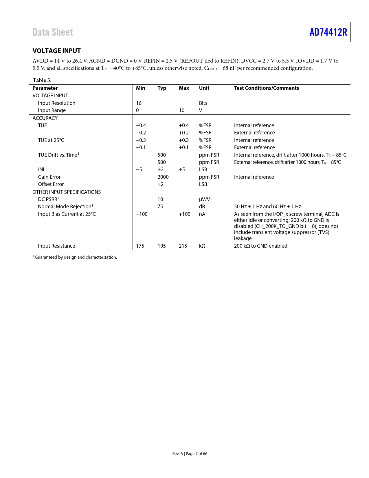 Data Sheet. AD74412R. VOLTAGE INPUT. Table 3. Parameter. Min. Typ. Max. Unit. Test Conditions/Comments